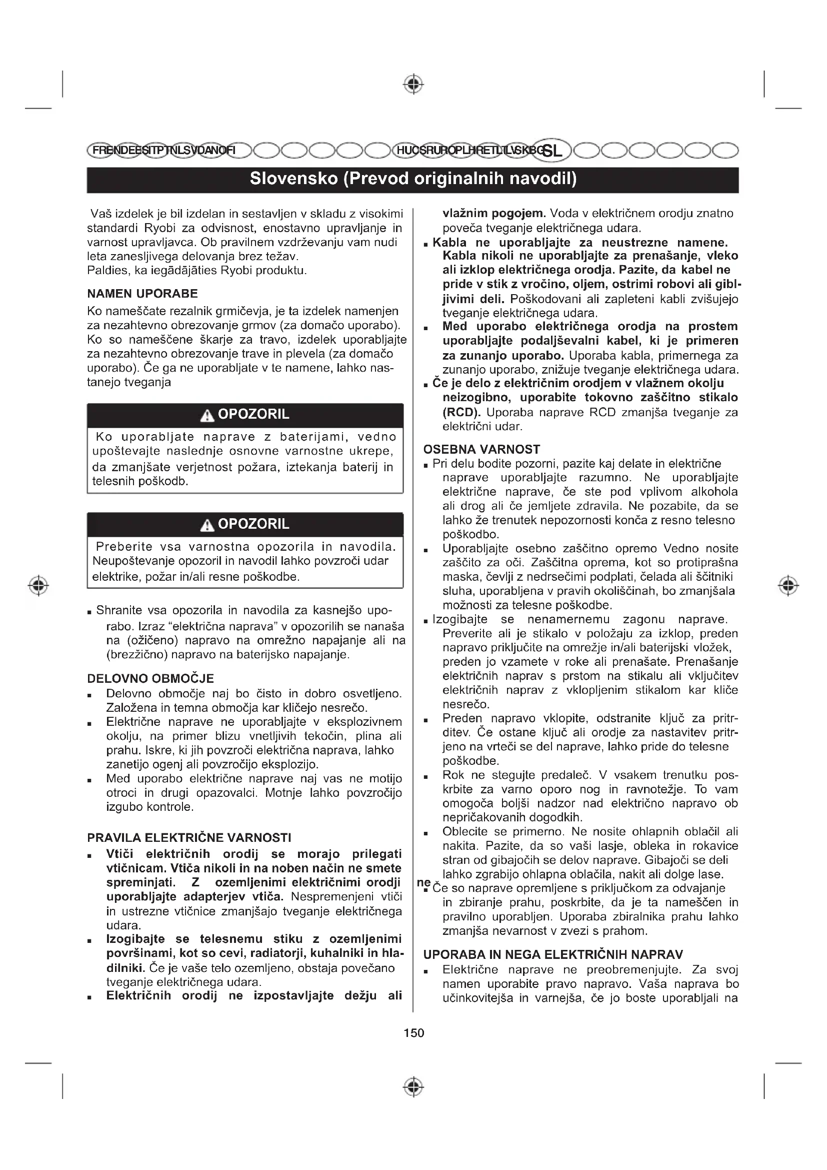 HU CS RU RO PL HR ET LT LV SK BG Vaš izdelek je bil izdelan in sestavljen v skladu z visokimi standardi Ryobi za odvisnost, enostavno upravljanje in varnost upravljavca. Ob pravilnem vzdrževanju vam nudi leta zanesljivega delovanja brez težav. Paldies, ka iegādājāties Ryobi produktu. NAMEN UPORABE Ko nameščate rezalnik grmičevja, je ta izdelek namenjen za nezahtevno obrezovanje grmov (za domačo uporabo). Ko so nameščene škarje za travo, izdelek uporabljajte za nezahtevno obrezovanje trave in plevela (za domačo uporabo). Če ga ne uporabljate v te namene, lahko nas- tanejo tveganja OPOZORIL Ko uporabljate naprave z baterijami, vedno upoštevajte naslednje osnovne varnostne ukrepe, da zmanjšate verjetnost požara, iztekanja baterij in telesnih poškodb. OPOZORIL Preberite vsa varnostna opozorila in navodila. Neupoštevanje opozoril in navodil lahko povzroči udar elektrike, požar in/ali resne poškodbe. ■ Shranite vsa opozorila in navodila za kasnejšo upo- rabo. Izraz “električna naprava” v opozorilih se nanaša na (ožičeno) napravo na omrežno napajanje ali na (brezžično) napravo na baterijsko napajanje. '(/29122%02ý-( ■ Delovno območje naj bo čisto in dobro osvetljeno. Založena in temna območja kar kličejo nesrečo. ■ Električne naprave ne uporabljajte v eksplozivnem okolju, na primer blizu vnetljivih tekočin, plina ali prahu. Iskre, ki jih povzroči električna naprava, lahko zanetijo ogenj ali povzročijo eksplozijo. ■ Med uporabo električne naprave naj vas ne motijo otroci in drugi opazovalci. Motnje lahko povzročijo izgubo kontrole. 35$9,/$(/(.75,ý1(9$51267, ■ 9WLþL HOHNWULþQLK RURGLM VH PRUDMR SULOHJDWL YWLþQLFDP9WLþDQLNROLLQQDQREHQQDþLQQHVPHWH VSUHPLQMDWL = R]HPOMHQLPL HOHNWULþQLPL RURGML QH XSRUDEOMDMWH DGDSWHUMHY YWLþD Nespremenjeni vtiči in ustrezne vtičnice zmanjšajo tveganje električnega udara.