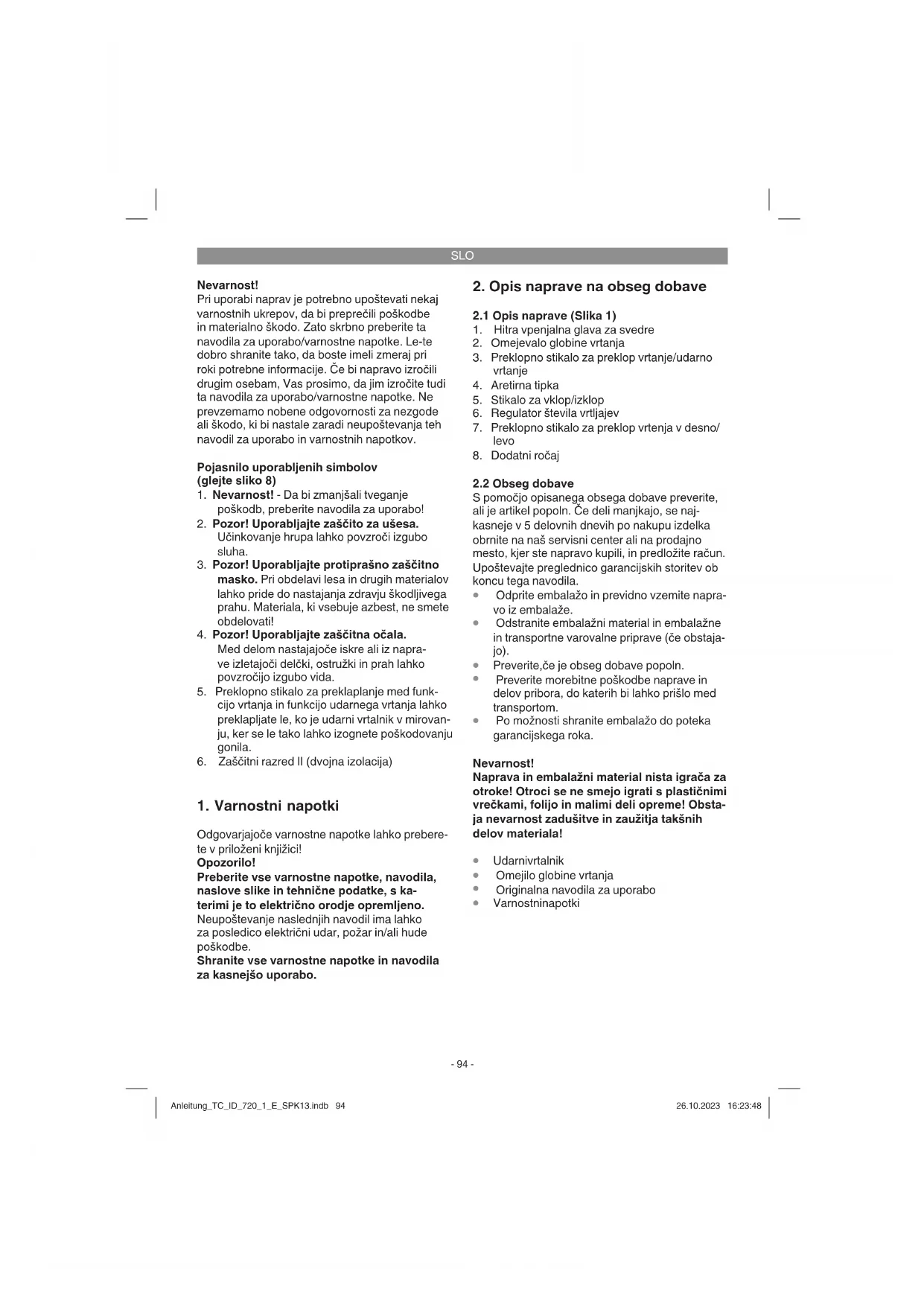 Odgovarjajoče varnostne napotke lahko prebere- te v priloženi knjižici! Opozorilo! Preberite vse varnostne napotke, navodila, naslove slike in tehnične podatke, s ka- terimi je to električno orodje opremljeno. Neupoštevanje naslednjih navodil ima lahko za posledico električni udar, požar in/ali hude poškodbe. Shranite vse varnostne napotke in navodila za kasnejšo uporabo.