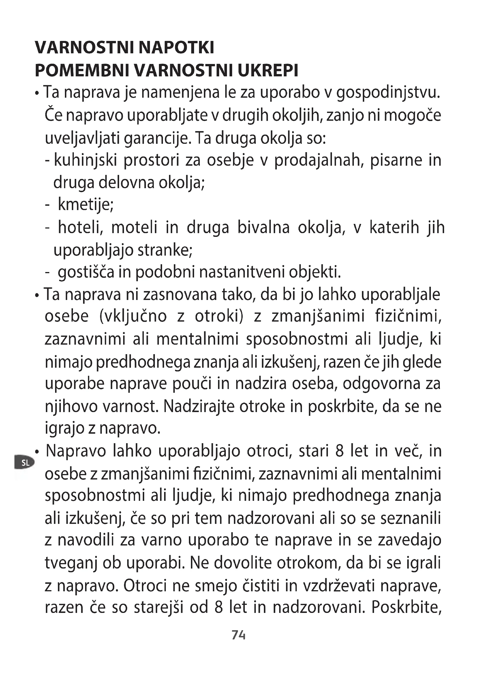 - Napravo lahko uporabljajo otroci, stari 8 let in več, in osebe z zmanjšanimi zičnimi, zaznavnimi ali mentalnimi sposobnostmi ali ljudje, ki nimajo predhodnega znanja ali izkušenj, če so pri tem nadzorovani ali so se seznanili z navodili za varno uporabo te naprave in se zavedajo tveganj ob uporabi. Ne dovolite otrokom, da bi se igrali z napravo. Otroci ne smejo čistiti in vzdrževati naprave, razen če so starejši od 8 let in nadzorovani. Poskrbite, SL75 da naprava in napajalni kabel ne bosta v dosegu otrok, mlajših od 8 let.