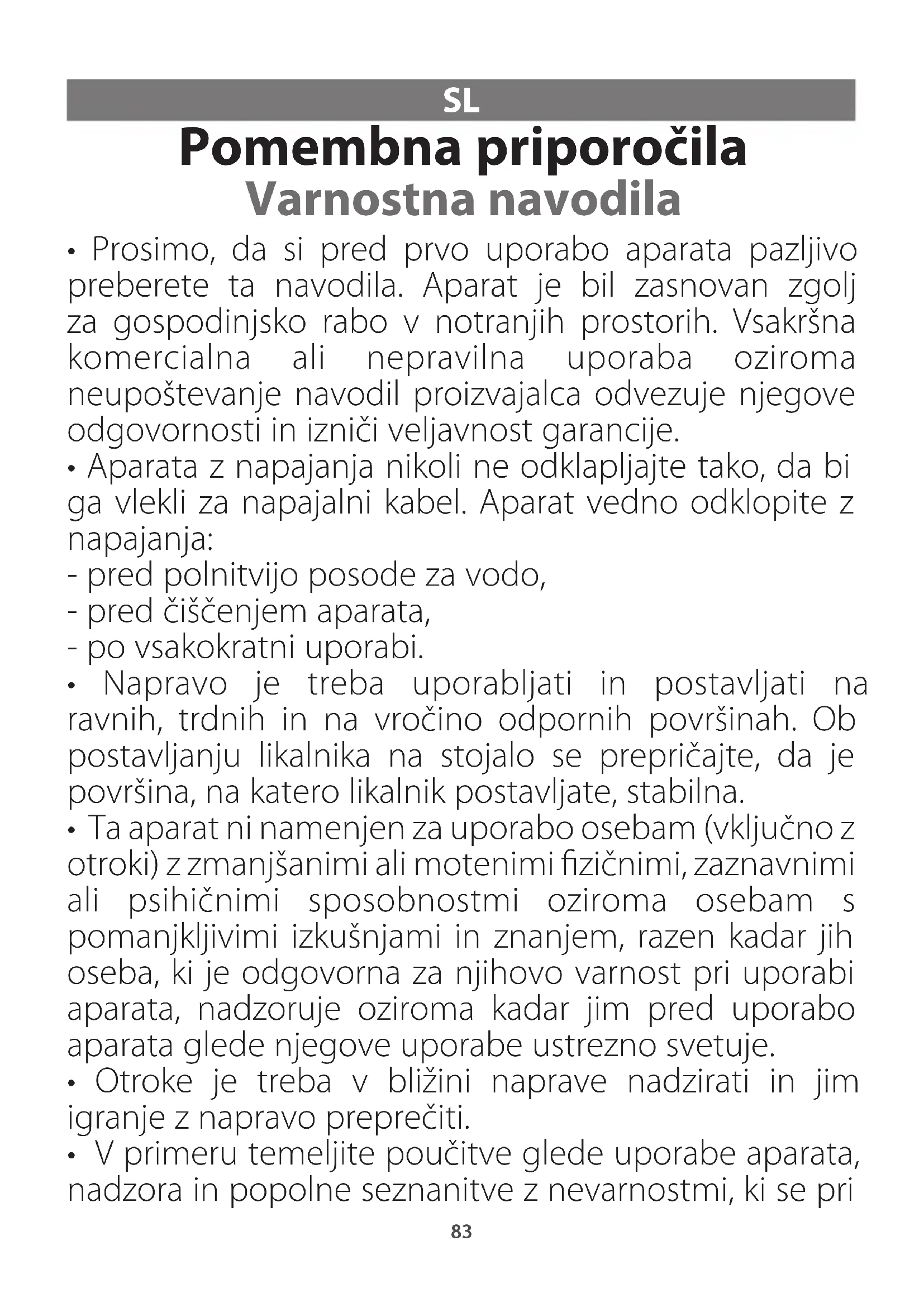 - Prosimo, da si pred prvo uporabo aparata pazljivo preberete ta navodila. Aparat je bil zasnovan zgolj za gospodinjsko rabo v notranjih prostorih. Vsakršna komercialna ali nepravilna uporaba oziroma neupoštevanje navodil proizvajalca odvezuje njegove odgovornosti in izniči veljavnost garancije.