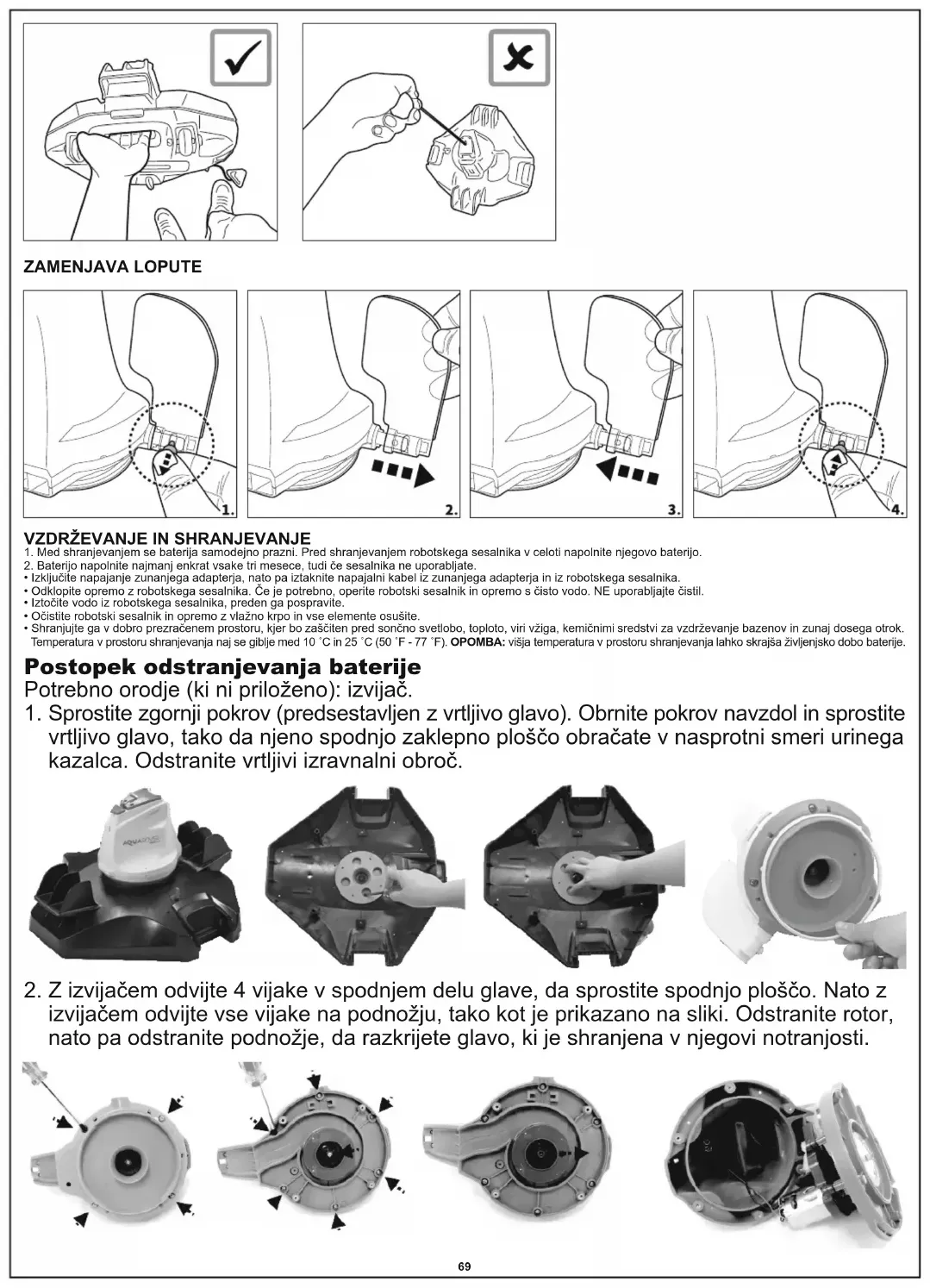 - Baterijo varno in ustrezno zavrzite. OPOZORILO! - Ta robot je zasnovan samo za uporabo pod vodo; to ni večnamenski sesalnik. NIKOLI NE poskušajte uporabljati robota za čiščenje česarkoli drugega, temveč vedno samo za vaš bazen. - Uporabljajte samo originalen pribor, ki je dobavljen skupaj s tem izdelkom. - NIKOLI NE uporabljajte tega robota neposredno po stresanju bazena. Priporočljivo je, da najprej pustite bazen cirkulirati najmanj 24-48 ur. - Če nameravate robota uporabiti v bazenu s sladko vodo, se prepričajte, če se je vsa sol raztopila, preden ga položite v vodo. - Priporočamo, da tega robota nikoli ne uporabljate istočasno z drugim avtomatskim čistilcem/sesalnikom. - Izogibajte se pobiranju trdih in ostrih predmetov s tem robotom, saj taki predmeti lahko povzročijo poškodbe robota in filtra. - Da bi se izognili poškodovanju zunanjega adapterja in podstavka za polnjenje, robota nikoli ne poskušajte prenašati za kabel zunanjega adapterja in nikoli ne vlecite za kabel, da bi ga iztaknili iz vira napajanja in iz podstavka za polnjenje. - Polnjenje robota je treba izvajati v zaprtih prostorih, v čistem in suhem prostoru z dobrim prezračevanjem in odmaknjeno od sončne svetlobe. - NIKOLI NE pustite robota polniti več kot 10 ur. - Če robota ne nameravate uporabljati daljši čas, ga ločite od podstavka za polnjenje in z vlažno krpo očistite in osušite površino robota in njegov pribor. Preden robota shranite, poskrbite za to, da ga napolnite na približno 30% do 50% kapacitete baterije. Shranite robota v dobro prezračevan prostor, ki je odmaknjen od sončne svetlobe, vročine, virov vžiga, kemikalij za bazen in otrok. Poskrbite za ponovno polnjenje robota na vsake tri mesece. - Vse aktivnosti, povezane z razstavljanjem vrtljive glave (npr. odstranitev baterije) sme izvajati samo pooblaščen tehnik. Zgoraj zapisana svarila in opozorila ne zajemajo vseh možnih primerov za nevarnosti in/ali hude poškodbe. Lastniki bazenov / masažnih bazenov morajo biti pri uporabi tega izdelka vedno še posebej previdni in morajo ravnati po splošnem občutku. SHRANITE TA NAVODILA!
