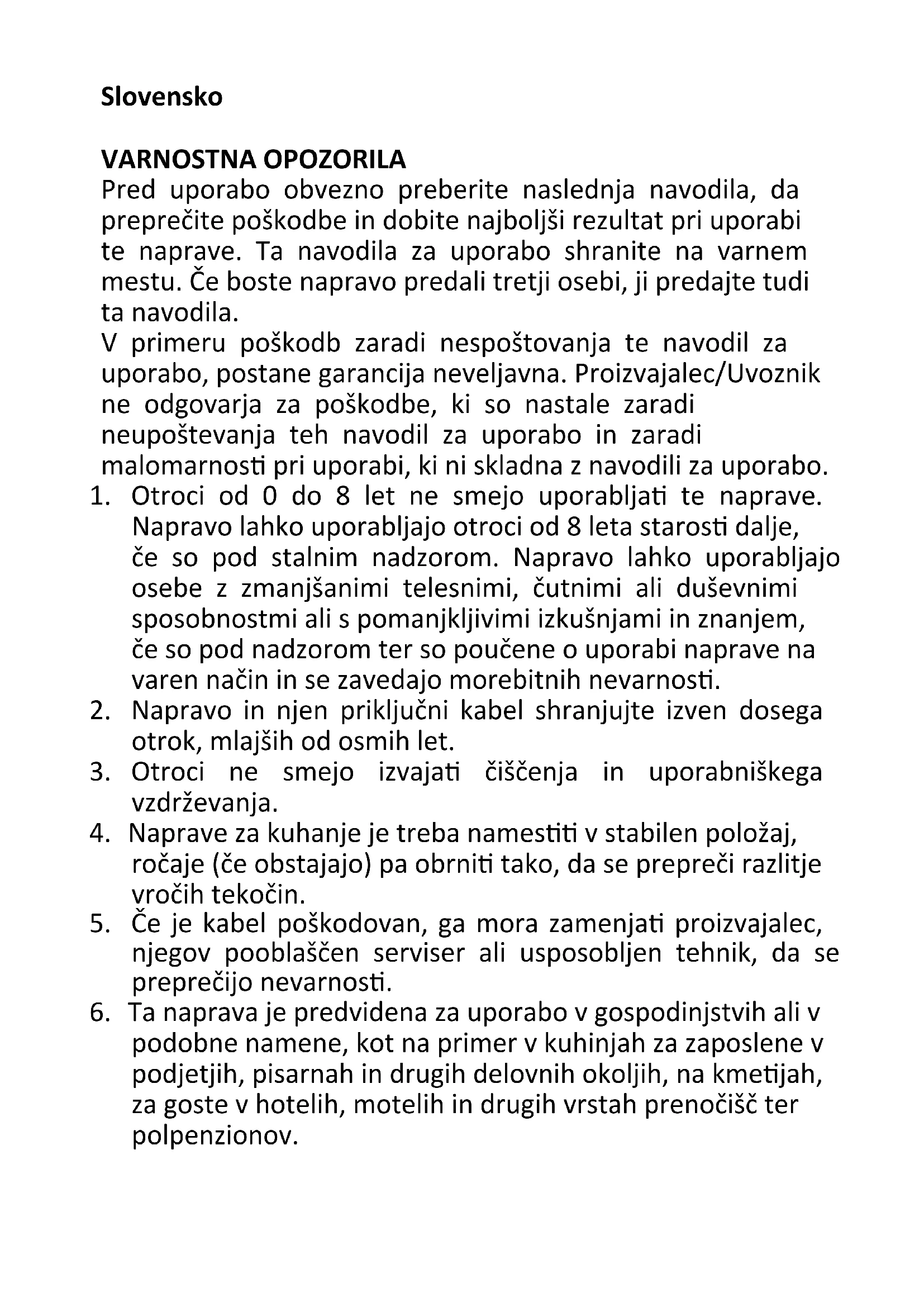 Älä koske kuumiin pintoihin käytön aikana. Kosketuspintojen lämpötila voi olla korkea laitteen toimiessa.Slovensko VARNOSTNA OPOZORILA Pred uporabo obvezno preberite naslednja navodila, da preprečite poškodbe in dobite najboljši rezultat pri uporabi te naprave. Ta navodila za uporabo shranite na varnem mestu. Če boste napravo predali tretji osebi, ji predajte tudi ta navodila. V primeru poškodb zaradi nespoštovanja te navodil za uporabo, postane garancija neveljavna. Proizvajalec/Uvoznik ne odgovarja za poškodbe, ki so nastale zaradi neupoštevanja teh navodil za uporabo in zaradi malomarnosti pri uporabi, ki ni skladna z navodili za uporabo.