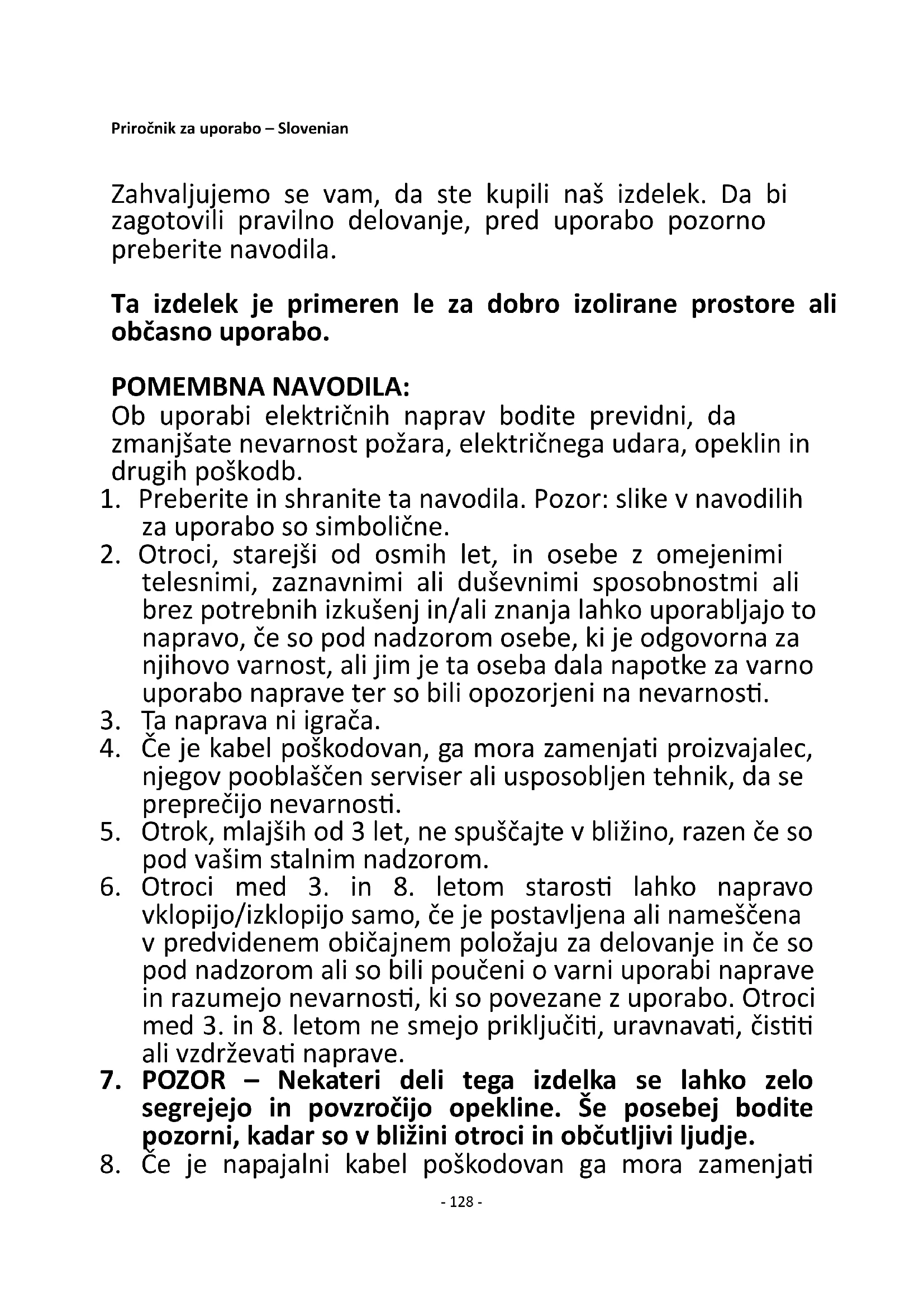 8. Če je napajalni kabel poškodovan ga mora zamenjati- 129 -