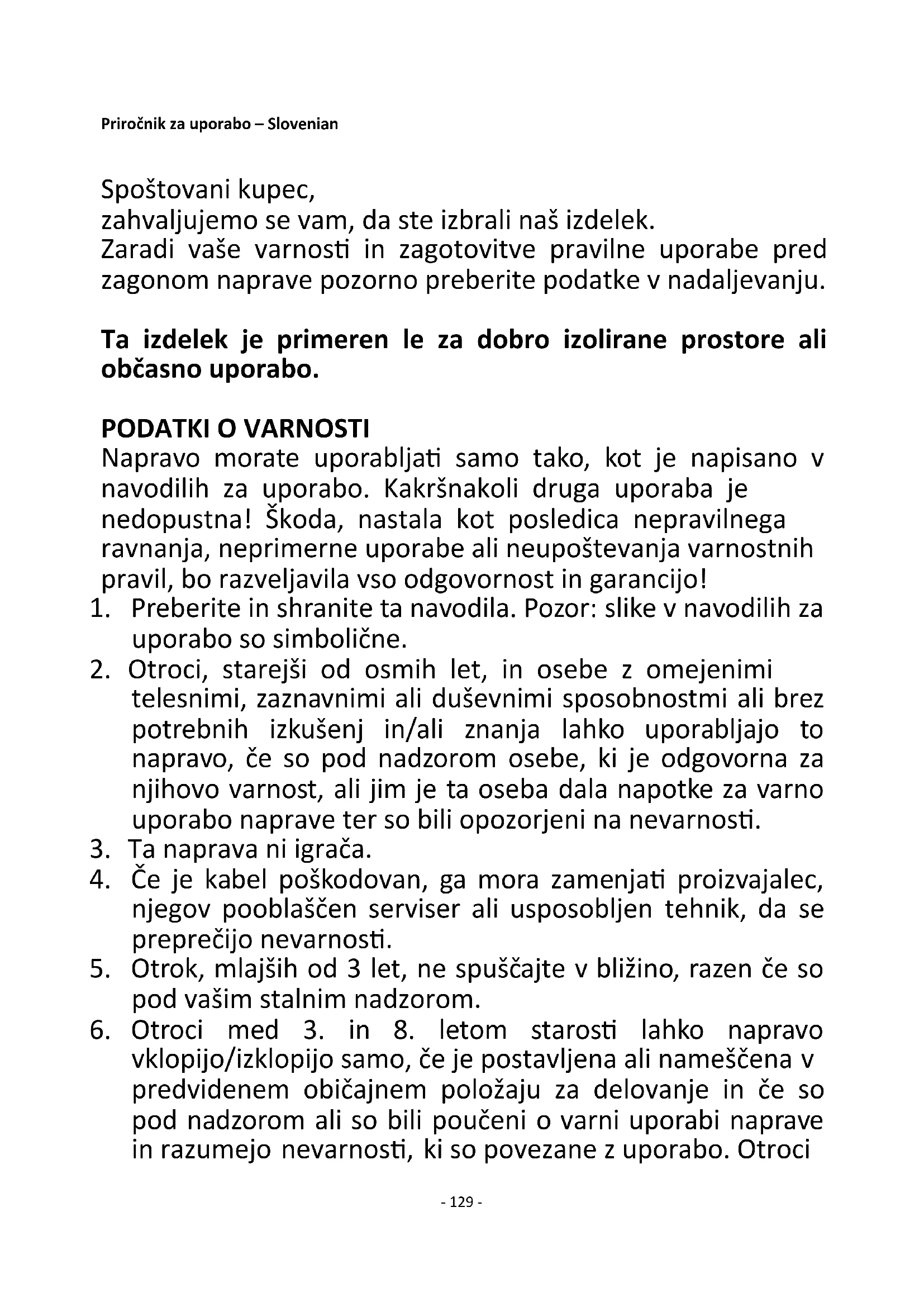 vklopijo/izklopijo samo, če je postavljena ali nameščena v predvidenem običajnem položaju za delovanje in če so pod nadzorom ali so bili poučeni o varni uporabi naprave in razumejo nevarnosti, ki so povezane z uporabo. Otroci- 130 - med 3. in 8. letom ne smejo priključiti, uravnavati, čistiti ali vzdrževati naprave.