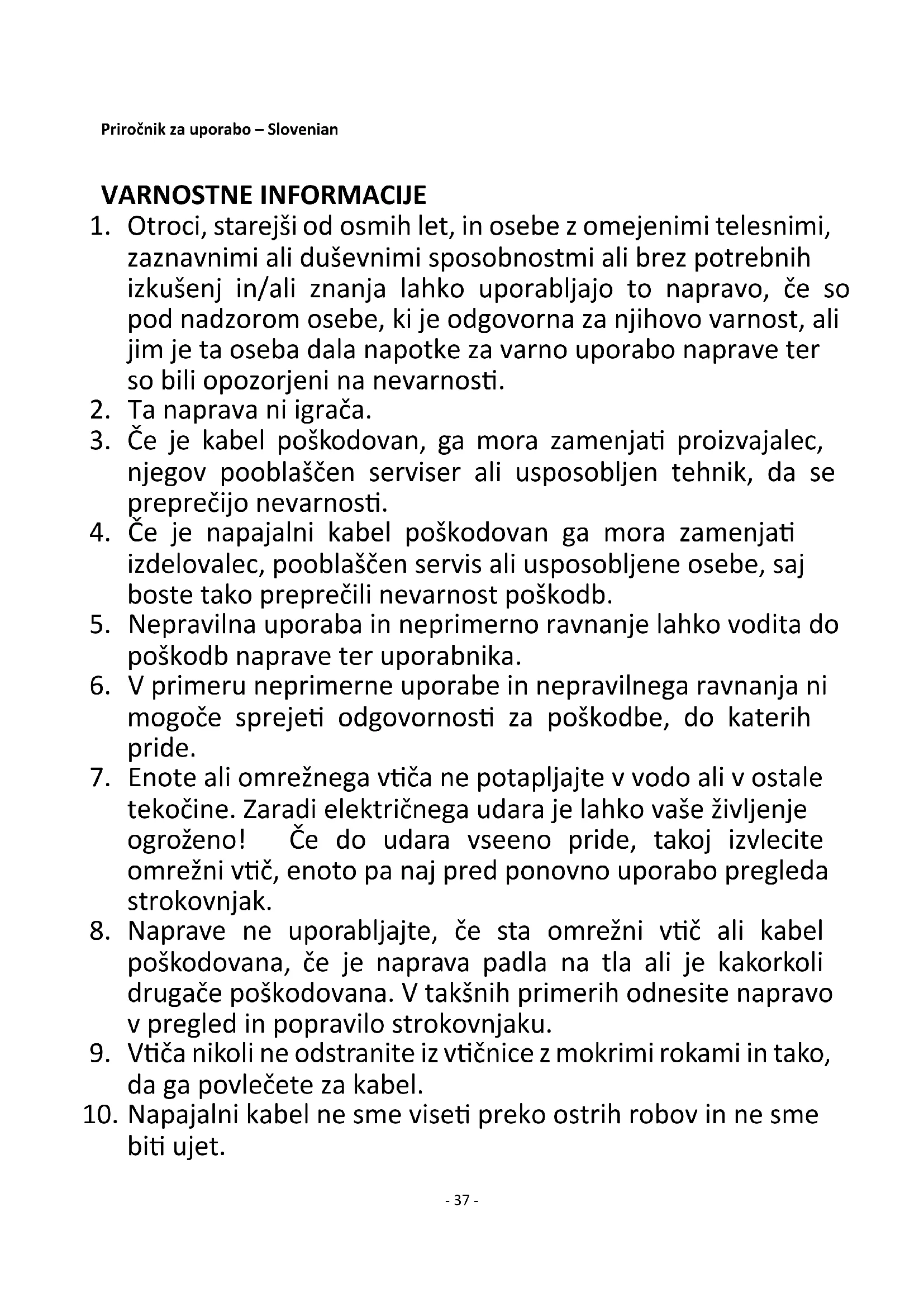 9. Vtiča nikoli ne odstranite iz vtičnice z mokrimi rokami in tako,
