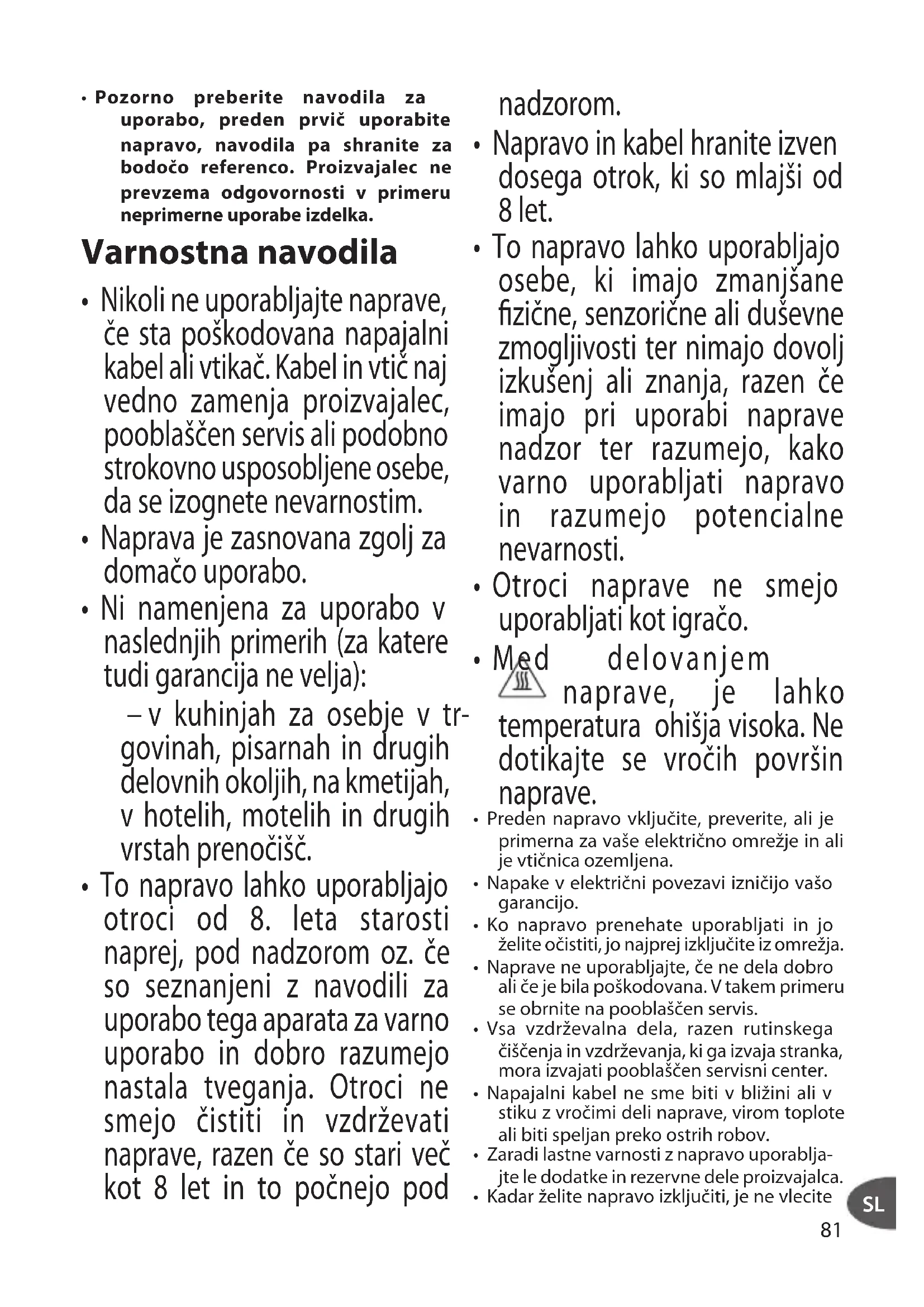 - To napravo lahko uporabljajo osebe, ki imajo zmanjšane zične, senzorične ali duševne zmogljivosti ter nimajo dovolj izkušenj ali znanja, razen če imajo pri uporabi naprave nadzor ter razumejo, kako varno uporabljati napravo in razumejo potencialne nevarnosti.