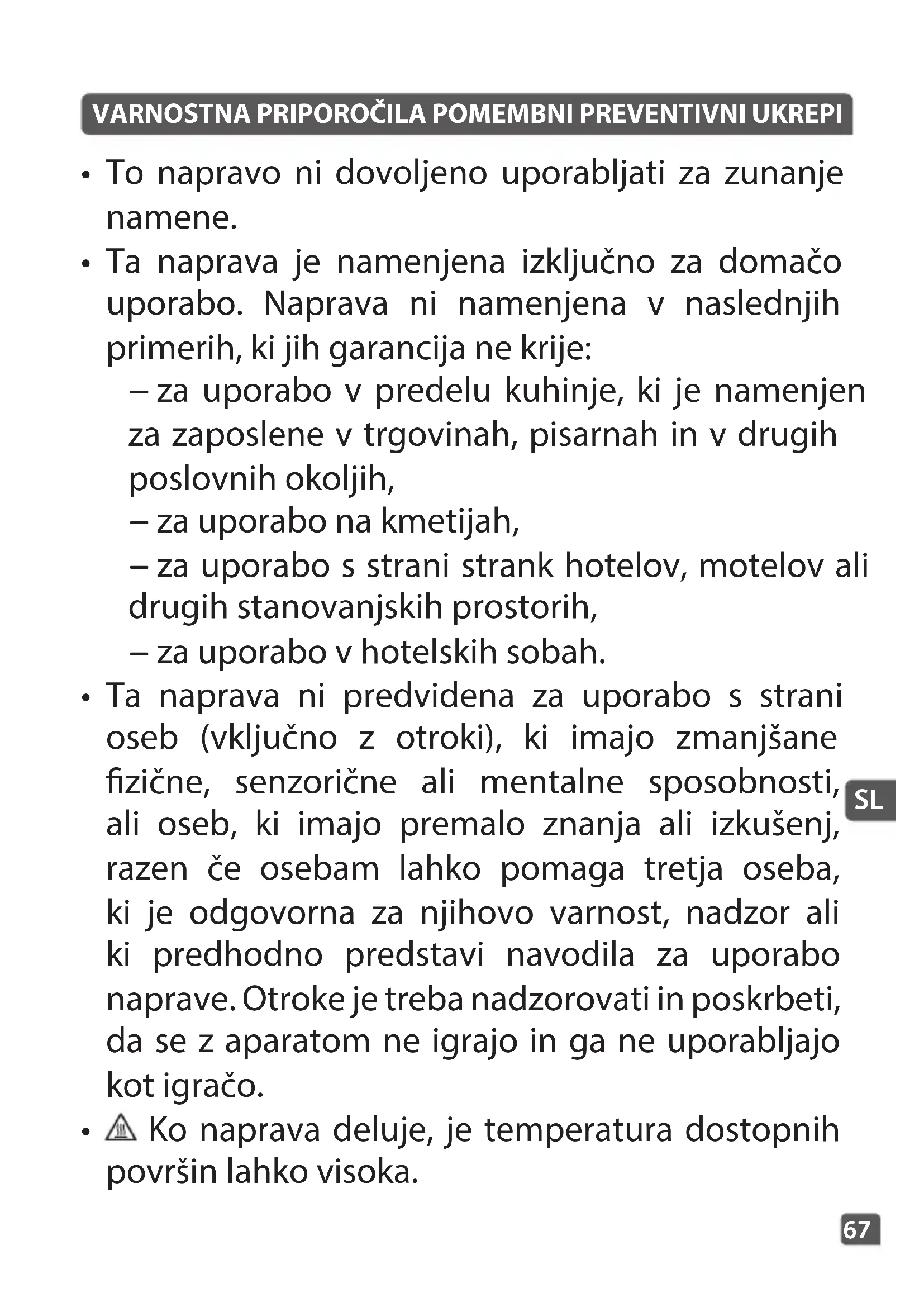 - Aparat lahko uporabljajo otroci, starejši od osem let in osebe z zmanjšanimi zičnimi, senzoričnimi ali duševnimi sposobnostmi oziroma osebe s pomanjkanjem znanja in izkušenj, če so nadzorovani ali so bili poučeni o varni uporabi aparata in razumejo prisotne nevarnosti. Čiščenja in uporabniškega vzdrževanja naj ne opravljajo otroci, če niso starejši od osem let in so brez nadzora. Napravo in kabel hranite izven dosega otrok, mlajših od 8 let.