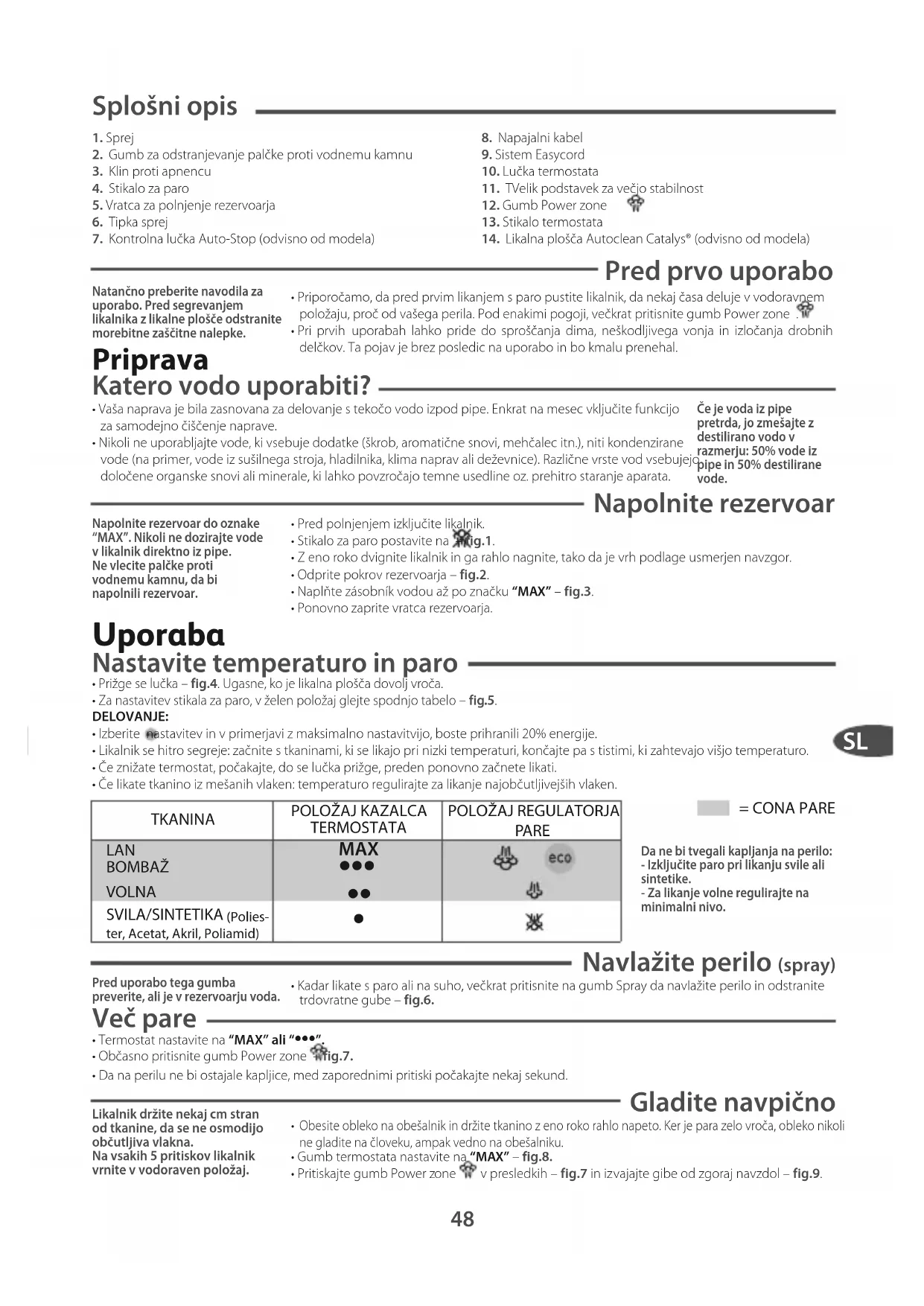 Splošni opis 1. Sprej2. Gumb za odstranjevanje palčke proti vodnemu kamnu3. Klin proti apnencu4. Stikalo za paro5. Vratca za polnjenje rezervoarja6. Tipka sprej7. Kontrolna lučka Auto-Stop (odvisno od modela)8. Napajalni kabel9. Sistem Easycord10. Lučka termostata11. TVelik podstavek za večjo stabilnost12. Gumb Power zone 13. Stikalo termostata14. Likalna plošča Autoclean Catalys® (odvisno od modela) Pred prvo uporabo