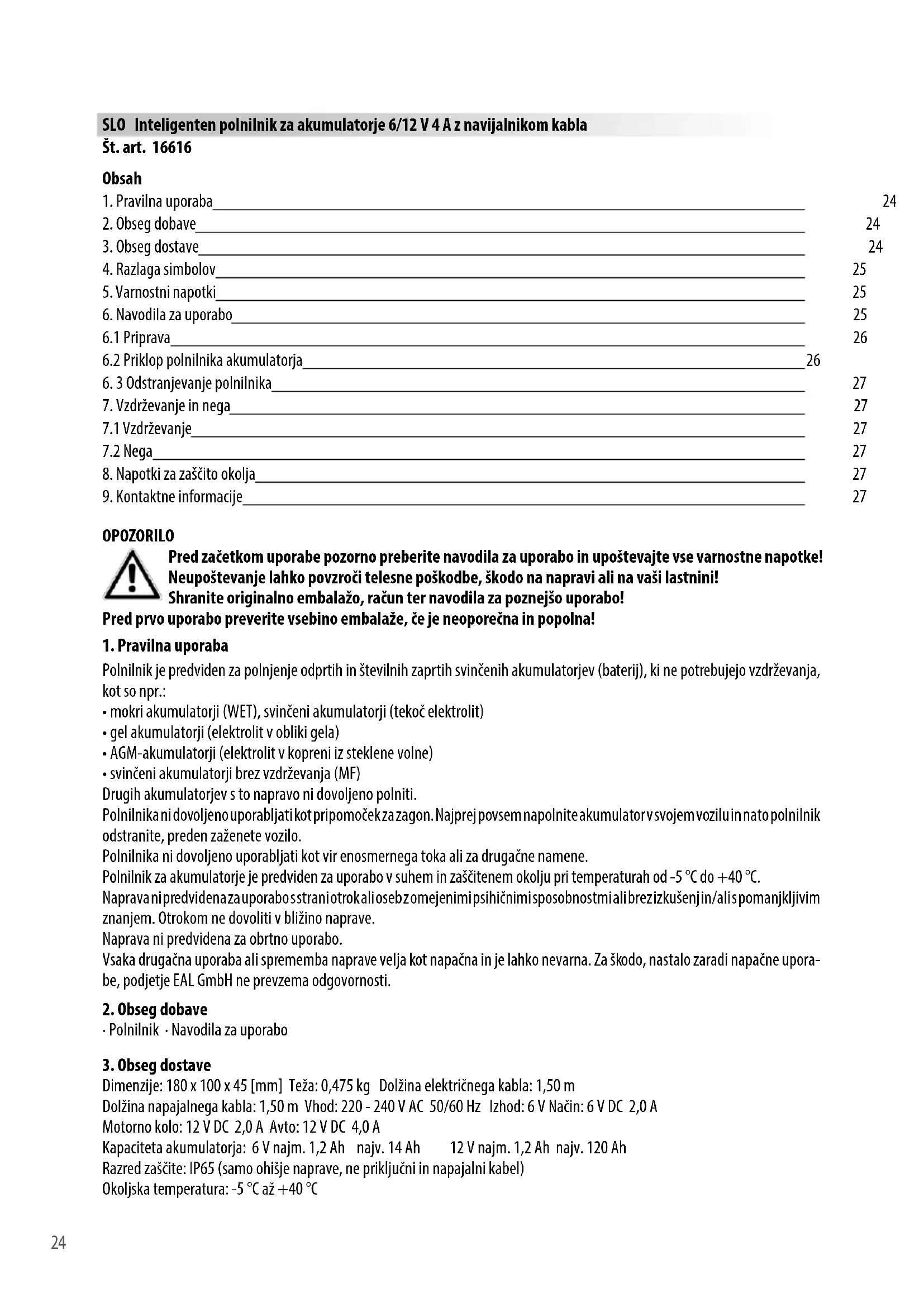 - svinčeni akumulatorji brez vzdrževanja (MF) Drugih akumulatorjev s to napravo ni dovoljeno polniti. Polnilnika ni dovoljeno uporabljati kot pripomoček za zagon. Najprej povsem napolnite akumulator v svojem vozilu in nato polnilnik odstranite, preden zaženete vozilo. Polnilnika ni dovoljeno uporabljati kot vir enosmernega toka ali za drugačne namene. Polnilnik za akumulatorje je predviden za uporabo v suhem in zaščitenem okolju pri temperaturah od -5 °C do +40 °C. Naprava ni predvidena za uporabo s strani otrok ali oseb z omejenimi psihičnimi sposobnostmi ali brez izkušenj in/ali s pomanjkljivim znanjem. Otrokom ne dovoliti v bližino naprave. Naprava ni predvidena za obrtno uporabo. Vsaka drugačna uporaba ali sprememba naprave velja kot napačna in je lahko nevarna. Za škodo, nastalo zaradi napačne upora- be, podjetje EAL GmbH ne prevzema odgovornosti.