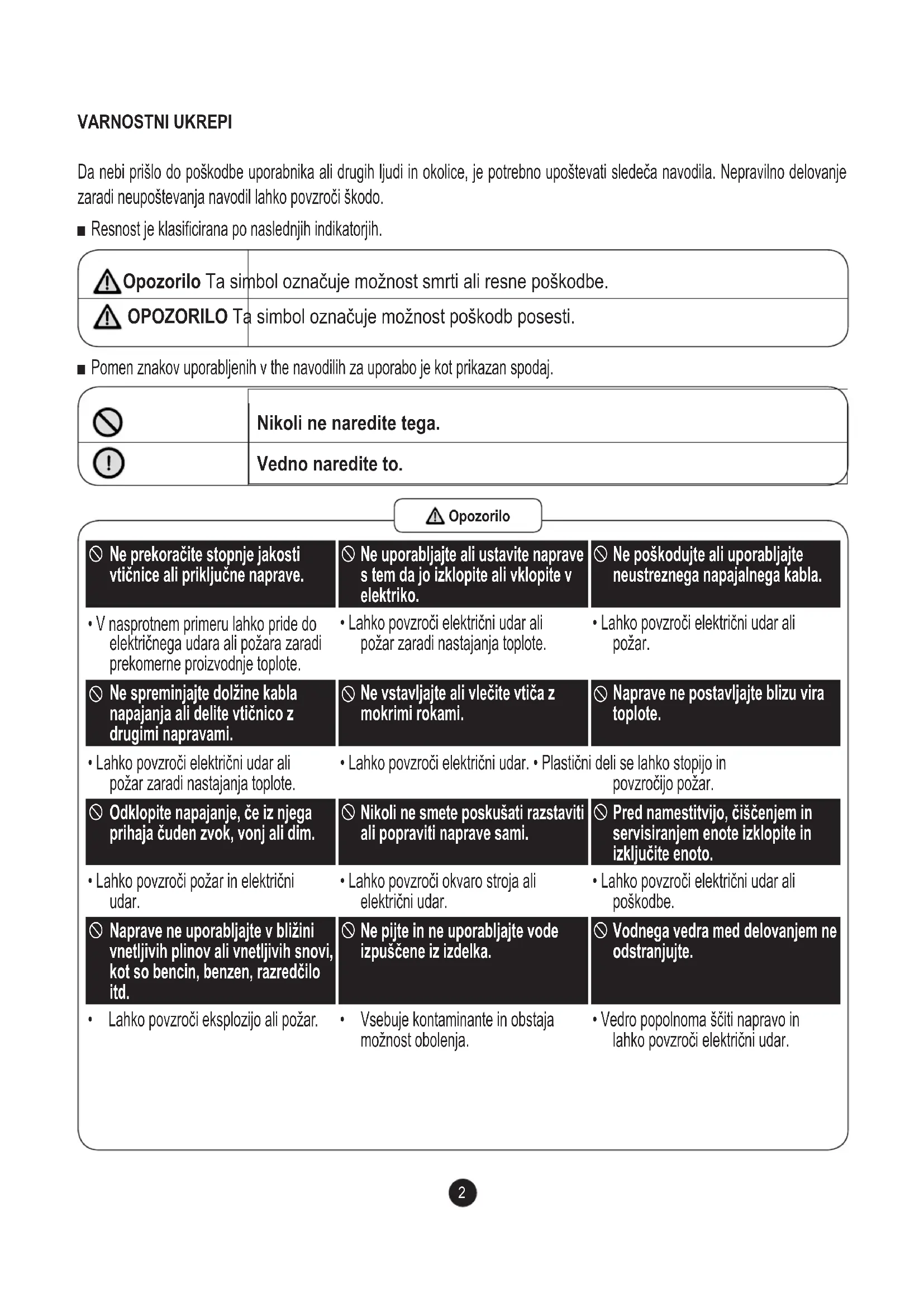 Da nebi prišlo do poškodbe uporabnika ali drugih ljudi in okolice, je potrebno upoštevati sledeča navodila. Nepravilno delovanje zaradi neupoštevanja navodil lahko povzroči škodo. ■ Resnost je klasicirana po naslednjih indikatorjih. Opozorilo Ta simbol označuje možnost smrti ali resne poškodbe. OPOZORILO Ta simbol označuje možnost poškodb posesti. ■ Pomen znakov uporabljenih v the navodilih za uporabo je kot prikazan spodaj. Nikoli ne naredite tega. Vedno naredite to.