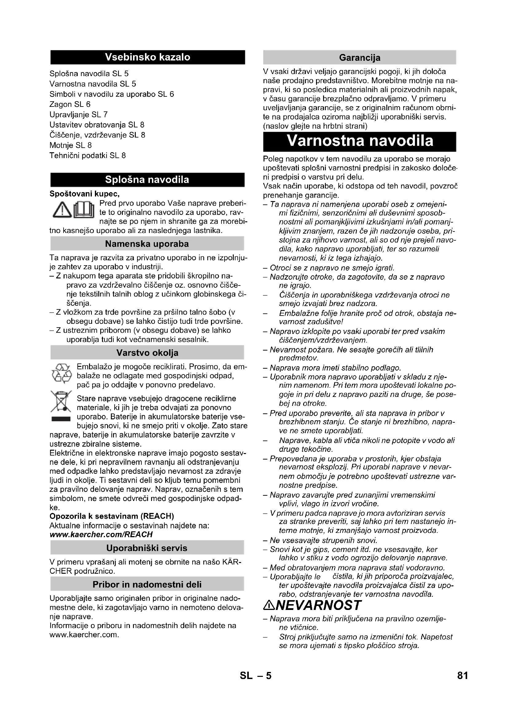 Síťová pojistka (pomalá) 10 A Objem sběrné nádoby 18 l Odběr vody, max. 4 l Výkon P jmen 1200 W Výkon P max 1400 W Sít'ový kabel H05-VV-F2x0,75 Hladina akustického tlaku (EN 60704-2-1) 74 dB(A) 80 CS– 5 Spoštovani kupec, Pred prvo uporabo Vaše naprave preberi- te to originalno navodilo za uporabo, rav- najte se po njem in shranite ga za morebi- tno kasnejšo uporabo ali za naslednjega lastnika. Ta naprava je razvita za privatno uporabo in ne izpolnju- je zahtev za uporabo v industriji. – Z nakupom tega aparata ste pridobili škropilno na- pravo za vzdrževalno čiščenje oz. osnovno čišče- nje tekstilnih talnih oblog z učinkom globinskega či- ščenja. – Z vložkom za trde površine za pršilno talno šobo (v obsegu dobave) se lahko čistijo tudi trde površine. – Z ustreznim priborom (v obsegu dobave) se lahko uporablja tudi kot večnamenski sesalnik. Embalažo je mogoče reciklirati. Prosimo, da em- balaže ne odlagate med gospodinjski odpad, pač pa jo oddajte v ponovno predelavo. Stare naprave vsebujejo dragocene reciklirne materiale, ki jih je treba odvajati za ponovno uporabo. Baterije in akumulatorske baterije vse- bujejo snovi, ki ne smejo priti v okolje. Zato stare naprave, baterije in akumulatorske baterije zavrzite v ustrezne zbiralne sisteme. Električne in elektronske naprave imajo pogosto sestav- ne dele, ki pri nepravilnem ravnanju ali odstranjevanju med odpadke lahko predstavljajo nevarnost za zdravje ljudi in okolje. Ti sestavni deli so kljub temu pomembni za pravilno delovanje naprav. Naprav, označenih s tem simbolom, ne smete odvreči med gospodinjske odpad- ke. Opozorila k sestavinam (REACH) Aktualne informacije o sestavinah najdete na: www.kaercher.com/REACH V primeru vprašanj ali motenj se obrnite na našo KÄR- CHER podružnico. Uporabljajte samo originalen pribor in originalne nado- mestne dele, ki zagotavljajo varno in nemoteno delova- nje naprave. Informacije o priboru in nadomestnih delih najdete na www.kaercher.com. V vsaki državi veljajo garancijski pogoji, ki jih določa naše prodajno predstavništvo. Morebitne motnje na na- pravi, ki so posledica materialnih ali proizvodnih napak, v času garancije brezplačno odpravljamo. V primeru uveljavljanja garancije, se z originalnim računom obrni- te na prodajalca oziroma najbližji uporabniški servis. (naslov glejte na hrbtni strani) Poleg napotkov v tem navodilu za uporabo se morajo upoštevati splošni varnostni predpisi in zakosko določe- ni predpisi o varstvu pri delu. Vsak način uporabe, ki odstopa od teh navodil, povzroči prenehanje garancije. – Ta naprava ni namenjena uporabi oseb z omejeni- mi fizičnimi, senzoričnimi ali duševnimi sposob- nostmi ali pomanjkljivimi izkušnjami in/ali pomanj- kljivim znanjem, razen če jih nadzoruje oseba, pri- stojna za njihovo varnost, ali so od nje prejeli navo- dila, kako napravo uporabljati, ter so razumeli nevarnosti, ki iz tega izhajajo. – Otroci se z napravo ne smejo igrati. – Nadzorujte otroke, da zagotovite, da se z napravo ne igrajo. – Čiščenja in uporabniškega vzdrževanja otroci ne smejo izvajati brez nadzora. – Embalažne folije hranite proč od otrok, obstaja ne- varnost zadušitve! – Napravo izklopite po vsaki uporabi ter pred vsakim čiščenjem/vzdrževanjem. – Nevarnost požara. Ne sesajte gorečih ali tlilnih predmetov. – Naprava mora imeti stabilno podlago. – Uporabnik mora napravo uporabljati v skladu z nje- nim namenom. Pri tem mora upoštevati lokalne po- goje in pri delu z napravo paziti na druge, še pose- bej na otroke. – Pred uporabo preverite, ali sta naprava in pribor v brezhibnem stanju. Če stanje ni brezhibno, napra- ve ne smete uporabljati. – Naprave, kabla ali vtiča nikoli ne potopite v vodo ali druge tekočine. – Prepovedana je uporaba v prostorih, kjer obstaja nevarnost eksplozij. Pri uporabi naprave v nevar- nem območju je potrebno upoštevati ustrezne var- nostne predpise. – Napravo zavarujte pred zunanjimi vremenskimi vplivi, vlago in izvori vročine. – V primeru padca naprave jo mora avtoriziran servis za stranke preveriti, saj lahko pri tem nastanejo in- terne motnje, ki zmanjšajo varnost proizvoda. – Ne vsesavajte strupenih snovi. – Snovi kot je gips, cement itd. ne vsesavajte, ker lahko v stiku z vodo ogrozijo delovanje naprave. – Med obratovanjem mora naprava stati vodoravno. – Uporabljajte le čistila, ki jih priporoča proizvajalec, ter upoštevajte navodila proizvajalca čistil za upo- rabo, odstranjevanje ter varnostna navodila. 몇 NEVARNOST – Naprava mora biti priključena na pravilno ozemlje- ne vtičnice. – Stroj priključujte samo na izmenični tok. Napetost se mora ujemati s tipsko ploščico stroja. Vsebinsko kazalo Splošna navodila SL 5 Varnostna navodila SL 5 Simboli v navodilu za uporabo SL 6 Zagon SL 6 Upravljanje SL 7 Ustavitev obratovanja SL 8 Čiščenje, vzdrževanje SL 8 Motnje SL 8 Tehnični podatki SL 8 Splošna navodila Namenska uporaba Varstvo okolja Uporabniški servis Pribor in nadomestni deli Garancija Varnostna navodila 81SL– 6 – Omrežnega vtiča in vtičnice nikoli ne prijemajte z mokrimi rokami. – Omrežnega vtiča ne vlecite iz vtičnice z vlečenjem priključnega kabla. – Pred vsemi čistilnimi in vzdrževalnimi deli izklopite napravo in omrežni vtič izvlecite iz vtičnice. – Popravila in posege na električnih sestavnih delih sme opravljati le pooblaščena servisna služba. – Pred vsako uporabo preverite ali na priključnem ka- blu z omrežnim vitčem obstajajo poškodbe. Poško- dovani priključni kabel takoj dajte na zamenjavo pooblaščeni servisni službi/električarju. – Za izogibanje električnim nesrečam priporočamo, da uporabljate vtičnice s predvklopljenim zaščitnim stikalom (maks. 30 mA nazivne jakosti sprožilnega toka). – Uporabljajte samo pred škropljenjem zaščiten po- daljševalni kabel z minimalnim prerezom od 3x1 mm