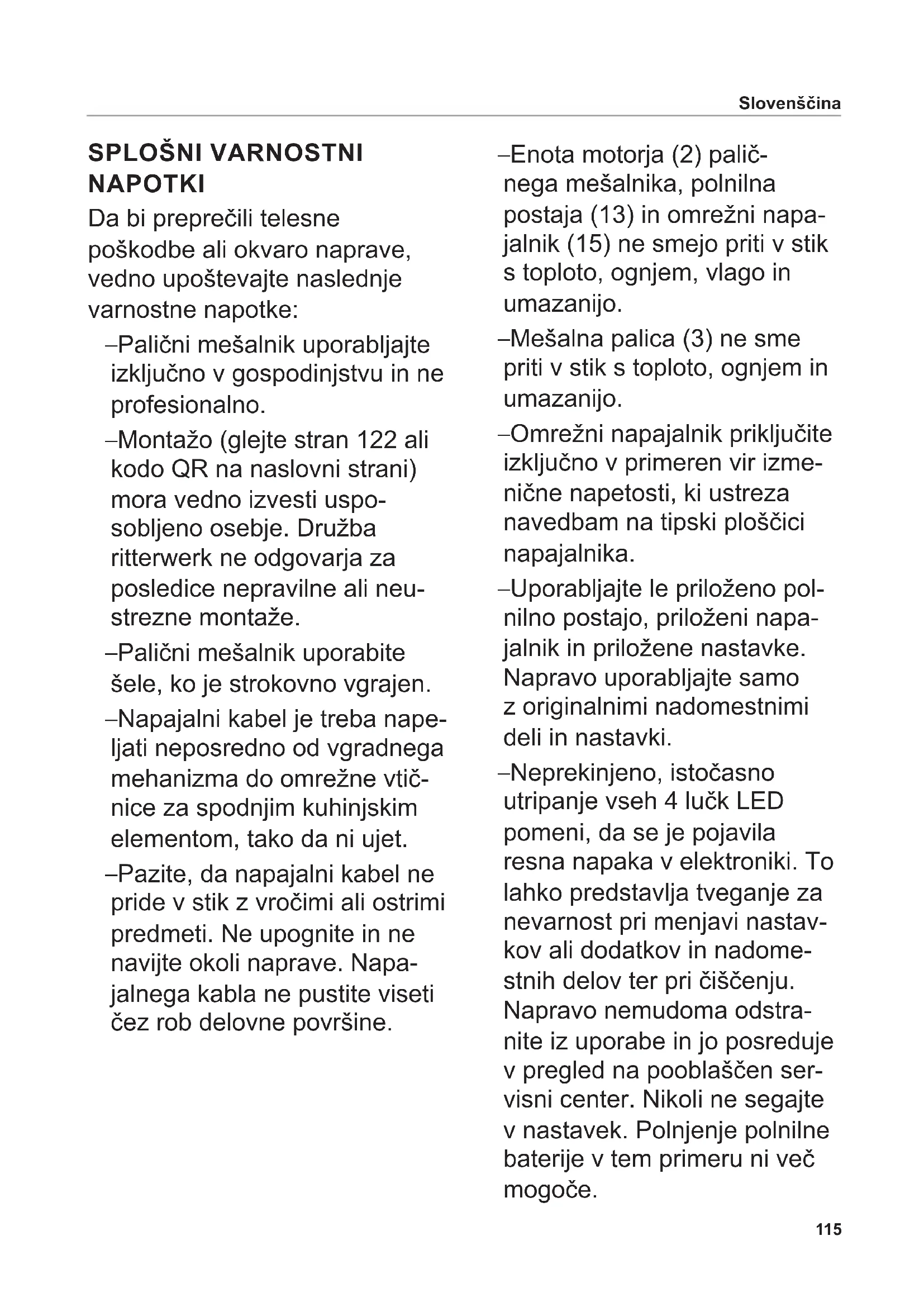NAPOTKI Da bi preprečili telesne poškodbe ali okvaro naprave, vedno upoštevajte naslednje varnostne napotke: – Palični mešalnik uporabljajte izključno v gospodinjstvu in ne profesionalno. – Montažo (glejte stran 122 ali kodo QR na naslovni strani) mora vedno izvesti uspo- sobljeno osebje. Družba ritterwerk ne odgovarja za posledice nepravilne ali neu- strezne montaže. – Palični mešalnik uporabite šele, ko je strokovno vgrajen. – Napajalni kabel je treba nape- ljati neposredno od vgradnega mehanizma do omrežne vtič- nice za spodnjim kuhinjskim elementom, tako da ni ujet. – Pazite, da napajalni kabel ne pride v stik z vročimi ali ostrimi predmeti. Ne upognite in ne navijte okoli naprave. Napa- jalnega kabla ne pustite viseti čez rob delovne površine. – Enota motorja (2) palič- nega mešalnika, polnilna postaja (13) in omrežni napa- jalnik (15) ne smejo priti v stik s toploto, ognjem, vlago in umazanijo. – Mešalna palica (3) ne sme priti v stik s toploto, ognjem in umazanijo. – Omrežni napajalnik priključite izključno v primeren vir izme- nične napetosti, ki ustreza navedbam na tipski ploščici napajalnika. – Uporabljajte le priloženo pol- nilno postajo, priloženi napa- jalnik in priložene nastavke. Napravo uporabljajte samo z originalnimi nadomestnimi deli in nastavki. – Neprekinjeno, istočasno utripanje vseh 4 lučk LED pomeni, da se je pojavila resna napaka v elektroniki. To lahko predstavlja tveganje za nevarnost pri menjavi nastav- kov ali dodatkov in nadome- stnih delov ter pri čiščenju. Napravo nemudoma odstra- nite iz uporabe in jo posreduje v pregled na pooblaščen ser- visni center. Nikoli ne segajte v nastavek. Polnjenje polnilne baterije v tem primeru ni več mogoče. Slovenščina116 – Otroci naprave ne smejo upo- rabljati. Napravo in napajalni kabel shranjujte nedosegljiva otrokom. – Napravo lahko uporabljajo tudi osebe z omejenimi zič- nimi, zaznavnimi ali duševnimi sposobnostmi ali s pomanj- kanjem izkušenj in/ali znanja, če so pri tem nadzorovane ali so bile podučene o varni uporabi naprave in razumejo nevarnosti, povezane z njeno uporabo. – Otroci se z napravo ne smejo igrati. – Palični mešalnik uporabljajte šele, ko je vstavljen v posodo s ploskim dnom. – Paličnega mešalnika ne smete potopiti v zmes preko spoja mešalne palice in enote motorja. – Naprave med delovanjem nikoli ne pustite brez nadzora. – Paličnega mešalnika, polnilne postaje ali omrežnega napa- jalnika nikoli ne potapljajte v vodo ali druge tekočine. Nikoli je ne izpostavljajte dežju ali drugi vlagi. Če bi naprava vseeno padla v vodo, najprej izključite omrežni napajalnik polnilne postaje iz vtičnice in šele nato vzemite napravo iz vode. V takšnem primeru naj celotno napravo pred ponovno uporabo pregleda pooblaščeni serviser. – Naprave nikoli ne uporabljajte z vlažnimi rokami. Ne upo- rabljajte je, če je vlažna ali mokra ali če stojite na vlažnih tleh. Ne uporabljajte je na prostem. – Paličnega mešalnika in pol- nilne postaje ne smete čistiti v pomivalnem stroju. – Med delovanjem paličnega mešalnika se nikoli ne doti- kajte nastavkov in ne vsta- vljajte predmetov v delujoč palični mešalnik. Slovenščina117 Nevarnost telesnih poškodb – V primeru okvare polnilne postaje vedno izvlecite omre- žni napajalnik iz vtičnice. Pri tem ne vlecite za napajalni kabel, temveč za električni vtikač. – Če je kateri od delov naprave poškodovan, jo takoj prene- hajte uporabljati, da se izog- nete nevarnosti. V takšnem primeru naj celotno napravo pred ponovno uporabo pre- gleda pooblaščeni serviser. – Če je omrežni napajalnik ali napajalni kabel poškodovan, ga morate zamenjati z original- nim omrežnim napajalnikom, ki ga dobite pri proizvajalcu ali nacionalni službi za stranke. – Paličnega mešalnika nikoli ne vključite, ko ga čistite, odstra- njujete ali nameščate nastavke ali menjujete dodatno opremo in nadomestne dele. Držite prste stran od gumbov. Ne dotikajte se nožev na nastav- kih, saj so zelo ostri. – Med obdelavo lahko pride do brizganja živil. Zaradi tega pred uporabo počakajte, da se vroča hrana ohladi, da se izognete opeklinam. Slovenščina – Če palični mešalnik upo- rabljajte v loncu, le-tega pred- hodno odstranite s kuhalne plošče. – Prepričajte se, da se vdolbina na nastavku popolnoma pri- lega na svinčnik pogonske gredi. Uporaba ohlapnih, nepritrjenih nastavkov ni dovo- ljena, in jih morate zamenjati. Nevarnost eksplozije – Akumulatorske baterije zaščitite pred vročino in ognjem.118 Razgrnite slike na sprednji in zadnji platnici. Pred prvo uporabo skrbno preberite navodila za uporabo. Navodila za uporabo shranite in jih priložite napravi, če jo posre- dujete naprej. Najnovejša navodila za uporabo so na voljo tudi na spletnem naslovu www.ritterwerk.de. NAMEN UPORABE Palični mešalnik se uporablja za pretlačenje, sekljanje ali mešanje ustreznih, običajnih gospodinjskih živil. Palični mešalnik je primeren za stik z živili. Palični mešalnik uporabljajte izključno v gospodinjstvu in ne profesionalno. Neustrezna ali napačna uporaba lahko povzroči hude telesne poškodbe ali okvare paličnega mešalnika. V takšnih primerih prenehata veljati garancija in jamstvo. OPIS FUNKCIJ Z baterijskim paličnim mešalni- kom lahko pretlačite, sesekljate ali premešate trdna in tekoča živila. Palični mešalnik (1) je opremljen s plastično mešalno posodo (14) in naslednjimi nastavki: – Univerzalni nož (9): standardni nastavek za sekljanje in mletje večine živil – Rezalni nož (10): za sekljanje mesa in vlaknatega sadja in zelenjave – Nastavek za stepanje (11): za zračno stepanje živil (npr. smetane) – Mešalna plošča (12): za meša- nje gostih kremnih jedi Palični mešalnik ima 3 stopnje hitrosti. Zaščita pred preobremenitvijo s samodejnim varnostnim izklo- pom se samodejno aktivira pri: – pregrevanju – blokadi noža – neprekin