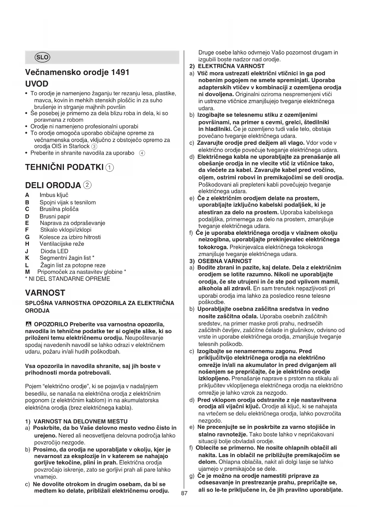 - NI DEL STANDARNE OPREME VARNOST SPLOŠNA VARNOSTNA OPOZORILA ZA ELEKTRIČNA ORODJA - OPOZORILO Preberite vsa varnostna opozorila, navodila in tehnične podatke ter si oglejte slike, ki so priloženi temu električnemu orodju. Neupoštevanje spodaj navedenih navodil se lahko odrazi v električnem udaru, požaru in/ali hudih poškodbah. Vsa opozorila in navodila shranite, saj jih boste v prihodnosti morda potrebovali. Pojem “električno orodje”, ki se pojavlja v nadaljnjem besedilu, se nanaša na električna orodja z električnim pogonom (z električnim kablom) in na akumulatorska električna orodja (brez električnega kabla).