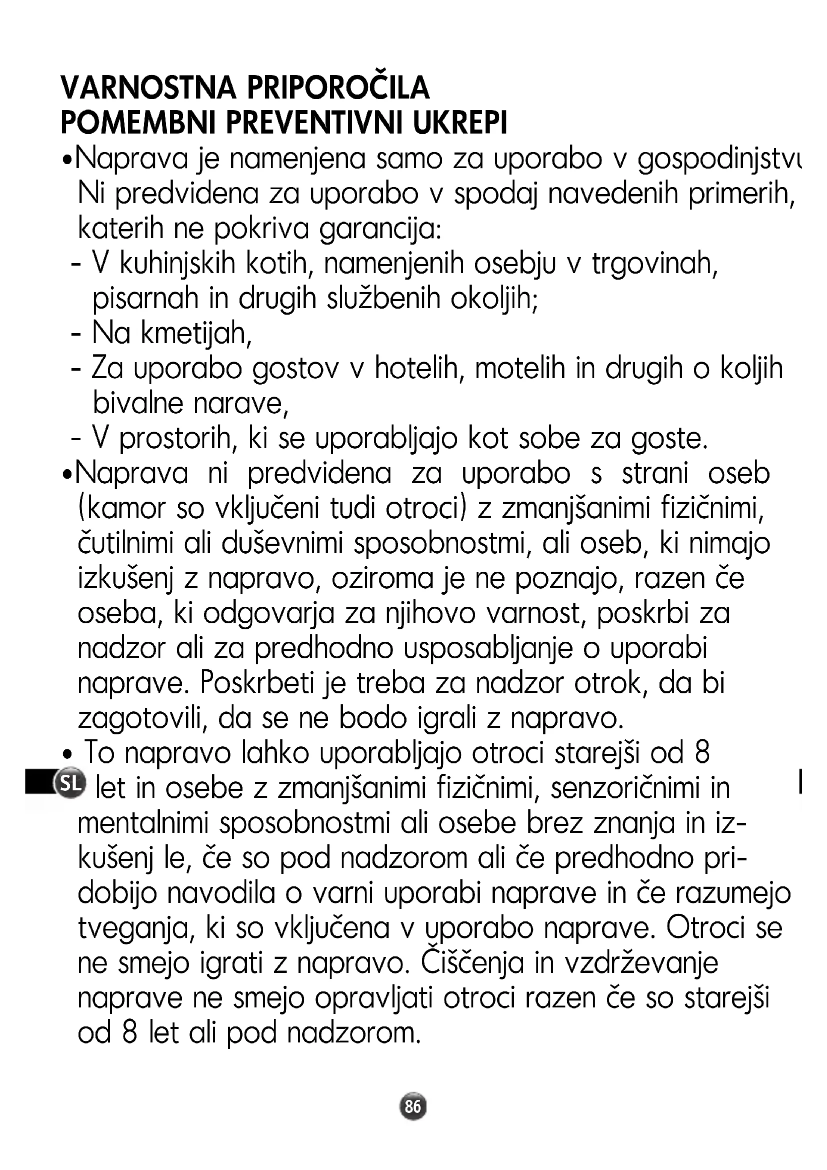 - To napravo lahko uporabljajo otroci starejši od 8 let in osebe z zmanjšanimi fizičnimi, senzoričnimi in mentalnimi sposobnostmi ali osebe brez znanja in iz- kušenj le, če so pod nadzorom ali če predhodno pri- dobijo navodila o varni uporabi naprave in če razumejo tveganja, ki so vključena v uporabo naprave. Otroci se ne smejo igrati z napravo. Čiščenja in vzdrževanje naprave ne smejo opravljati otroci razen če so starejši od 8 let ali pod nadzorom.
