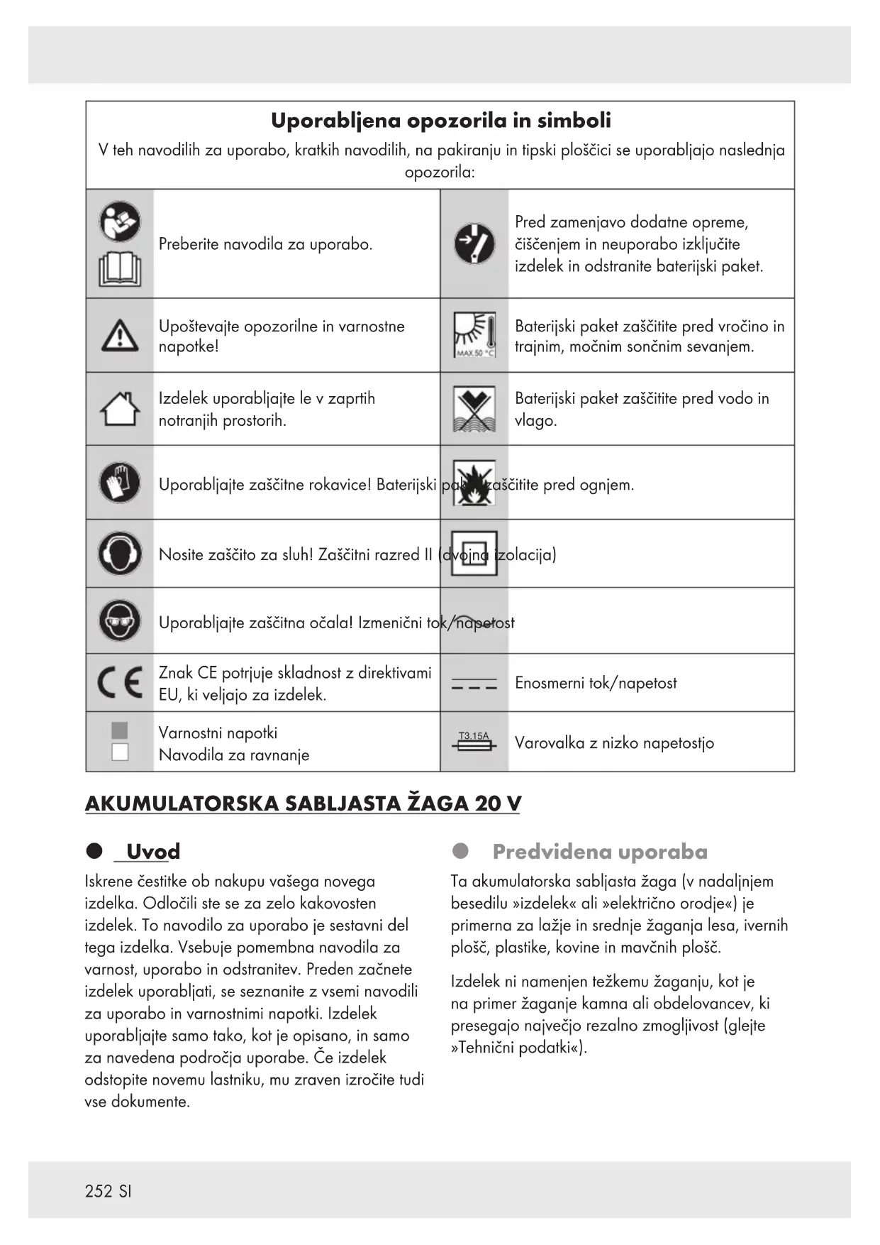 Uvod Iskrene čestitke ob nakupu vašega novega izdelka. Odločili ste se za zelo kakovosten izdelek. To navodilo za uporabo je sestavni del tega izdelka. Vsebuje pomembna navodila za varnost, uporabo in odstranitev. Preden začnete izdelek uporabljati, se seznanite z vsemi navodili za uporabo in varnostnimi napotki. Izdelek uporabljajte samo tako, kot je opisano, in samo za navedena področja uporabe. Če izdelek odstopite novemu lastniku, mu zraven izročite tudi vse dokumente. Predvidena uporaba Ta akumulatorska sabljasta žaga (v nadaljnjem besedilu »izdelek« ali »električno orodje«) je primerna za lažje in srednje žaganja lesa, ivernih plošč, plastike, kovine in mavčnih plošč. Izdelek ni namenjen težkemu žaganju, kot je na primer žaganje kamna ali obdelovancev, ki presegajo največjo rezalno zmogljivost (glejte »Tehnični podatki«).253