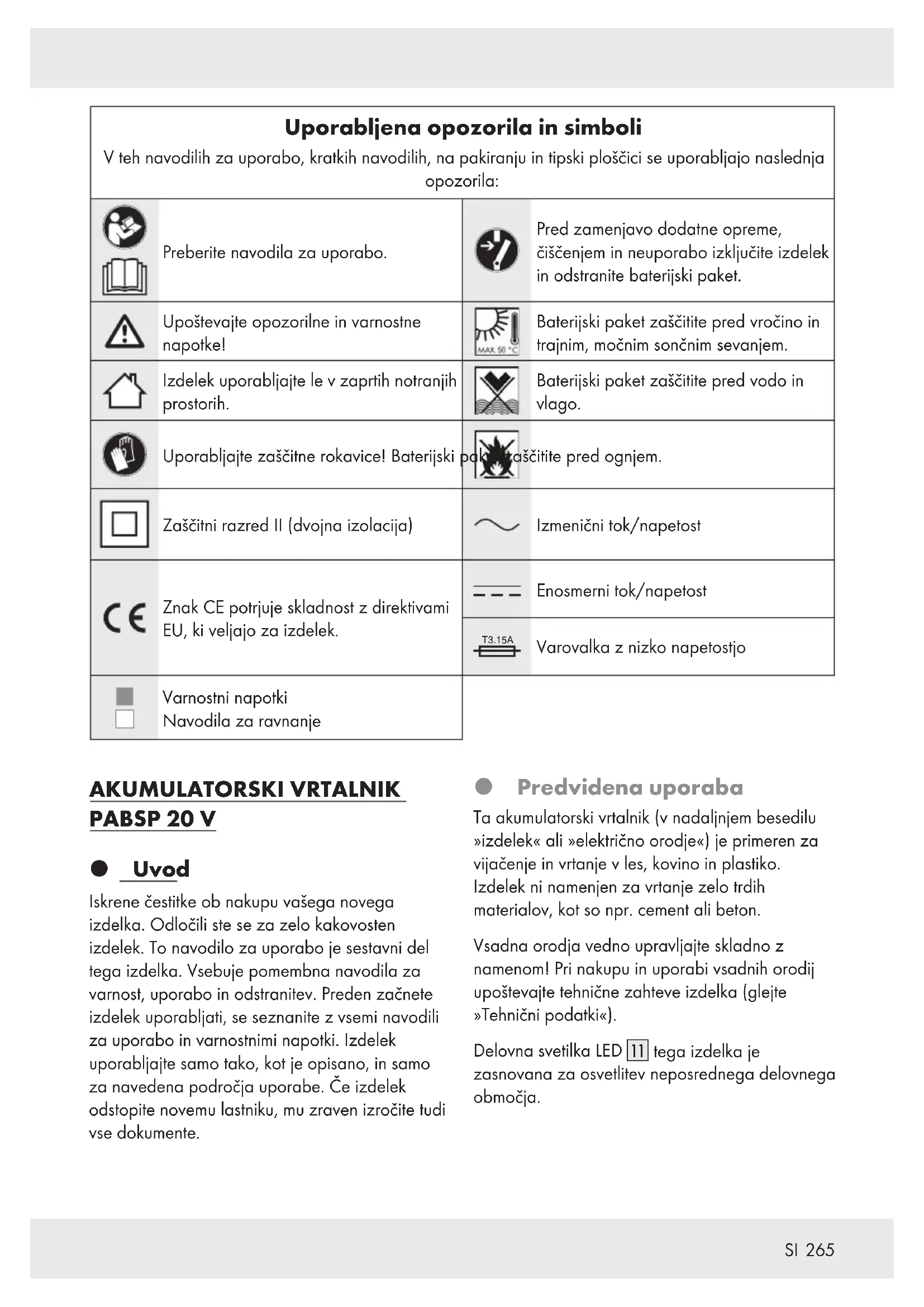 Uporabljena opozorila in simboli V teh navodilih za uporabo, kratkih navodilih, na pakiranju in tipski ploščici se uporabljajo naslednja opozorila: Preberite navodila za uporabo. Pred zamenjavo dodatne opreme, čiščenjem in neuporabo izključite izdelek in odstranite baterijski paket. Upoštevajte opozorilne in varnostne napotke! Baterijski paket zaščitite pred vročino in trajnim, močnim sončnim sevanjem. Izdelek uporabljajte le v zaprtih notranjih prostorih. Baterijski paket zaščitite pred vodo in vlago. Uporabljajte zaščitne rokavice! Baterijski paket zaščitite pred ognjem. Zaščitni razred II (dvojna izolacija) Izmenični tok/napetost Znak CE potrjuje skladnost z direktivami EU, ki veljajo za izdelek. Enosmerni tok/napetost T3.15A Varovalka z nizko napetostjo Varnostni napotki Navodila za ravnanje AKUMULATORSKI VRTALNIK PABSP 20 V Uvod Iskrene čestitke ob nakupu vašega novega izdelka. Odločili ste se za zelo kakovosten izdelek. To navodilo za uporabo je sestavni del tega izdelka. Vsebuje pomembna navodila za varnost, uporabo in odstranitev. Preden začnete izdelek uporabljati, se seznanite z vsemi navodili za uporabo in varnostnimi napotki. Izdelek uporabljajte samo tako, kot je opisano, in samo za navedena področja uporabe. Če izdelek odstopite novemu lastniku, mu zraven izročite tudi vse dokumente. Predvidena uporaba Ta akumulatorski vrtalnik (v nadaljnjem besedilu »izdelek« ali »električno orodje«) je primeren za vijačenje in vrtanje v les, kovino in plastiko. Izdelek ni namenjen za vrtanje zelo trdih materialov, kot so npr. cement ali beton. Vsadna orodja vedno upravljajte skladno z namenom! Pri nakupu in uporabi vsadnih orodij upoštevajte tehnične zahteve izdelka (glejte »Tehnični podatki«). Delovna svetilka LED [] tega izdelka je zasnovana za osvetlitev neposrednega delovnega območja.266