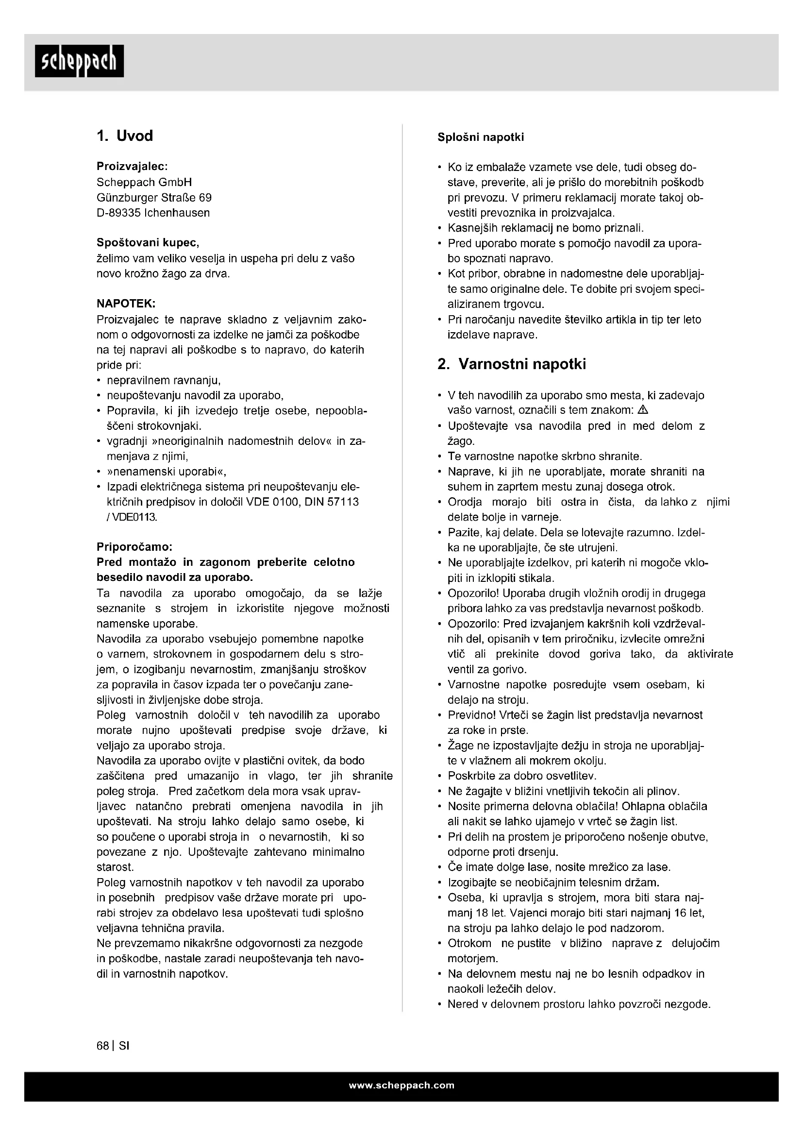 - Izpadielektričnegasistemaprineupoštevanjuele- ktričnihpredpisovindoločilVDE0100,DIN57113 / VDE0113. Priporočamo: Pred montažo in zagonom preberite celotno besedilo navodil za uporabo. Ta navodila za uporabo omogočajo, da se lažje seznanite s strojem in izkoristite njegove možnosti namenske uporabe. Navodila za uporabo vsebujejo pomembne napotke o varnem, strokovnem in gospodarnem delu s stro- jem, o izogibanju nevarnostim, zmanjšanju stroškov zapopravilainčasovizpadateropovečanjuzane- sljivostiinživljenjskedobestroja. Poleg varnostnih določilv tehnavodilihza uporabo morate nujno upoštevati predpise svoje države, ki veljajo za uporabo stroja. Navodilazauporaboovijtevplastičniovitek,dabodo zaščitena pred umazanijo in vlago, ter jih shranite polegstroja. Predzačetkomdelamoravsakuprav- ljavec natančno prebrati omenjena navodila in jih upoštevati. Na stroju lahko delajo samo osebe, ki sopoučeneouporabistrojain onevarnostih, kiso povezane z njo. Upoštevajte zahtevano minimalno starost. Poleg varnostnih napotkov v teh navodil za uporabo inposebnih predpisovvašedržavemoratepri upo- rabi strojev za obdelavo lesa upoštevati tudi splošno veljavnatehničnapravila. Ne prevzemamo nikakršne odgovornosti za nezgode in poškodbe, nastale zaradi neupoštevanja teh navo- dil in varnostnih napotkov.www.scheppach.com