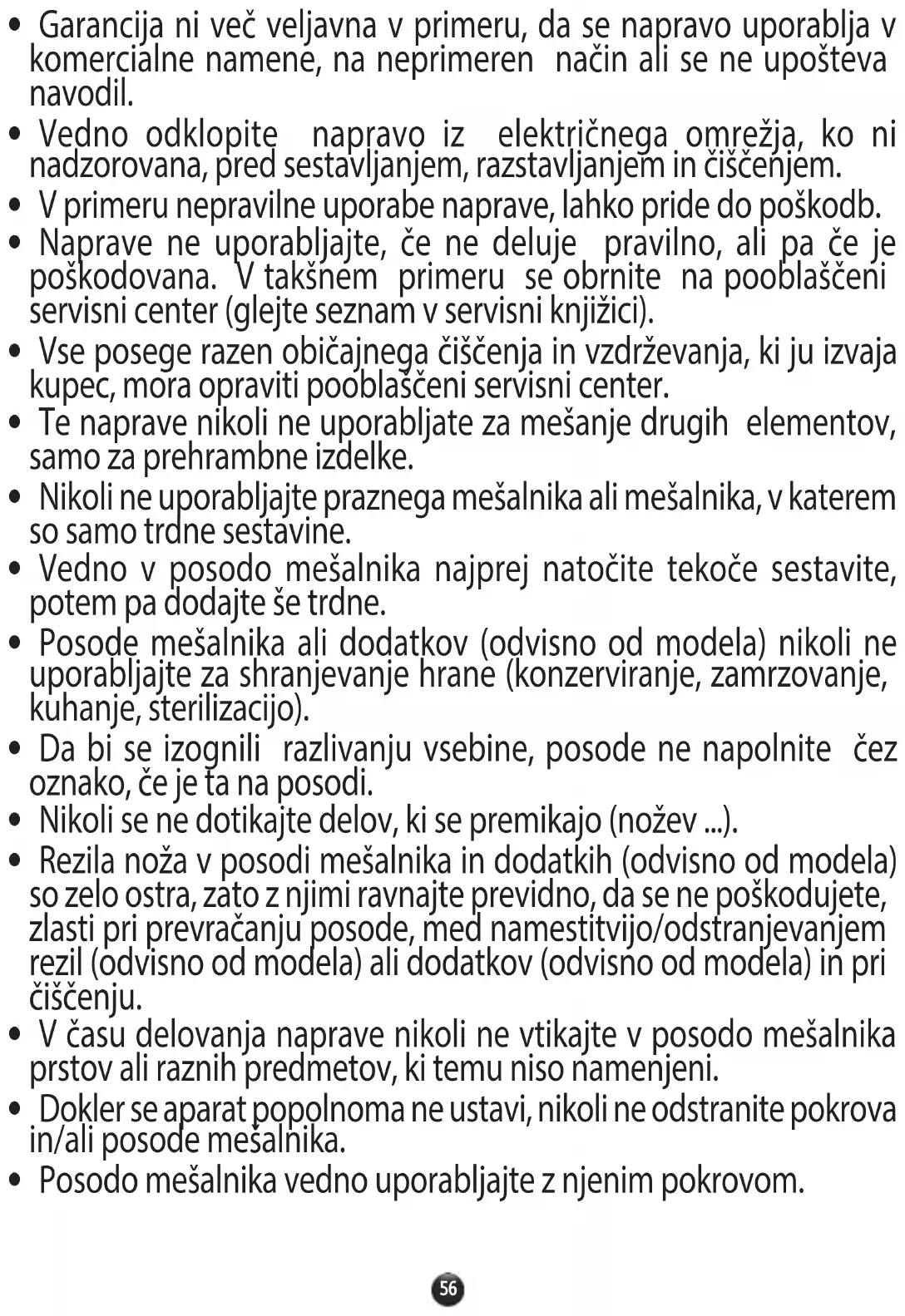 - Te naprave nikoli ne uporabljate za mešanje drugih elementov, samo za prehrambne izdelke.