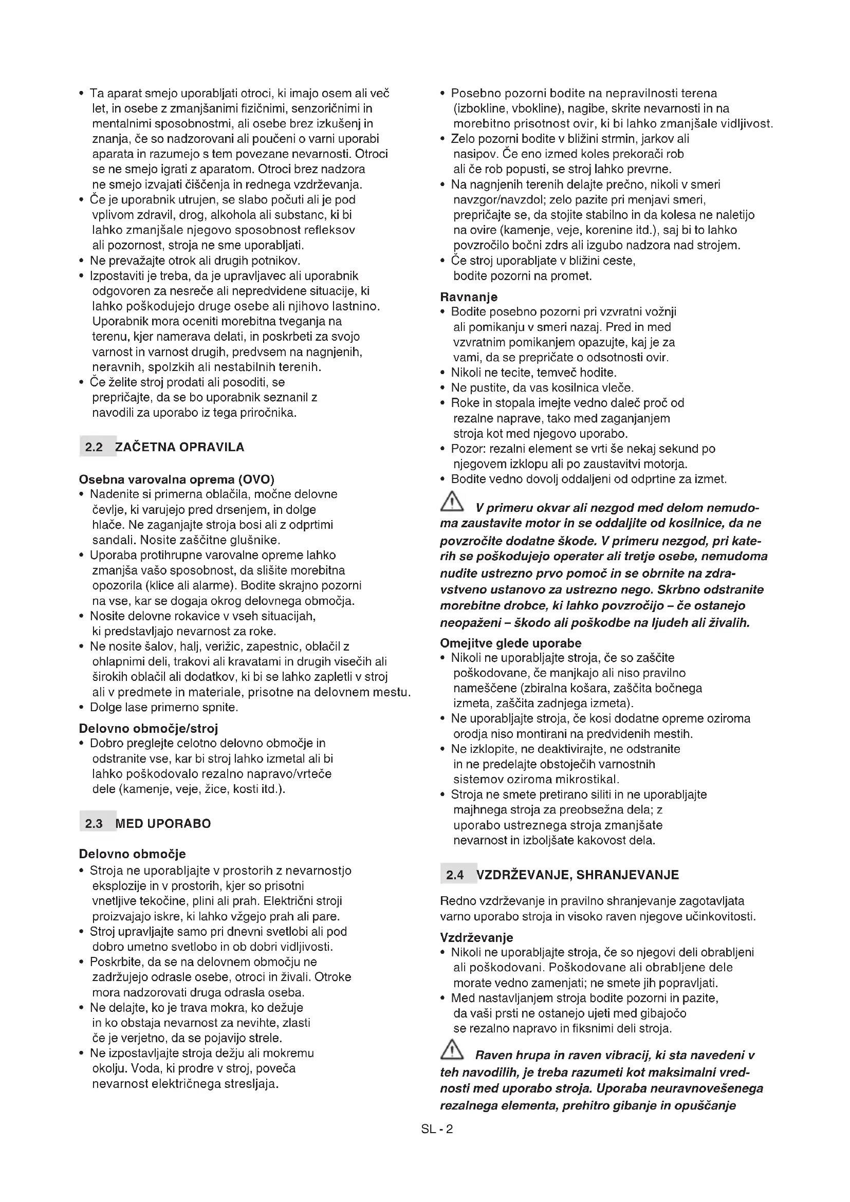 Katerakoli druga raba, ki se ne ujema z zgornjimi navedbami, je lahko nevarna in lahko povzroči poškodbe na ljudeh in/ali predmetih. K nepravilni uporabi spada (na primer, a ne samo): – Prevažati na stroju druge osebe, otroke ali živali, saj bi lahko padli in utrpeli hude poškodbe ali ovirali varno vožnjo. – Voziti se na stroju. – Uporabljati stroj za vleko ali potiskanje tovorov. – Zaganjati rezalno napravo na predelih brez trave. – Uporabljati kosilnico za zbiranje listja ali drugih ostankov. – Uporabljati stroj za ravnanje živih mej ali za košnjo drugega, ne travnatega rastlinja. – Uporaba stroja s strani več oseb.SL - 4 POMEMBNO V primeru neustrezne uporabe se garancija razveljavi, proizvajalec pa zavrača vsakršno odgovornost in prelaga na uporabnika vse stroške za škodo ali poškodbe njega samega ali drugih oseb.