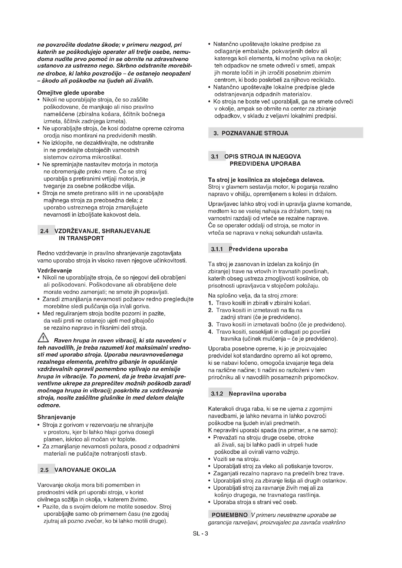 - Ne dotikajte se delov motorja, ki se med uporabo segrejejo. Nevarnost opeklin! V primeru okvar ali nezgod med delom nemudo- ma zaustavite motor in se oddaljite od kosilnice, daSL - 3 ne povzročite dodatne škode; v primeru nezgod, pri katerih se poškodujejo operater ali tretje osebe, nemu- doma nudite prvo pomoč in se obrnite na zdravstveno ustanovo za ustrezno nego. Skrbno odstranite morebit- ne drobce, ki lahko povzročijo – če ostanejo neopaženi – škodo ali poškodbe na ljudeh ali živalih. Omejitve glede uporabe