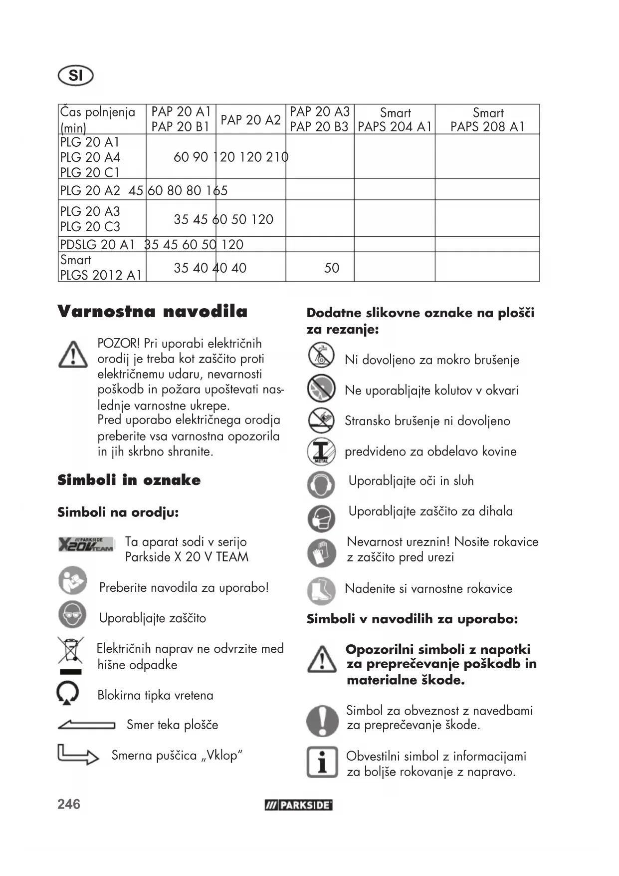 Dodatne slikovne oznake na plošči za rezanje: Ni dovoljeno za mokro brušenje Ne uporabljajte kolutov v okvari Stransko brušenje ni dovoljeno predvideno za obdelavo kovine Uporabljajteočiinsluh Uporabljajtezaščitozadihala Nevarnostureznin!Nositerokavice zzaščitopredurezi Nadenite si varnostne rokavice Simboli v navodilih za uporabo: Opozorilni simboli z napotki za preprečevanje poškodb in materialne škode. Simbol za obveznost z navedbami zapreprečevanješkode. Obvestilni simbol z informacijami za boljše rokovanje z napravo. Varnostna navodila POZOR!Priuporabielektričnih orodijjetrebakotzaščitoproti električnemuudaru,nevarnosti poškodbinpožaraupoštevatinas- lednje varnostne ukrepe. Preduporaboelektričnegaorodja preberite vsa varnostna opozorila in jih skrbno shranite. Simboli in oznake Simboli na orodju: Taaparatsodivserijo ParksideX20VTEAM Preberitenavodilazauporabo! Uporabljajtezaščito Električnihnapravneodvrzitemed hišne odpadke Blokirna tipka vretena Smertekaplošče Smernapuščica„Vklop“ Časpolnjenja (min) PAP20A1 PAP20B1 PAP20A2 PAP20A3 PAP20B3 Smart PAPS204A1 Smart PAPS208A1 PLG20A1 PLG20A4 PLG20C1
