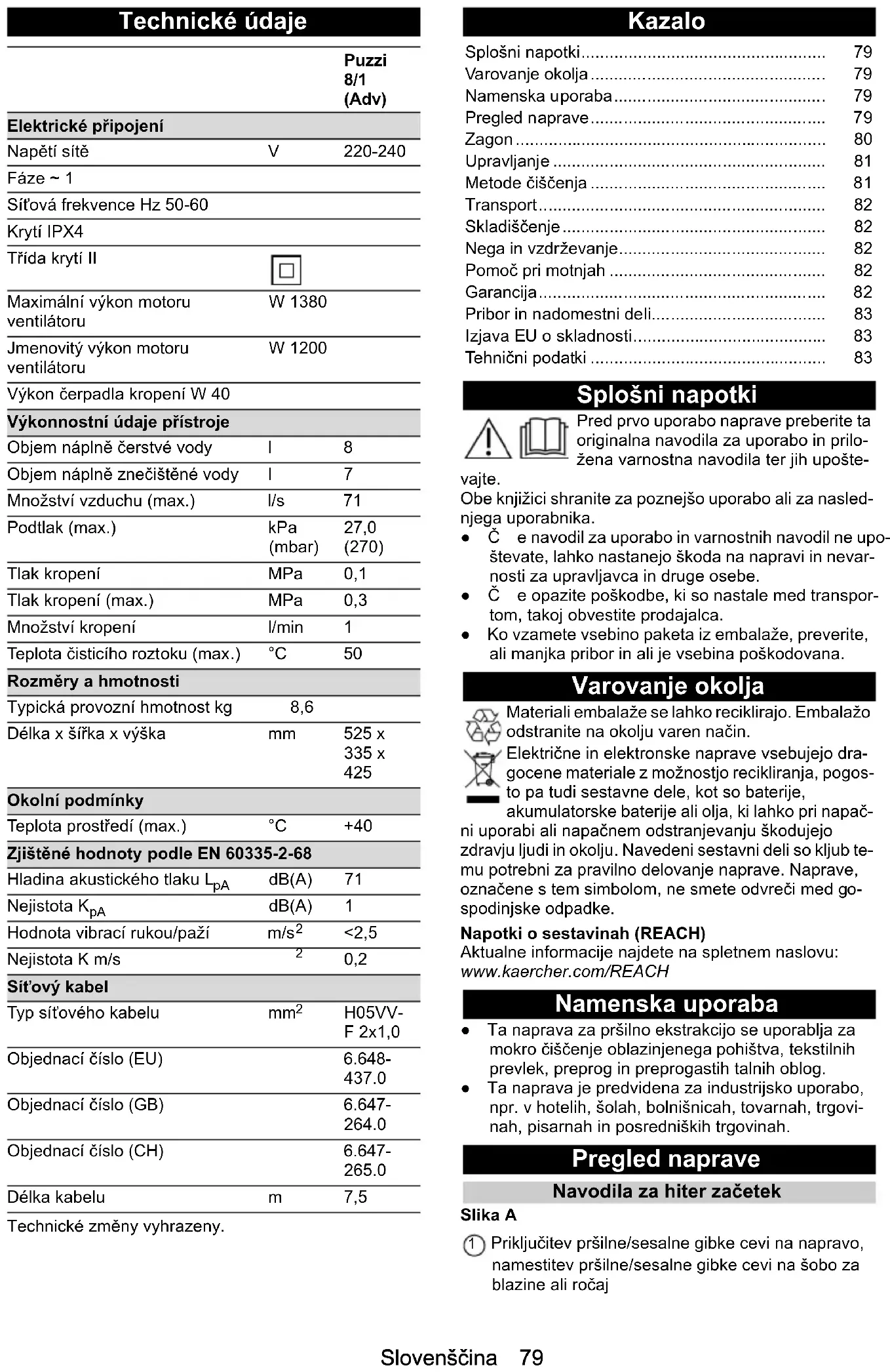 Podpisniki ravnajo po navodilih in s pooblastilom upra- ve. Pooblaščena oseba za dokumentacijo: S. Reiser Alfred Kärcher SE & Co. KG Alfred-Kärcher-Str. 28 - 40 71364 Winnenden (Nemčija) Tel.: +49 7195 14-0 Faks: +49 7195 14-2212 Winnenden, 2020/10/01 Tehnični podatki Pridržujemo si pravico do tehničnih sprememb. Puzzi 8/1 (Adv) Električni priključek Napetost omrežja V 220-240 Število faz ~ 1 Omrežna frekvenca Hz 50-60 Stopnja zaščite IPX4 Razred zaščite II Največja moč motorja ventilatorja W 1380 Nazivna moč motorja ventilatorja W 1200 Moč pršilne črpalke W 40 Podatki o zmogljivosti naprave Količina polnjenja sveže vode l 8 Količina polnjenja umazane vode l 7 Količina zraka (maks.) l/s 71 Podtlak (maks.) kPa (mbar) 27,0 (270) Pršilni tlak MPa 0,1 Pršilni tlak (najv.) MPa 0,3 Pršilna količina l/min 1 Temperatura raztopine čistila (najv.) °C 50 Mere in mase Tipična delovna masa kg 8,6 Dolžina x širina x višina mm 525 x 335 x
