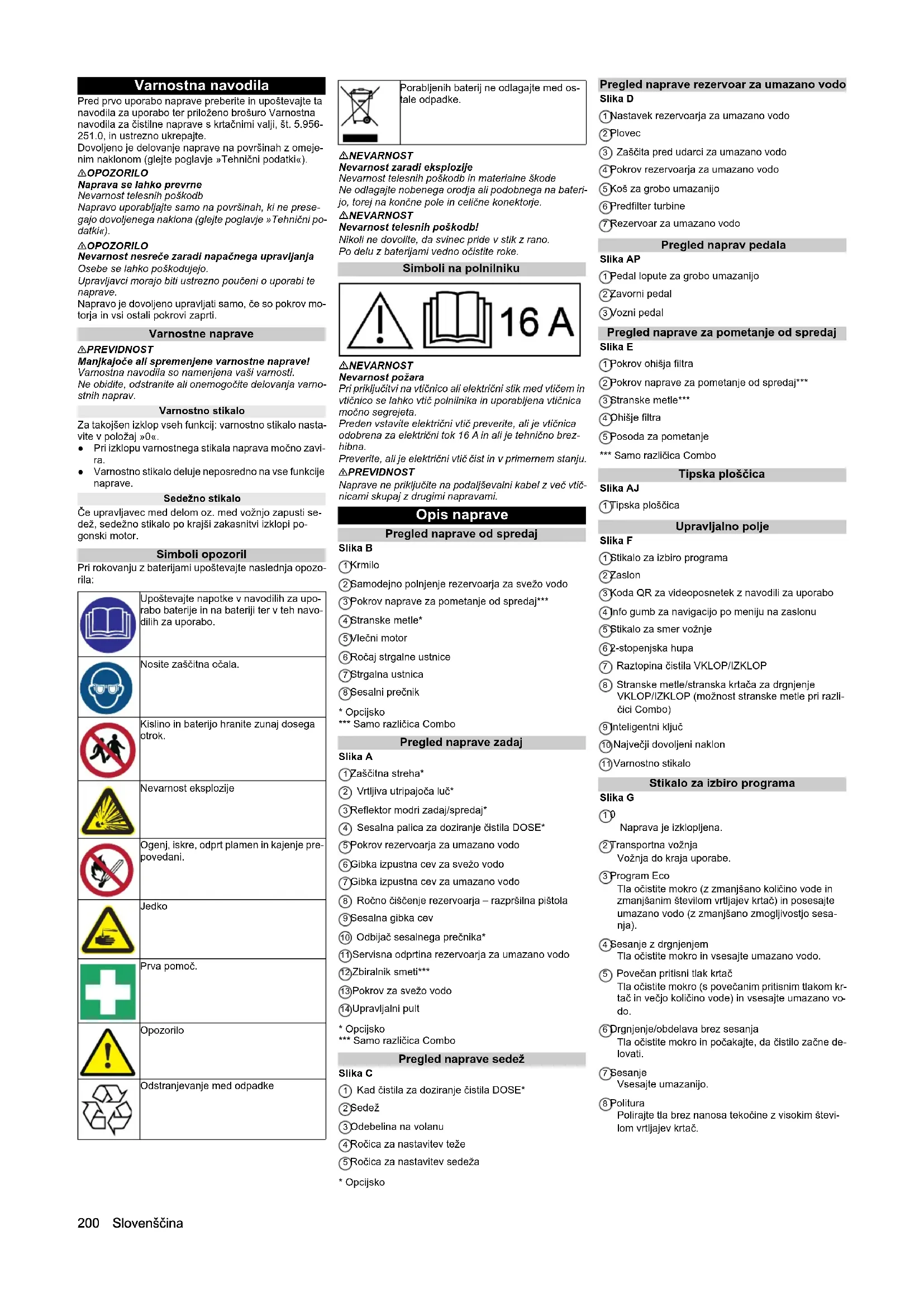 Naprava je izklopljena. 2 Transportna vožnja Vožnja do kraja uporabe. 3 Program Eco Tla očistite mokro (z zmanjšano količino vode in zmanjšanim številom vrtljajev krtač) in posesajte umazano vodo (z zmanjšano zmogljivostjo sesa- nja). 4 Sesanje z drgnjenjem Tla očistite mokro in vsesajte umazano vodo. 5 Povečan pritisni tlak krtač Tla očistite mokro (s povečanim pritisnim tlakom kr- tač in večjo količino vode) in vsesajte umazano vo- do. 6 Drgnjenje/obdelava brez sesanja Tla očistite mokro in počakajte, da čistilo začne de- lovati. 7 Sesanje Vsesajte umazanijo. 8 Politura Polirajte tla brez nanosa tekočine z visokim števi- lom vrtljajev krtač. Upoštevajte napotke v navodilih za upo- rabo baterije in na bateriji ter v teh navo- dilih za uporabo. Nosite zaščitna očala. Kislino in baterijo hranite zunaj dosega otrok. Nevarnost eksplozije Ogenj, iskre, odprt plamen in kajenje pre- povedani. Jedko Prva pomoč. Opozorilo Odstranjevanje med odpadke Porabljenih baterij ne odlagajte med os- tale odpadke.Slovenščina 201 Simboli na napravi
