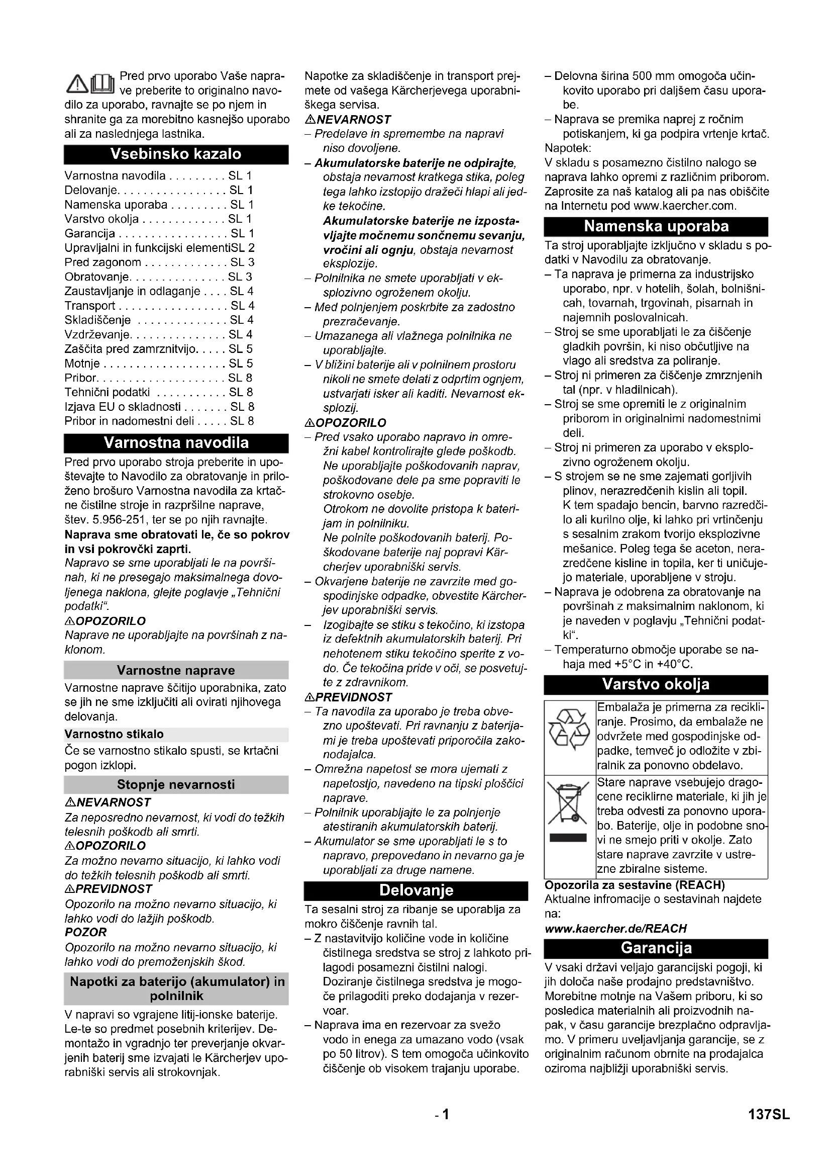 Chairman of the Board of Management Director Regulatory Affairs & Certification Příslušenství a náhradní díly 136 CS- 1 Pred prvo uporabo Vaše napra- ve preberite to originalno navo- dilo za uporabo, ravnajte se po njem in shranite ga za morebitno kasnejšo uporabo ali za naslednjega lastnika. Pred prvo uporabo stroja preberite in upo- števajte to Navodilo za obratovanje in prilo- ženo brošuro Varnostna navodila za krtač- ne čistilne stroje in razpršilne naprave, štev. 5.956-251, ter se po njih ravnajte. Naprava sme obratovati le, če so pokrov in vsi pokrovčki zaprti. Napravo se sme uporabljati le na površi- nah, ki ne presegajo maksimalnega dovo- ljenega naklona, glejte poglavje „Tehnični podatki“. 몇 OPOZORILO Naprave ne uporabljajte na površinah z na- klonom. Varnostne naprave ščitijo uporabnika, zato se jih ne sme izključiti ali ovirati njihovega delovanja. Če se varnostno stikalo spusti, se krtačni pogon izklopi. NEVARNOST Za neposredno nevarnost, ki vodi do težkih telesnih poškodb ali smrti. 몇 OPOZORILO Za možno nevarno situacijo, ki lahko vodi do težkih telesnih poškodb ali smrti. 몇 PREVIDNOST Opozorilo na možno nevarno situacijo, ki lahko vodi do lažjih poškodb. POZOR Opozorilo na možno nevarno situacijo, ki lahko vodi do premoženjskih škod. V napravi so vgrajene litij-ionske baterije. Le-te so predmet posebnih kriterijev. De- montažo in vgradnjo ter preverjanje okvar- jenih baterij sme izvajati le Kärcherjev upo- rabniški servis ali strokovnjak. Napotke za skladiščenje in transport prej- mete od vašega Kärcherjevega uporabni- škega servisa. NEVARNOST – Predelave in spremembe na napravi niso dovoljene. – Akumulatorske baterije ne odpirajte, obstaja nevarnost kratkega stika, poleg tega lahko izstopijo dražeči hlapi ali jed- ke tekočine. Akumulatorske baterije ne izposta- vljajte močnemu sončnemu sevanju, vročini ali ognju, obstaja nevarnost eksplozije. – Polnilnika ne smete uporabljati v ek- splozivno ogroženem okolju. – Med polnjenjem poskrbite za zadostno prezračevanje. – Umazanega ali vlažnega polnilnika ne uporabljajte. – V bližini baterije ali v polnilnem prostoru nikoli ne smete delati z odprtim ognjem, ustvarjati isker ali kaditi. Nevarnost ek- splozij. 몇 OPOZORILO – Pred vsako uporabo napravo in omre- žni kabel kontrolirajte glede poškodb. Ne uporabljajte poškodovanih naprav, poškodovane dele pa sme popraviti le strokovno osebje. Otrokom ne dovolite pristopa k bateri- jam in polnilniku. Ne polnite poškodovanih baterij. Po- škodovane baterije naj popravi Kär- cherjev uporabniški servis. – Okvarjene baterije ne zavrzite med go- spodinjske odpadke, obvestite Kärcher- jev uporabniški servis. – Izogibajte se stiku s tekočino, ki izstopa iz defektnih akumulatorskih baterij. Pri nehotenem stiku tekočino sperite z vo- do. Če tekočina pride v oči, se posvetuj- te z zdravnikom. 몇 PREVIDNOST – Ta navodila za uporabo je treba obve- zno upoštevati. Pri ravnanju z baterija- mi je treba upoštevati priporočila zako- nodajalca. – Omrežna napetost se mora ujemati z napetostjo, navedeno na tipski ploščici naprave. – Polnilnik uporabljajte le za polnjenje atestiranih akumulatorskih baterij. – Akumulator se sme uporabljati le s to napravo, prepovedano in nevarno ga je uporabljati za druge namene. Ta sesalni stroj za ribanje se uporablja za mokro čiščenje ravnih tal. – Z nastavitvijo količine vode in količine čistilnega sredstva se stroj z lahkoto pri- lagodi posamezni čistilni nalogi. Doziranje čistilnega sredstva je mogo- če prilagoditi preko dodajanja v rezer- voar. – Naprava ima en rezervoar za svežo vodo in enega za umazano vodo (vsak po 50 litrov). S tem omogoča učinkovito čiščenje ob visokem trajanju uporabe. – Delovna širina 500 mm omogoča učin- kovito uporabo pri daljšem času upora- be. – Naprava se premika naprej z ročnim potiskanjem, ki ga podpira vrtenje krtač. Napotek: V skladu s posamezno čistilno nalogo se naprava lahko opremi z različnim priborom. Zaprosite za naš katalog ali pa nas obiščite na Internetu pod www.kaercher.com. Ta stroj uporabljajte izključno v skladu s po- datki v Navodilu za obratovanje. – Ta naprava je primerna za industrijsko uporabo, npr. v hotelih, šolah, bolnišni- cah, tovarnah, trgovinah, pisarnah in najemnih poslovalnicah. – Stroj se sme uporabljati le za čiščenje gladkih površin, ki niso občutljive na vlago ali sredstva za poliranje. – Stroj ni primeren za čiščenje zmrznjenih tal (npr. v hladilnicah). – Stroj se sme opremiti le z originalnim priborom in originalnimi nadomestnimi deli. – Stroj ni primeren za uporabo v eksplo- zivno ogroženem okolju. – S strojem se ne sme zajemati gorljivih plinov, nerazredčenih kislin ali topil. K tem spadajo bencin, barvno razredči- lo ali kurilno olje, ki lahko pri vrtinčenju s sesalnim zrakom tvorijo eksplozivne mešanice. Poleg tega še aceton, nera- zredčene kisline in topila, ker ti uničuje- jo materiale, uporabljene v stroju. – Naprava je odobrena za obratovanje na površinah z maksimalnim naklonom, ki je naveden v poglavju „Tehnični podat- ki“. – Temperaturno območje uporabe se na- haja med +5°C in +40°C. Opozorila za sestavine (REACH) Aktualne infromacije o sestavinah najdete na: www.kaercher.de/REACH V vsaki državi veljajo garancijski pogoji, ki jih določa naše prodajno predstavništvo. Morebitne motnje na Vašem priboru, ki so posledica materialnih ali proizvodnih na- pak, v času garancije brezplačno odpravlja- mo. V primeru uveljavljanja garancije, se z originalnim računom obrnite na prodajalca oziroma najbližji uporabniški servis. Vsebinsko kazalo Varnostna navodila . . . . . . . . . SL 1 Delovanje. . . . . . . . . . . . . . . . . SL 1 Namenska uporaba . . . . . . . . . SL 1 Varstvo okolja . . . . . . . . . . . . . SL 1 Garancija . . . . . . . . . . . . . . . . . SL 1 Upravljalni in funkcijski elementiSL 2 Pred zag