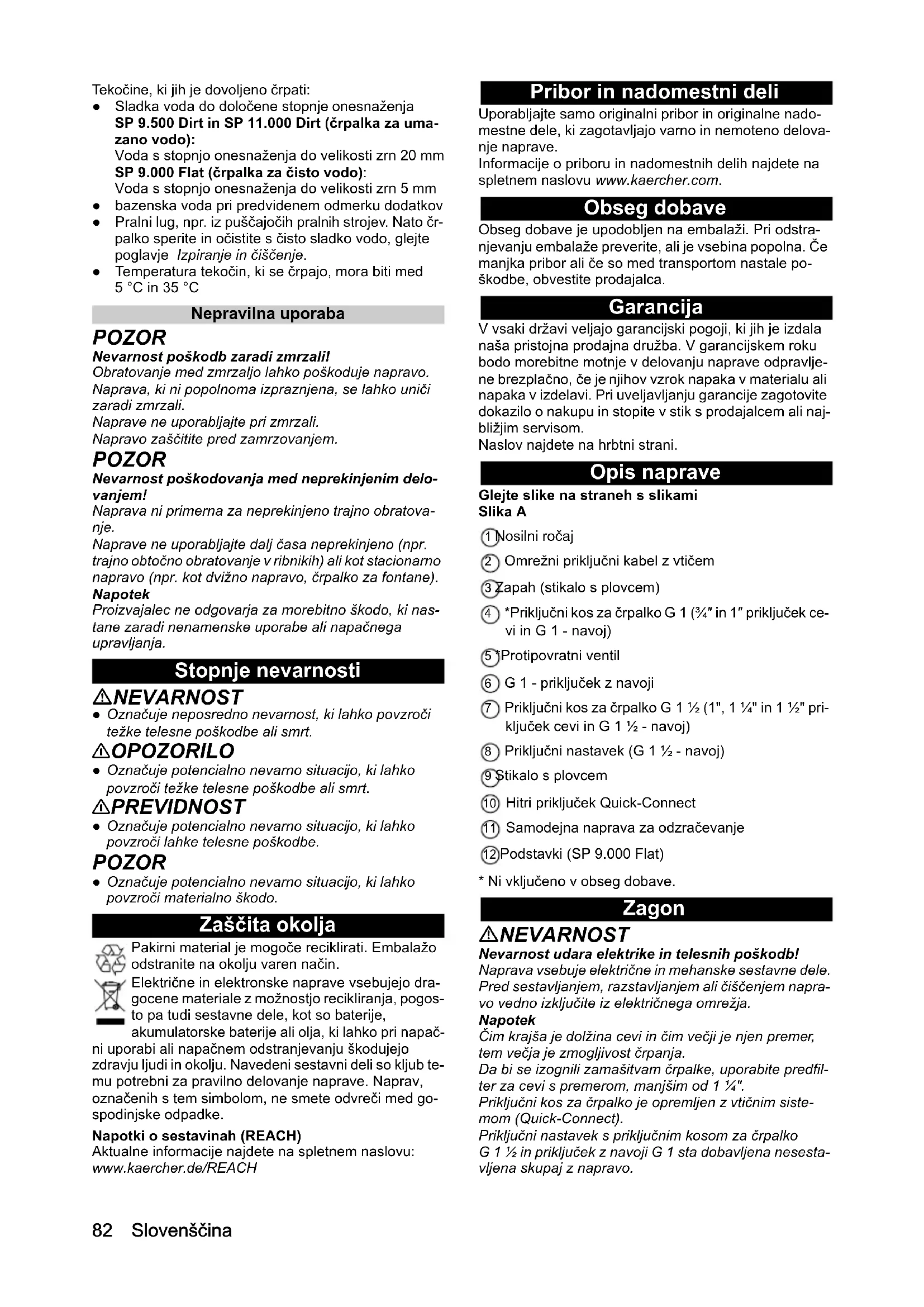 • Izjava EU o skladnosti Slovenščina Tekočine, ki jih je dovoljeno črpati: ● Sladka voda do določene stopnje onesnaženja SP 9.500 Dirt in SP 11.000 Dirt (črpalka za uma- zano vodo): Voda s stopnjo onesnaženja do velikosti zrn 20 mm SP 9.000 Flat (črpalka za čisto vodo): Voda s stopnjo onesnaženja do velikosti zrn 5 mm ● bazenska voda pri predvidenem odmerku dodatkov ● Pralni lug, npr. iz puščajočih pralnih strojev. Nato čr- palko sperite in očistite s čisto sladko vodo, glejte poglavje Izpiranje in čiščenje. ● Temperatura tekočin, ki se črpajo, mora biti med 5 °C in 35 °C Nepravilna uporaba POZOR Nevarnost poškodb zaradi zmrzali! Obratovanje med zmrzaljo lahko poškoduje napravo. Naprava, ki ni popolnoma izpraznjena, se lahko uniči zaradi zmrzali. Naprave ne uporabljajte pri zmrzali. Napravo zaščitite pred zamrzovanjem. POZOR Nevarnost poškodovanja med neprekinjenim delo- vanjem! Naprava ni primerna za neprekinjeno trajno obratova- nje. Naprave ne uporabljajte dalj časa neprekinjeno (npr. trajno obtočno obratovanje v ribnikih) ali kot stacionarno napravo (npr. kot dvižno napravo, črpalko za fontane). Napotek Proizvajalec ne odgovarja za morebitno škodo, ki nas- tane zaradi nenamenske uporabe ali napačnega upravljanja. Stopnje nevarnosti NEVARNOST ● Označuje neposredno nevarnost, ki lahko povzroči težke telesne poškodbe ali smrt. 몇 OPOZORILO ● Označuje potencialno nevarno situacijo, ki lahko povzroči težke telesne poškodbe ali smrt. 몇 PREVIDNOST ● Označuje potencialno nevarno situacijo, ki lahko povzroči lahke telesne poškodbe. POZOR ● Označuje potencialno nevarno situacijo, ki lahko povzroči materialno škodo. Zaščita okolja Pakirni material je mogoče reciklirati. Embalažo odstranite na okolju varen način. Električne in elektronske naprave vsebujejo dra- gocene materiale z možnostjo recikliranja, pogos- to pa tudi sestavne dele, kot so baterije, akumulatorske baterije ali olja, ki lahko pri napač- ni uporabi ali napačnem odstranjevanju škodujejo zdravju ljudi in okolju. Navedeni sestavni deli so kljub te- mu potrebni za pravilno delovanje naprave. Naprav, označenih s tem simbolom, ne smete odvreči med go- spodinjske odpadke. Napotki o sestavinah (REACH) Aktualne informacije najdete na spletnem naslovu: www.kaercher.de/REACH Pribor in nadomestni deli Uporabljajte samo originalni pribor in originalne nado- mestne dele, ki zagotavljajo varno in nemoteno delova- nje naprave. Informacije o priboru in nadomestnih delih najdete na spletnem naslovu www.kaercher.com. Obseg dobave Obseg dobave je upodobljen na embalaži. Pri odstra- njevanju embalaže preverite, ali je vsebina popolna. Če manjka pribor ali če so med transportom nastale po- škodbe, obvestite prodajalca. Garancija V vsaki državi veljajo garancijski pogoji, ki jih je izdala naša pristojna prodajna družba. V garancijskem roku bodo morebitne motnje v delovanju naprave odpravlje- ne brezplačno, če je njihov vzrok napaka v materialu ali napaka v izdelavi. Pri uveljavljanju garancije zagotovite dokazilo o nakupu in stopite v stik s prodajalcem ali naj- bližjim servisom. Naslov najdete na hrbtni strani. Opis naprave Glejte slike na straneh s slikami Slika A 1 Nosilni ročaj 2 Omrežni priključni kabel z vtičem 3 Zapah (stikalo s plovcem) 4 *Priključni kos za črpalko G 1 (¾″ in 1″ priključek ce- vi in G 1 - navoj) 5 *Protipovratni ventil 6 G 1 - priključek z navoji 7 Priključni kos za črpalko G 1 ½ (1", 1 ¼" in 1 ½" pri- ključek cevi in G 1 ½ - navoj) 8 Priključni nastavek (G 1 ½ - navoj) 9 Stikalo s plovcem 10 Hitri priključek Quick-Connect 11 Samodejna naprava za odzračevanje 12 Podstavki (SP 9.000 Flat) p. 8582