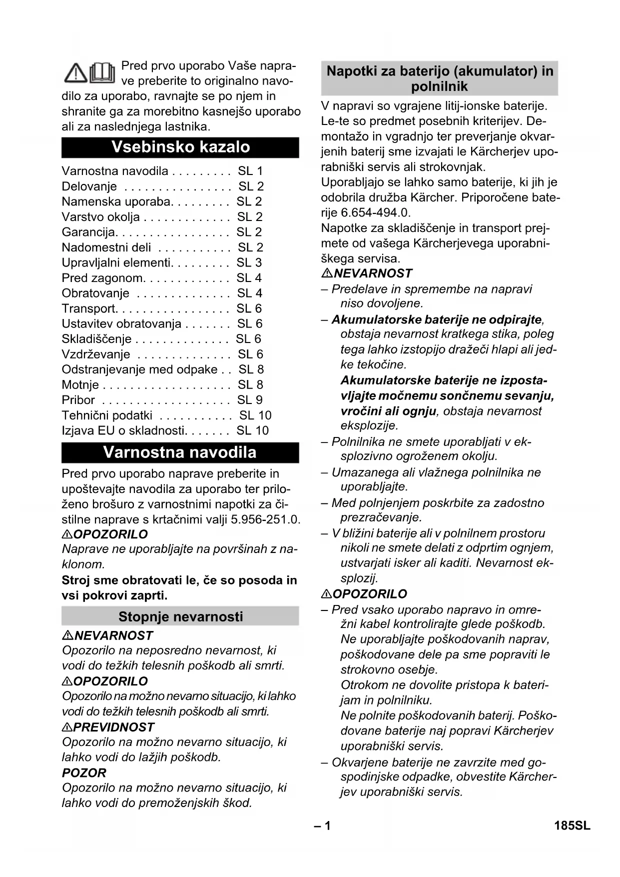 dB(A) 85 183CS– 11 Tímto prohlašujeme, že níže označené stroje odpovídají jejich základní koncepcí a konstrukčním provedením, stejně jako námi do provozu uvedenými konkrétními provedeními, příslušným zásadním poža- davkům o bezpečnosti a ochraně zdraví směrnic EU. Při jakýchkoli na stroji prove- dených změnách, které nebyly námi od- souhlaseny, pozbývá toto prohlášení svou platnost. Níže podepsaní jednají z pověření a se zpl- nomocněním představenstva společnosti. Zplnomocněná osoba pro sestavení doku- mentace: S. Reiser Alfred Kärcher SE & Co. KG Alfred-Kärcher-Straße 28-40 71364 Winnenden (Germany) Tel.: +49 7195 14-0 Fax: +49 7195 14-2212 Winnenden, 2021/02/01 EU prohlášení o shodě Výrobek: Stroj na drhnutí s vysáváním Typ: 1.783-xxx Příslušné směrnice EU: 2006/42/ES (+2009/127/ES) 2014/30/EU 2011/65/EU 2014/53/EU (TCU) Použité harmonizační normy EN 60335–1 EN 60335–2–72 EN 60335-2-29 EN 55012: 2007 + A1: 2009 EN 55014-1:2006 + A1: 2009 + A2:2011 EN 55014–2: 1997 + A1: 2001 + A2: 2008 EN 61000–3–2: 2014 EN 61000–3–3: 2013 EN 61000–6–2: 2005 EN 62233: 2008 EN IEC 63000: 2018 Použité národní normy TCU EN 301 511 V12.5.1 EN 300 440 V2.1.1 EN 300 328 V2.2.2 EN 300 330 V2.1.1 Chairman of the Board of Management Director Regulatory Affairs & Certification 184 CS– 1 Pred prvo uporabo Vaše napra- ve preberite to originalno navo- dilo za uporabo, ravnajte se po njem in shranite ga za morebitno kasnejšo uporabo ali za naslednjega lastnika. Pred prvo uporabo naprave preberite in upoštevajte navodila za uporabo ter prilo- ženo brošuro z varnostnimi napotki za či- stilne naprave s krtačnimi valji 5.956-251.0. 몇 OPOZORILO Naprave ne uporabljajte na površinah z na- klonom. Stroj sme obratovati le, če so posoda in vsi pokrovi zaprti. NEVARNOST Opozorilo na neposredno nevarnost, ki vodi do težkih telesnih poškodb ali smrti. 몇 OPOZORILO Opozorilo na možno nevarno situacijo, ki lahko vodi do težkih telesnih poškodb ali smrti. 몇 PREVIDNOST Opozorilo na možno nevarno situacijo, ki lahko vodi do lažjih poškodb. POZOR Opozorilo na možno nevarno situacijo, ki lahko vodi do premoženjskih škod. V napravi so vgrajene litij-ionske baterije. Le-te so predmet posebnih kriterijev. De- montažo in vgradnjo ter preverjanje okvar- jenih baterij sme izvajati le Kärcherjev upo- rabniški servis ali strokovnjak. Uporabljajo se lahko samo baterije, ki jih je odobrila družba Kärcher. Priporočene bate- rije 6.654-494.0. Napotke za skladiščenje in transport prej- mete od vašega Kärcherjevega uporabni- škega servisa. NEVARNOST – Predelave in spremembe na napravi niso dovoljene. – Akumulatorske baterije ne odpirajte, obstaja nevarnost kratkega stika, poleg tega lahko izstopijo dražeči hlapi ali jed- ke tekočine. Akumulatorske baterije ne izposta- vljajte močnemu sončnemu sevanju, vročini ali ognju, obstaja nevarnost eksplozije. – Polnilnika ne smete uporabljati v ek- splozivno ogroženem okolju. – Umazanega ali vlažnega polnilnika ne uporabljajte. – Med polnjenjem poskrbite za zadostno prezračevanje. – V bližini baterije ali v polnilnem prostoru nikoli ne smete delati z odprtim ognjem, ustvarjati isker ali kaditi. Nevarnost ek- splozij. 몇 OPOZORILO – Pred vsako uporabo napravo in omre- žni kabel kontrolirajte glede poškodb. Ne uporabljajte poškodovanih naprav, poškodovane dele pa sme popraviti le strokovno osebje. Otrokom ne dovolite pristopa k bateri- jam in polnilniku. Ne polnite poškodovanih baterij. Poško- dovane baterije naj popravi Kärcherjev uporabniški servis. – Okvarjene baterije ne zavrzite med go- spodinjske odpadke, obvestite Kärcher- jev uporabniški servis. Vsebinsko kazalo Varnostna navodila . . . . . . . . . SL 1 Delovanje . . . . . . . . . . . . . . . . SL 2 Namenska uporaba. . . . . . . . . SL 2 Varstvo okolja . . . . . . . . . . . . . SL 2 Garancija. . . . . . . . . . . . . . . . . SL 2 Nadomestni deli . . . . . . . . . . . SL 2 Upravljalni elementi. . . . . . . . . SL 3 Pred zagonom. . . . . . . . . . . . . SL 4 Obratovanje . . . . . . . . . . . . . . SL 4 Transport. . . . . . . . . . . . . . . . . SL 6 Ustavitev obratovanja . . . . . . . SL 6 Skladiščenje . . . . . . . . . . . . . . SL 6 Vzdrževanje . . . . . . . . . . . . . . SL 6 Odstranjevanje med odpake . . SL 8 Motnje . . . . . . . . . . . . . . . . . . . SL 8 Pribor . . . . . . . . . . . . . . . . . . . SL 9 Tehnični podatki . . . . . . . . . . . SL 10 Izjava EU o skladnosti. . . . . . . SL 10 Varnostna navodila Stopnje nevarnosti Napotki za baterijo (akumulator) in polnilnik 185SL– 2 – Izogibajte se stiku s tekočino, ki izstopa iz defektnih akumulatorskih baterij. Pri nehotenem stiku tekočino sperite z vo- do. Če tekočina pride v oči, se posvetuj- te z zdravnikom. 몇 PREVIDNOST – Ta navodila za uporabo je treba obve- zno upoštevati. Pri ravnanju z baterija- mi je treba upoštevati priporočila zako- nodajalca. – Omrežna napetost se mora ujemati z napetostjo, navedeno na tipski ploščici naprave. – Polnilnik uporabljajte le za polnjenje atestiranih akumulatorskih baterij. – Akumulator se sme uporabljati le s to napravo, prepovedano in nevarno ga je uporabljati za druge namene. Če se varnostno stikalo spusti, se krtačni pogon izklopi. Ta sesalni stroj za ribanje se uporablja za mokro čiščenje ravnih tal. Z nastavljanjem količine vode se lahko eno- stavno prilagodi posamezni čistilni nalogi. Delovna širina 380 mm in prostornina re- zervoarjev za svežo in umazano vodo po 12 l omogočata učinkovito čiščenje ob viso- kem trajanju uporabe. Baterije se lahko s pomočjo vgrajenega polnilnika polnijo na 230-V vtičnici. Ta naprava je primerna za industrijsko upo- rabo, npr. v hotelih, šolah, bolnišnicah, to- varnah, trgovinah, pisarnah in najemnih po- slovalnicah. Ta stroj uporabljajte izključno v skladu s po- datki v Navodilu za obratovanje. 