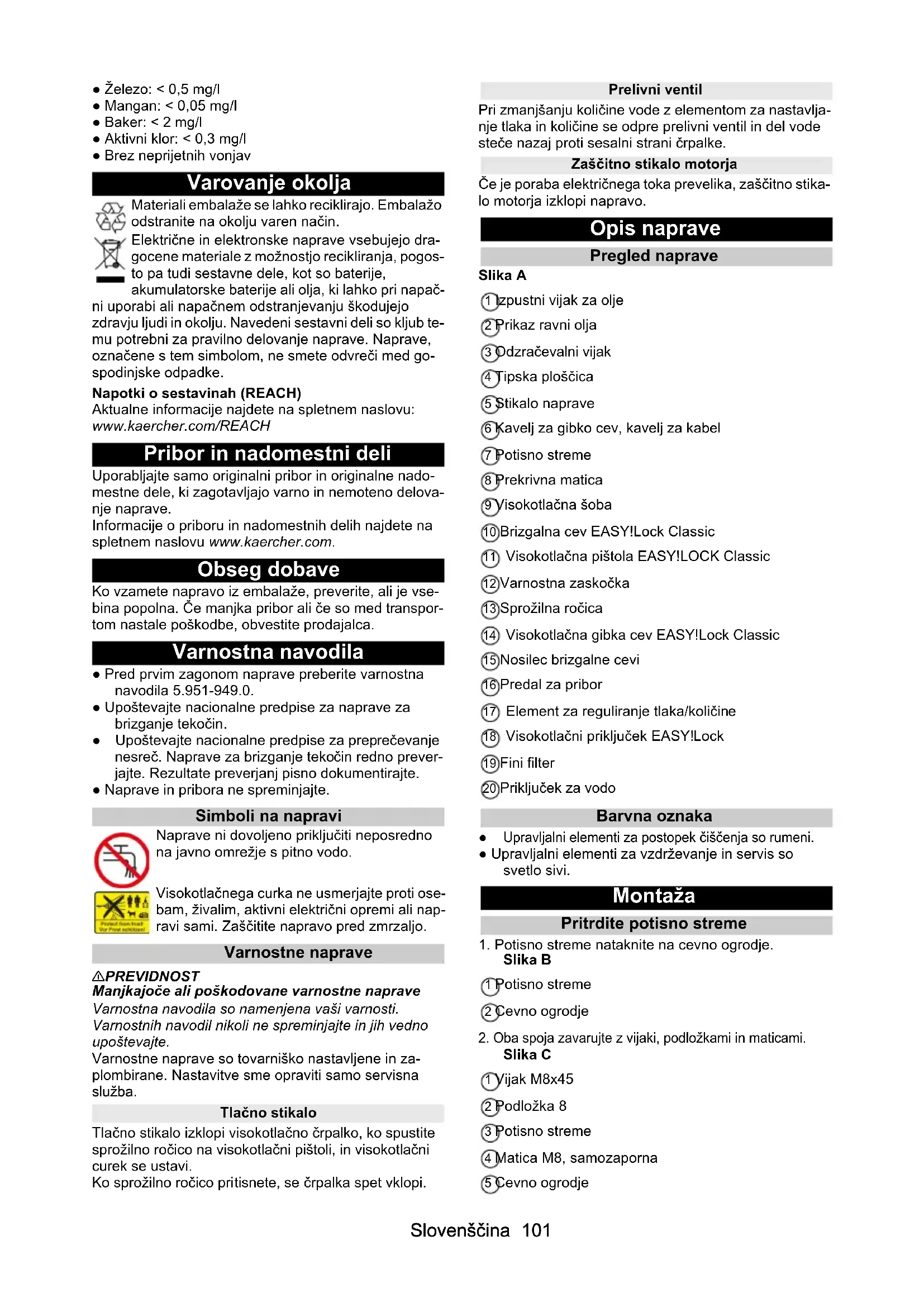 Použitý postup k posouzení shody 2000/14/ES: Příloha V Hladina akustického výkonu dB(A) HD 10/21-4 S Classic Naměřeno: 84 Zaručeno: 86 HD 13/18-4 S Classic Naměřeno: 89 Zaručeno: 91 HD 10/25-4 S Classic Naměřeno: 89 Zaručeno: 91 HD 17/15-4 S Classic Naměřeno: 91 Zaručeno: 93 Níže podepsaní jednají z pověření a se zplnomocněním představenstva společnosti. Zmocněnec pro dokumentaci: S. Reiser Alfred Kärcher SE & Co. KG Alfred-Kärcher-Str. 28 - 40 71364 Winnenden (Německo) Tel.: +49 7195 14-0 Fax: +49 7195 14-2212 Winnenden, 2022/08/01 Kazalo Splošna navodila Pred prvo uporabo naprave preberite ta originalna navodila za uporabo in prilo- žena varnostna navodila ter jih upošte- vajte. Obe knjižici shranite za poznejšo uporabo ali za nasled- njega uporabnika. Namenska uporaba Ta visokotlačni čistilnik uporabljajte izključno za na- slednja dela: ●čiščenje z visokotlačnim curkom brez čistila (npr. za fasade, terase, vrtne naprave) ●Čiščenje z nizkotlačnim curkom in čistilom z razpr- šilnikom za peno, ki je na voljo kot pribor (npr. strojev, vozil, konstrukcij, orodij) Za trdovratno onesnaženje priporočamo šobo rotorja kot poseben pribor. Napravo lahko upravljate le, če stoji na ravni podlagi. Če naprava stoji pod kotom, se lahko visokotlačna črpalka poškoduje zaradi nezadostnega mazanja. Naprave ne smete uporabljati s priborom za servo krmi- ljenje. Mejne vrednosti za oskrbo z vodo POZOR Onesnažena voda Predčasna obraba ali usedline v napravi Napravo oskrbujte samo s čisto vodo ali reciklirano vo- do, ki ne prekoračuje mejnih vrednosti. Glede oskrbe z vodo veljajo naslednje mejne vrednosti: ● pH-vrednost: 6,5–9,5 ● Električna prevodnost: prevodnost sveže vode + 1200 µS/cm, maksimalna prevodnost 2000 µS/