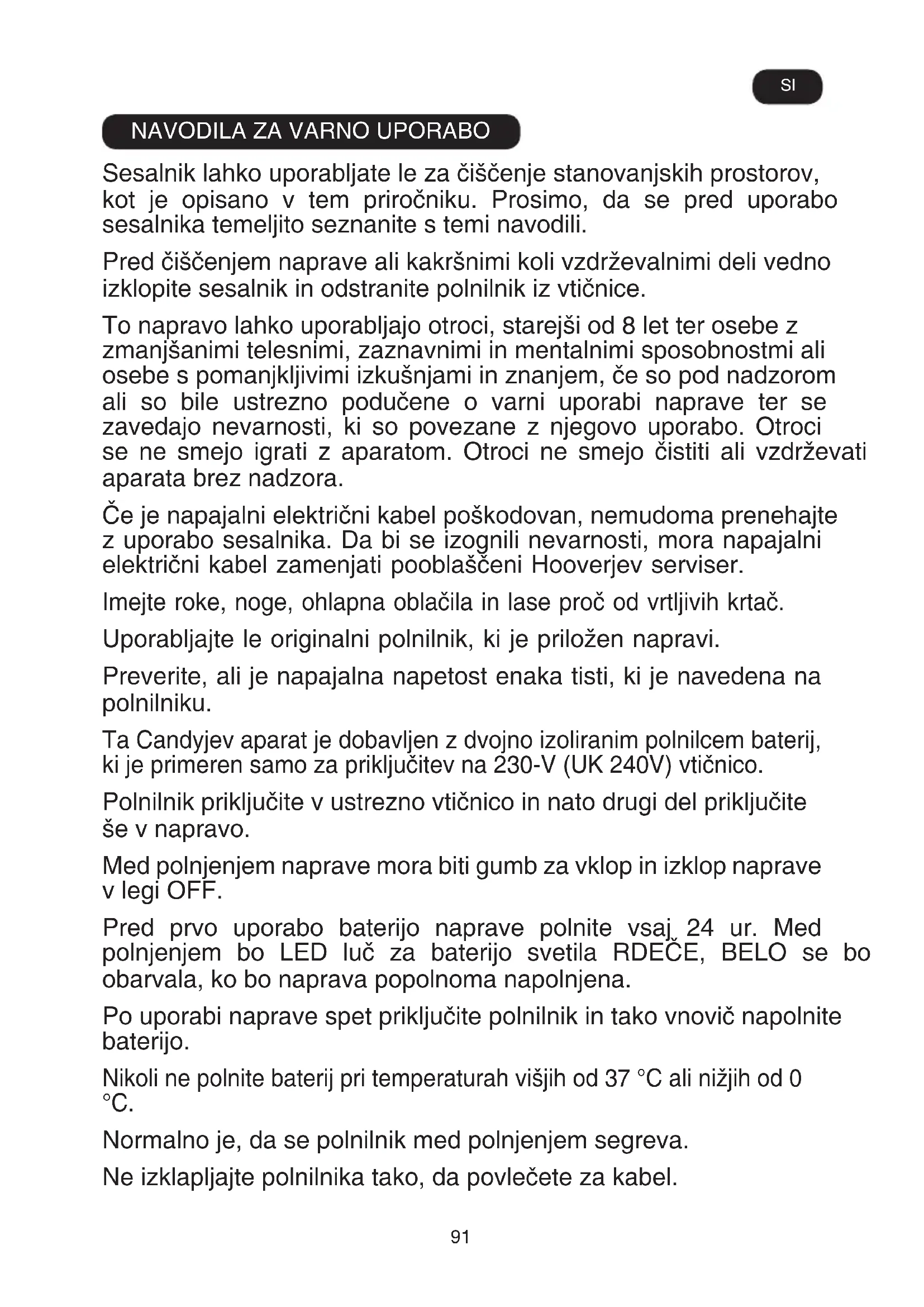 Sesalnik lahko uporabljate le za čiščenje stanovanjskih prostorov, kot je opisano v tem priročniku. Prosimo, da se pred uporabo sesalnika temeljito seznanite s temi navodili. Pred čiščenjem naprave ali kakršnimi koli vzdrževalnimi deli vedno izklopite sesalnik in odstranite polnilnik iz vtičnice. To napravo lahko uporabljajo otroci, starejši od 8 let ter osebe z zmanjšanimi telesnimi, zaznavnimi in mentalnimi sposobnostmi ali osebe s pomanjkljivimi izkušnjami in znanjem, če so pod nadzorom ali so bile ustrezno podučene o varni uporabi naprave ter se zavedajo nevarnosti, ki so povezane z njegovo uporabo. Otroci se ne smejo igrati z aparatom. Otroci ne smejo čistiti ali vzdrževati aparata brez nadzora. Če je napajalni električni kabel poškodovan, nemudoma prenehajte z uporabo sesalnika. Da bi se izognili nevarnosti, mora napajalni električni kabel zamenjati pooblaščeni Hooverjev serviser. Imejte roke, noge, ohlapna oblačila in lase proč od vrtljivih krtač. Uporabljajte le originalni polnilnik, ki je priložen napravi. Preverite, ali je napajalna napetost enaka tisti, ki je navedena na polnilniku. Ta Candyjev aparat je dobavljen z dvojno izoliranim polnilcem baterij, ki je primeren samo za priključitev na 230-V (UK 240V) vtičnico. Polnilnik priključite v ustrezno vtičnico in nato drugi del priključite še v napravo. Med polnjenjem naprave mora biti gumb za vklop in izklop naprave v legi OFF. Pred prvo uporabo baterijo naprave polnite vsaj 24 ur. Med polnjenjem bo LED luč za baterijo svetila RDEČE, BELO se bo obarvala, ko bo naprava popolnoma napolnjena. Po uporabi naprave spet priključite polnilnik in tako vnovič napolnite baterijo. Nikoli ne polnite baterij pri temperaturah višjih od 37 °C ali nižjih od 0 °C. Normalno je, da se polnilnik med polnjenjem segreva. Ne izklapljajte polnilnika tako, da povlečete za kabel. SI92 Polnilec izklopite v primeru daljše odsotnosti (počitnice, itd.). Pred ponovno uporabo spet napolnite baterije, saj se lahko te izpraznijo samodejno, če sesalnika dlje časa ne uporabljate. Če boste napravo odvrgli, morate najprej odstraniti baterije. Ko želite odstraniti baterije, mora biti naprava izključena iz električnega toka. Baterije odvrzite na varen način. Napravo pustite delovati dokler baterije niso popolnoma prazne. Uporabljene baterije je treba odnesti v enoto za recikliranje. Baterije se ne smejo odvreči v gospodinjske odpadke. Za odstranitev baterij vas prosimo, da se obrnete na Hooverjev center za kupce ali nadaljujete po sledečih navodilih. POMEMBNO: Pred odstranjevanjem baterije vedno popolnoma izpraznite. Sesalnik naj deluje toliko časa, da se baterije do konca izpraznijo. Vtikač polnilca odstranite iz naprave. Pritisnite na gumbe za odstranitev baterije in jo odstranite tako, da jo potegnete vstran. [11] OPOMBA: V primeru težav z razstavljanjem naprave ali za podrobnejše informacije o ravnanju z izdelkom, obnovi ali recikliranju izdelka se obrnite na krajevni urad ali komunalno podjetje za odvoz gospodinjskih odpadkov. Uporabljajte le dodatke, potrošni material ali nadomestne dele, ki jih priporoča ali dobavi Hoover. Statična elektrika: Določene vrste preprog lahko ustvarijo manjšo količino statične elektrike. Noben statični električni naboj ne ogroža zdravja. Sesalnika ne smete uporabljati na prostem, na kakršni koli mokri površini ali za sesanje tekočin. Ne smete sesati trdih ali ostrih predmetov, vžigalic, vročega pepela, cigaretnih ogorkov ali drugih podobnih snovi. Ne smete pršiti ali sesati vnetljivih tekočin, čistil, osvežilcev zraka ali njihovih hlapov. Ne smete zapeljati prek napajalnega kabla med uporabo sesalnika ali izvleči vtikača tako, da bi vlekli za kabel. Ne smete uporabljati naprave ali polnilnika, če ne delujeta pravilno. Hooverjev servis: Za zagotovitev nenehnega varnega in učinkovitega delovanja naprave priporočamo, da servis ali popravila izvrši le pooblaščeni Hooverjev serviser.