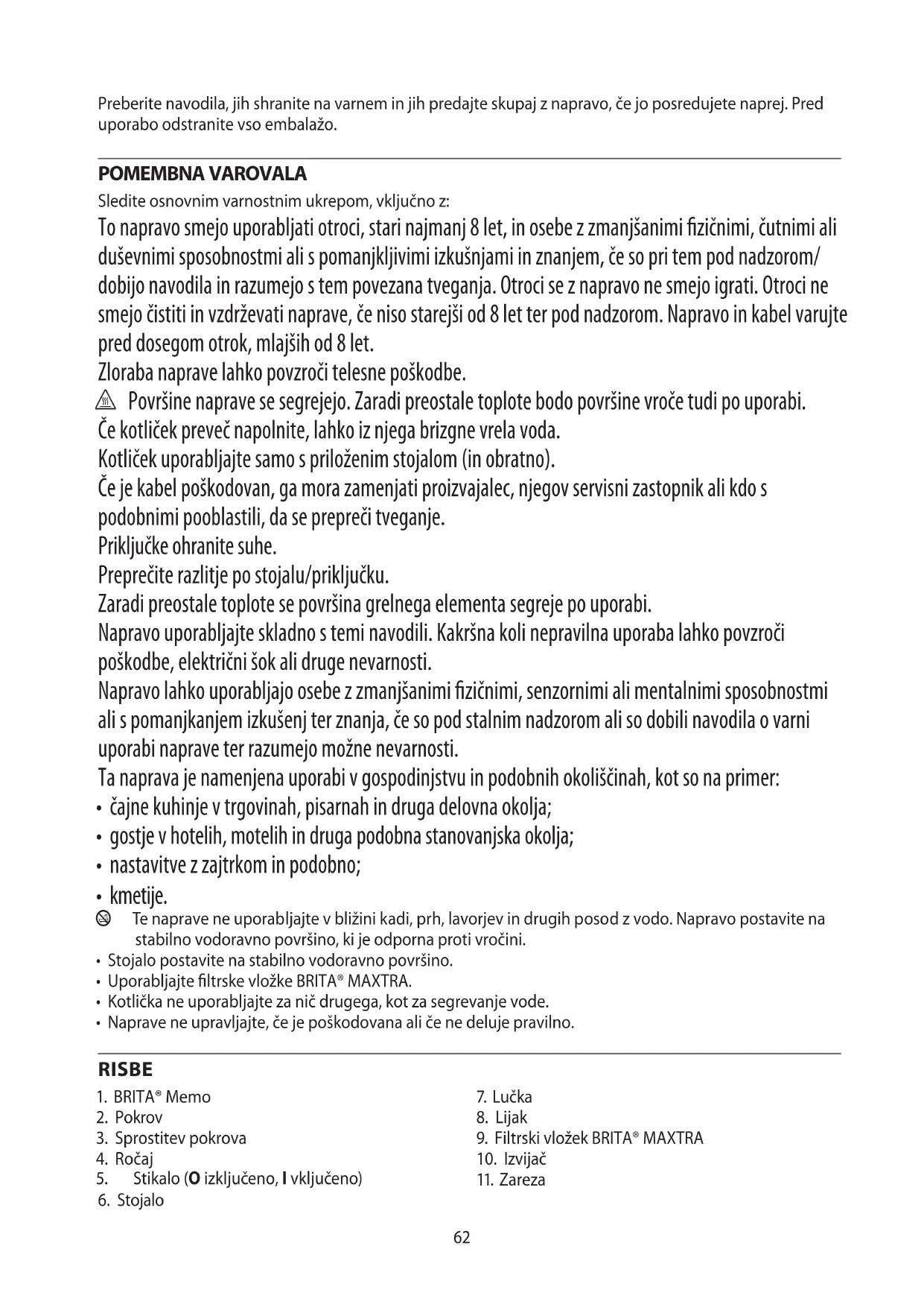AE62 Preberite navodila, jih shranite na varnem in jih predajte skupaj z napravo, če jo posredujete naprej. Pred uporabo odstranite vso embalažo. POMEMBNA VAROVALA Sledite osnovnim varnostnim ukrepom, vključno z: To napravo smejo uporabljati otroci, stari najmanj 8 let, in osebe z zmanjšanimi fizičnimi, čutnimi ali duševnimi sposobnostmi ali s pomanjkljivimi izkušnjami in znanjem, če so pri tem pod nadzorom/ dobijo navodila in razumejo s tem povezana tveganja. Otroci se z napravo ne smejo igrati. Otroci ne smejo čistiti in vzdrževati naprave, če niso starejši od 8 let ter pod nadzorom. Napravo in kabel varujte pred dosegom otrok, mlajših od 8 let. Zloraba naprave lahko povzroči telesne poškodbe. h Površine naprave se segrejejo. Zaradi preostale toplote bodo površine vroče tudi po uporabi. Če kotliček preveč napolnite, lahko iz njega brizgne vrela voda. Kotliček uporabljajte samo s priloženim stojalom (in obratno). Če je kabel poškodovan, ga mora zamenjati proizvajalec, njegov servisni zastopnik ali kdo s podobnimi pooblastili, da se prepreči tveganje. Priključke ohranite suhe. Preprečite razlitje po stojalu/priključku. Zaradi preostale toplote se površina grelnega elementa segreje po uporabi. Napravo uporabljajte skladno s temi navodili. Kakršna koli nepravilna uporaba lahko povzroči poškodbe, električni šok ali druge nevarnosti. Napravo lahko uporabljajo osebe z zmanjšanimi fizičnimi, senzornimi ali mentalnimi sposobnostmi ali s pomanjkanjem izkušenj ter znanja, če so pod stalnim nadzorom ali so dobili navodila o varni uporabi naprave ter razumejo možne nevarnosti. Ta naprava je namenjena uporabi v gospodinjstvu in podobnih okoliščinah, kot so na primer: