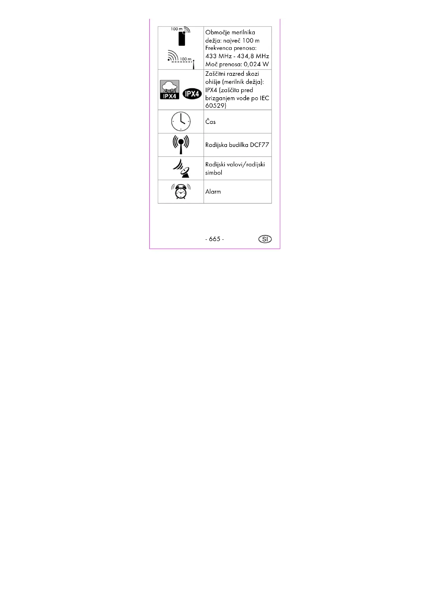 Območje merilnika dežja: največ 100 m Frekvenca prenosa: 433 MHz - 434,8 MHz