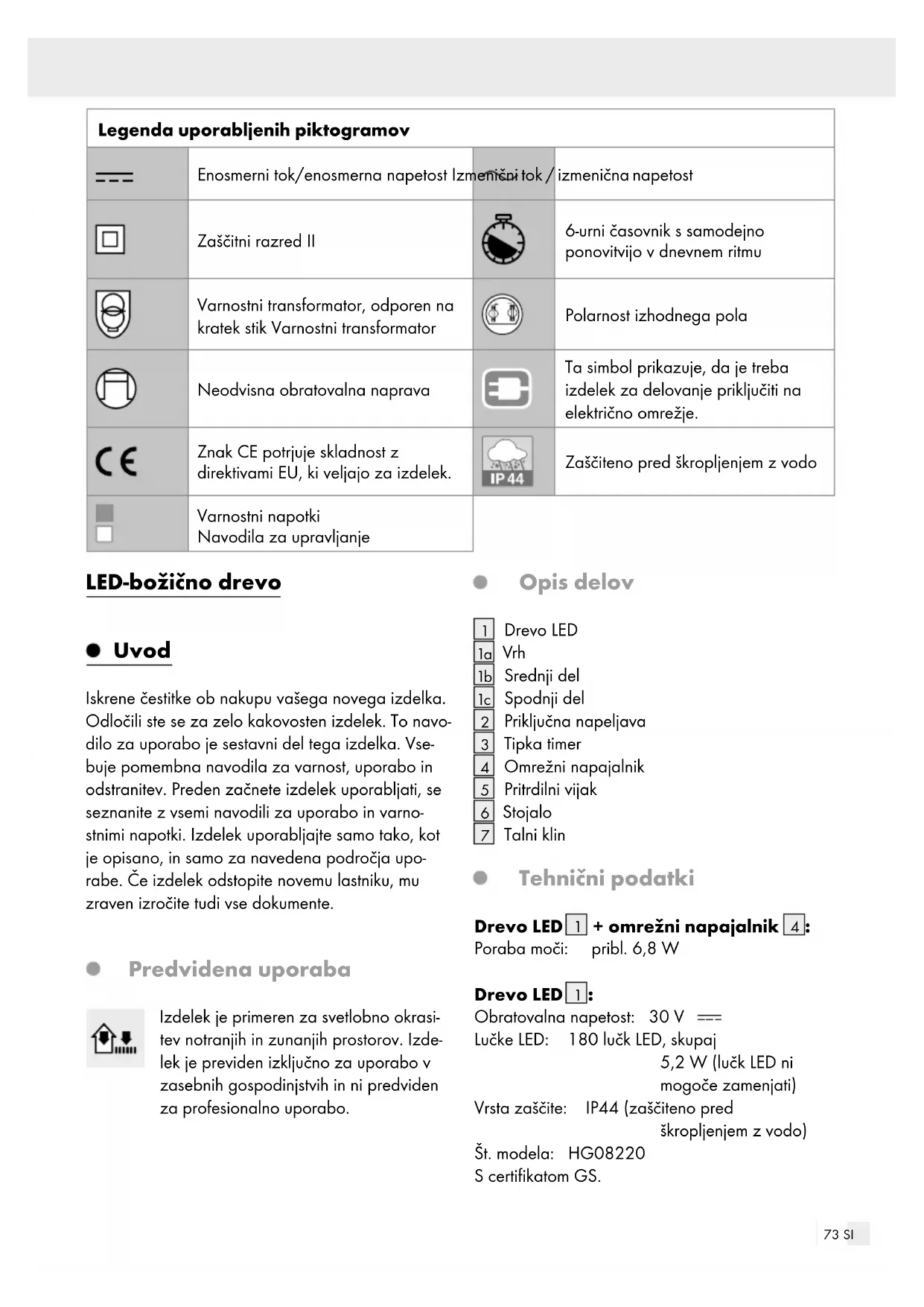 50/60Hz Obratovalna napetost sekundarna: 30 V , 7,2 W Zaščitni razred: Vrsta zaščite: IP44 (zaščiteno pred škropljenjem z vodo) Omrežni napajalnik (št. modela: GP-SW300DC0240T-IP44(EU)) s certifikatom GS. SELV: Zaščitna nizka napetost (Safety extra low voltage) Ta: Največja temperatura okolice Tc: Temperatura ohišja na navedeni točki Obseg dobave 1 drevo LED (1 vrh, 1 srednji del, 1 spodnji del) 1 stojalo 1 omrežni napajalnik 3 pritrdilni vijaki 2 talna klina 1 navodilo za uporabo Varnostni napotki PREDEN ZAČNETE IZDELEK UPORABLJATI, SE SEZNANITE Z VSEMI NAVODILI ZA UPO-
