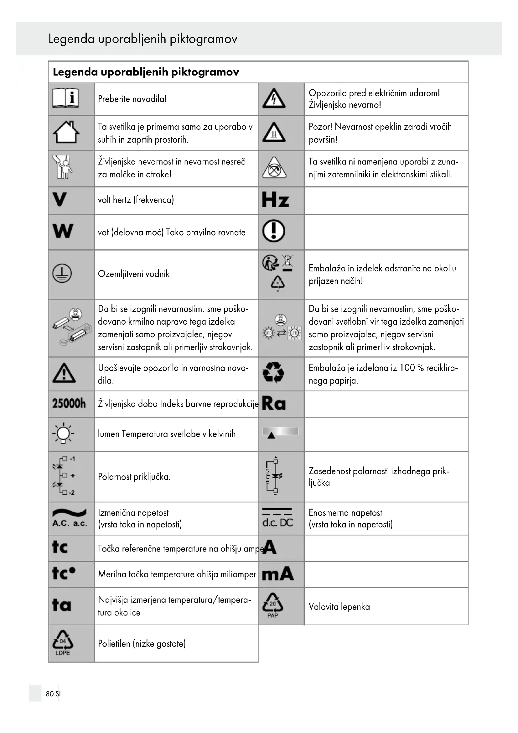 Kazalo SI 79Legenda uporabljenih piktogramov Preberite navodila! Opozorilo pred električnim udarom! Življenjsko nevarno! Ta svetilka je primerna samo za uporabo v suhih in zaprtih prostorih. Pozor! Nevarnost opeklin zaradi vročih površin! Življenjska nevarnost in nevarnost nesreč za malčke in otroke! Ta svetilka ni namenjena uporabi z zuna njimi zatemnilniki in elektronskimi stikali. volt hertz (frekvenca) vat (delovna moč) Tako pravilno ravnate Ozemljitveni vodnik Embalažo in izdelek odstranite na okolju prijazen način! Da bi se izognili nevarnostim, sme poško dovano krmilno napravo tega izdelka zamenjati samo proizvajalec, njegov servisni zastopnik ali primerljiv strokovnjak. Da bi se izognili nevarnostim, sme poško dovani svetlobni vir tega izdelka zamenjati samo proizvajalec, njegov servisni zastopnik ali primerljiv strokovnjak. Upoštevajte opozorila in varnostna navo dila! Embalaža je izdelana iz 100 % reciklira nega papirja. Življenjska doba Indeks barvne reprodukcije lumen Temperatura svetlobe v kelvinih Polarnost priključka. Output Zasedenost polarnosti izhodnega prik ljučka Izmenična napetost (vrsta toka in napetosti) Enosmerna napetost (vrsta toka in napetosti) Točka referenčne temperature na ohišju amper Merilna točka temperature ohišja miliamper Najvišja izmerjena temperatura/tempera tura okolice Valovita lepenka Polietilen (nizke gostote) 80 SI Legenda uporabljenih piktogramovStropna LED-svetilka ● Uvod Čestitamo vam za nakup vašega novega izdelka. Izbrali ste visokokakovosten proizvod. Ta navodila za uporabo preberite v celoti in natančno. Odprite tudi stran s slikami. Ta navodila so del tega izdelka in vsebujejo pomembne informacije o prvi uporabi in ravnanju z njim. Vedno upoštevajte vsa varnostna navodila. Pred prvo uporabo preverite, ali je napajalna napetost pravilna in ali so vsi deli pravilno sestavljeni. Če imate kakršna koli vprašanja ali niste prepričani, kako izdelek uporabljati, se obrnite na svojega prodajalca ali servisno mesto. Ta navodila skrbno shranite in jih po potrebi predajte tretji osebi. ● Predvidena uporaba Ta svetilka je primerna samo za uporabo v suhih in zaprtih prostorih. Svetilko lahko pritr dite na vse običajno vnetljive površine. Izdelek je namenjen izključno uporabi v zasebnih gospodinjstvih in ne za komercialno uporabo. Ta izdelek je namenjen običajni uporabi. ● Vsebina Takoj ko izdelek vzamete iz embalaže, preverite, ali je vsebina dobave popolna in ali je izdelek v neopo rečnem stanju. 1 stropna svetilka LED (model 14167506L) 3 vijaki 3 vložki 2 zaščitni gibki cevi 1 Navodila za montažo in uporabo ● Opis delov