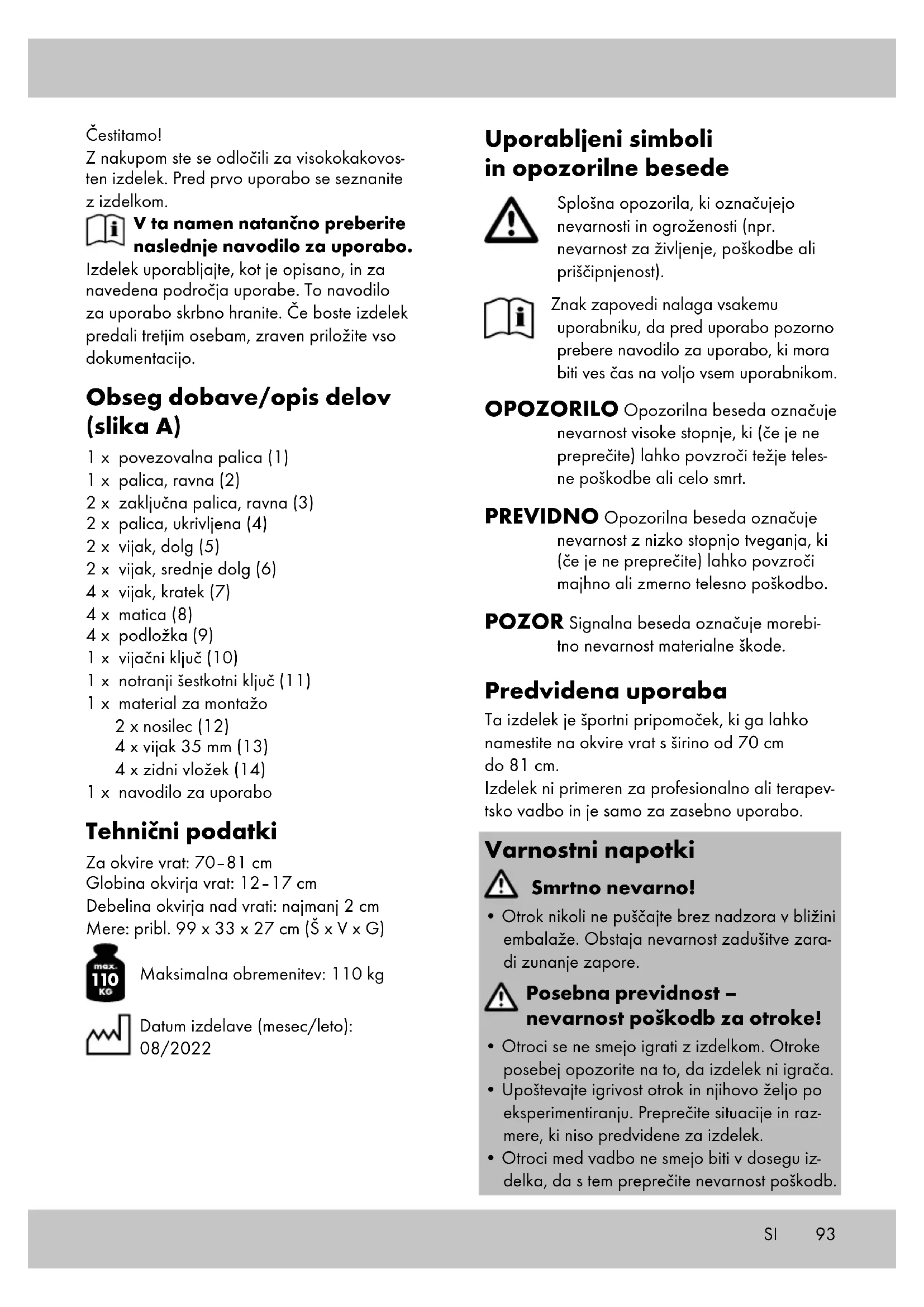 Maksimalna obremenitev: 110 kg Datum izdelave (mesec/leto): 08/2022 Uporabljeni simboli in opozorilne besede Splošna opozorila, ki označujejo nevarnosti in ogroženosti (npr. nevarnost za življenje, poškodbe ali priščipnjenost). Znak zapovedi nalaga vsakemu uporabniku, da pred uporabo pozorno prebere navodilo za uporabo, ki mora biti ves čas na voljo vsem uporabnikom. OPOZORILO Opozorilna beseda označuje nevarnost visoke stopnje, ki (če je ne preprečite) lahko povzroči težje teles- ne poškodbe ali celo smrt. PREVIDNO Opozorilna beseda označuje nevarnost z nizko stopnjo tveganja, ki (če je ne preprečite) lahko povzroči majhno ali zmerno telesno poškodbo. POZOR Signalna beseda označuje morebi- tno nevarnost materialne škode. Predvidena uporaba Ta izdelek je športni pripomoček, ki ga lahko namestite na okvire vrat s širino od 70 cm do 81 cm. Izdelek ni primeren za profesionalno ali terapev- tsko vadbo in je samo za zasebno uporabo. Varnostni napotki Smrtno nevarno!