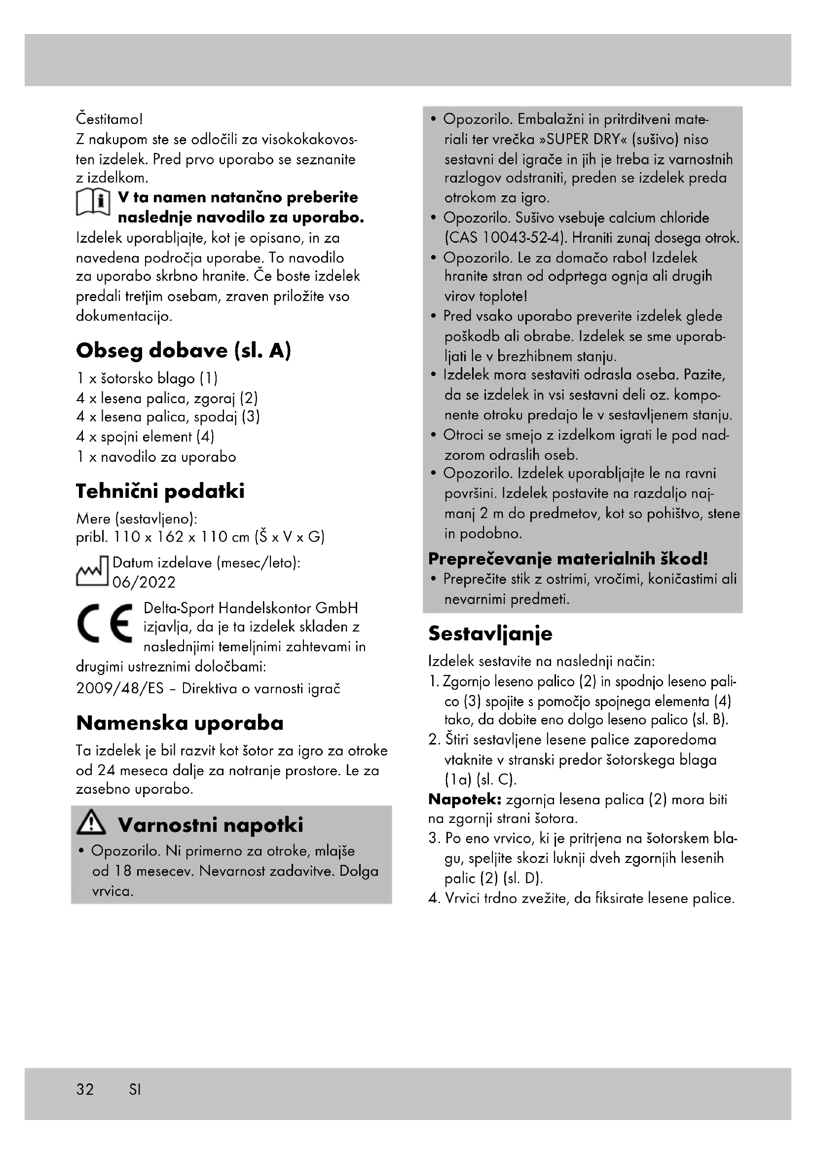 Shranjevanje, čiščenje Če izdelka ne uporabljate, ga shranite na suho, čisto mesto pri sobni temperaturi. POMEMBNO! Nikoli ne čistite z ostrimi čistilni- mi sredstvi. Lesene palice: do čistega obrišite le s suho krpo za čiščenje. Šotorsko blago: le ročno pranje Napotki za odlaganje v smeti Izdelek in embalažne materiale zavrzite v skladu z aktualnimi lokalnimi predpisi. Emba- lažni materiali, npr. folijske vrečke, ne sodijo v roke otrok. Embalažni material shranite otrokom nedosegljivo. Izdelke in embalažo odstranite okolju prijazno. Koda za recikliranje označuje različne materiale za vračanje v reciklirni krog. Vsebuje simbol za recikliranje, ki označu- je reciklirni krog, in številko, ki označuje material. Napotki za garancijo in izvajanje servisne storitve Izdelek je bil izdelan z veliko skrbnostjo in pod stalno kontrolo. DELTA-SPORT HANDELSKON- TOR GmbH zasebnim končnim kupcem od datuma nakupa (garancijskega obdobja) v skladu z naslednjimi določbami odobri triletno garancijo na to postavko. Garancija velja samo za napake v materialu in obdelavi. Garancija ne velja za dele, ki so podvrženi običajni obrabi in jih je zato treba šteti za obrabljive dele (npr. baterije), in za lomljive dele, kot so npr. stikala, akumulatorji ali deli iz stekla. Zahtevki iz te garancije so izključeni, če je bil izdelek uporabljen nepravilno ali pretirano ali če ni bil uporabljen v okviru predvidenega namena ali predvidenega obsega uporabe ali če niso bile upoštevane specifikacije v navodilih za uporabo, razen če končni kupec lahko dokaže, da gre za napako v materialu ali izdelavi, ki ne temelji na eni od zgoraj navedenih okoliščin. Garancijski zahtevki se lahko uveljavljajo le v garancijskem roku ob predložitvi originalnega računa. Zato originalni račun shranite. Garancij- ski čas se zaradi morebitnih popravil na podlagi garancije, zakonskega jamstva ali kulance ne podaljša. To velja tudi za zamenjane in popra- vljene dele. Pri morebitnih reklamacijah se najprej obrnite na spodaj navedeno servisno številko za nujne primere ali stopite z nami v stik po elektronski pošti. Če obstaja garancijski primer, vam bomo izdelek po naši izbiri brezplačno popravili, zamenjali ali pa vam bomo povrnili kupnino. Druge pravice iz garancije ne obstajajo. Ta garancija ne omejuje vaših zakonskih pravic, še posebej garancijskih zahtevkov do prodajal- ca. IAN: 392417_2201 Servis Slovenija Tel.: 080080917 E-Mail: deltasport@lidl.si34 Garancijski list
