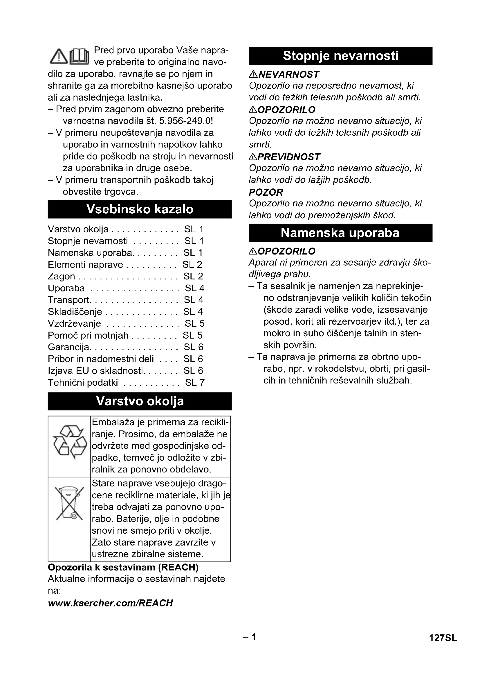 EU 6.649-875.0 10 m 126 CS– 1 Pred prvo uporabo Vaše napra- ve preberite to originalno navo- dilo za uporabo, ravnajte se po njem in shranite ga za morebitno kasnejšo uporabo ali za naslednjega lastnika. – Pred prvim zagonom obvezno preberite varnostna navodila št. 5.956-249.0! – V primeru neupoštevanja navodila za uporabo in varnostnih napotkov lahko pride do poškodb na stroju in nevarnosti za uporabnika in druge osebe. – V primeru transportnih poškodb takoj obvestite trgovca. Opozorila k sestavinam (REACH) Aktualne informacije o sestavinah najdete na: www.kaercher.com/REACH NEVARNOST Opozorilo na neposredno nevarnost, ki vodi do težkih telesnih poškodb ali smrti. 몇 OPOZORILO Opozorilo na možno nevarno situacijo, ki lahko vodi do težkih telesnih poškodb ali smrti. 몇 PREVIDNOST Opozorilo na možno nevarno situacijo, ki lahko vodi do lažjih poškodb. POZOR Opozorilo na možno nevarno situacijo, ki lahko vodi do premoženjskih škod. 몇 OPOZORILO Aparat ni primeren za sesanje zdravju ško- dljivega prahu. – Ta sesalnik je namenjen za neprekinje- no odstranjevanje velikih količin tekočin (škode zaradi velike vode, izsesavanje posod, korit ali rezervoarjev itd.), ter za mokro in suho čiščenje talnih in sten- skih površin. – Ta naprava je primerna za obrtno upo- rabo, npr. v rokodelstvu, obrti, pri gasil- cih in tehničnih reševalnih službah. Vsebinsko kazalo Varstvo okolja . . . . . . . . . . . . . SL 1 Stopnje nevarnosti . . . . . . . . . SL 1 Namenska uporaba. . . . . . . . . SL 1 Elementi naprave . . . . . . . . . . SL 2 Zagon . . . . . . . . . . . . . . . . . . . SL 2 Uporaba . . . . . . . . . . . . . . . . . SL 4 Transport. . . . . . . . . . . . . . . . . SL 4 Skladiščenje . . . . . . . . . . . . . . SL 4 Vzdrževanje . . . . . . . . . . . . . . SL 5 Pomoč pri motnjah . . . . . . . . . SL 5 Garancija. . . . . . . . . . . . . . . . . SL 6 Pribor in nadomestni deli . . . . SL 6 Izjava EU o skladnosti. . . . . . . SL 6 Tehnični podatki . . . . . . . . . . . SL 7 Varstvo okolja Embalaža je primerna za recikli- ranje. Prosimo, da embalaže ne odvržete med gospodinjske od- padke, temveč jo odložite v zbi- ralnik za ponovno obdelavo. Stare naprave vsebujejo drago- cene reciklirne materiale, ki jih je treba odvajati za ponovno upo- rabo. Baterije, olje in podobne snovi ne smejo priti v okolje. Zato stare naprave zavrzite v ustrezne zbiralne sisteme. Stopnje nevarnosti Namenska uporaba 127SL– 2 1 Plovec 2 Omrežni kabel 3 Omrežni vtič naprave 4 Gibka sesalna cev 5 Blokiranje sesalne glave 6 Zbiralnik umazanije 7 Nosilec kabla črpalke za odstranjevanje 8 Zaporna plošča 9 Ročaj krmilnih kolesc 10 Vrtljiva kolesca 11 Šoba za pranje tal 12 Nastavitev višine talne šobe 13 Sesalna cev 14 Sesalni nastavek 15 Sesalna glava 16 Črpalka za odstranjevanje 17 Slepa matica črpalke za odstranjevanje 18 Nosilni ročaj 19 Pokrov filtra 20 Potisno streme 21 Koleno 22 Stikalo s plovcem črpalke za odstranje- vanje 23 Predfilter 24 Omrežni vtič črpalke za odstranjevanje 25 Stikalo „Črpalka za odstranjevanje IZ- KLOP“ 26 Vtičnica 27 Stikalo „Črpalka za odstranjevanje VKLOP“ 28 Glavno stikalo 29 Odzračevalni filter 30 Filter za grobo umazanijo/Ploski nagu- bani filter 31 Gibka izpustna cev 32 Pokrovček (GEKA-C spoj) 33 Kljuka za kabel 34 Tipska tablica Naprava dovoljuje 3 načine obratovanja: 1 Mokro sesanje s črpalko za odstranje- vanje 2 Mokro sesanje brez črpalke za odstra- njevanje 3 Suho sesanje Opozorilo: Mokro sesanje je možno tudi pri izklopljeni ali demontirani črpalki za od- stranjevanje. Demontirajte črpalko za od- stranjevanje, glejte Suho sesanje. Slika Odstranite ščetine. Vstavite gumijaste brisalce. Opozorilo: Strukturirana stran gumijastih nastavkov mora kazati navzven. Slika Deblokirajte in snemite sesalno glavo. Papirnato filtrsko vrečko/flis filtrsko vrečko izvlecite nazaj. Namestite sesalno glavo in jo blokirajte. – Pri sesanju mokre umazanije vedno od- stranite papirnato ali flis filtrsko vrečko. Slika Deblokirajte in snemite sesalno glavo. Odstranite membranski filter. Namestite sesalno glavo in jo blokirajte. – Pri sesanju mokre umazanije vedno od- stranite membranski filter. Odprite pokrov filtra. Izvlecite ploski nagubani filter. Vstavite filter za grobo umazanijo. Zaprite pokrov filtra, ki se mora slišno zaskočiti. Slika Odstranite pokrovček (GEKA-C spoj). Priključite gibko cev za odstranjevanje (nazivna širina 3/4“ ali večja). Slika Umazano vodo izpustite skozi izpustno cev. Elementi naprave Zagon Mokro sesanje Vstavljanje gumijastih brisalcev Odstranjevanje papirnate filtrske vrečke/flis filtrske vrečke Odstranjevanje membranskega filtra Vstavljanje filtra za grobo umazanijo Priključitev gibke cevi za odstranjevanje Izpuščanje umazane vode 128 SL– 3 POZOR Pri sesanju se filtra za grobo umazanijo ni- koli ne sme odstraniti. – Mokro sesanje brez črpalke za odstra- njevanje: Priporočamo uporabo speci- alne filtrske vrečke (za mokro) (glejte fil- trske sisteme). – Pri dosegu maks. nivoja tekočine se na- prava avtomatsko izklopi. – Po končanem mokrem sesanju: Plovec, posodo in po potrebi črpalko za odstra- njevanje očistite z vlažno krpo in jih po- sušite. POZOR Pred suhim sesanjem: Demontirajte črpal- ko za odstranjevanje in vstavite ploski na- gubani filter. Opozorilo: Pri suhem sesanju je potrebno v splošnem uporabljati ploski nagubani filter. POZOR Pri sesanju se ploskega nagubanega filtra nikoli ne sme odstraniti. – Pri sesanju drobnega prahu se lahko do- datno uporabi papirnata filtrska vrečka, flis filtrska vrečka ali membranski filter. Izvlecite omrežni vtič črpalke za odstra- njevanje. Deblokirajte in snemite sesalno glavo. Slika Snemite nosilec kabla črpalke za od- stranjevanje in ga zamenjajte z zaporno ploščo. Predfilter povlecite čez sesalni nasta- vek in ga odstranite. Odvijte slepo matico črpalke za odstra- njevanje. Črpalko za odstranjevanje in pl