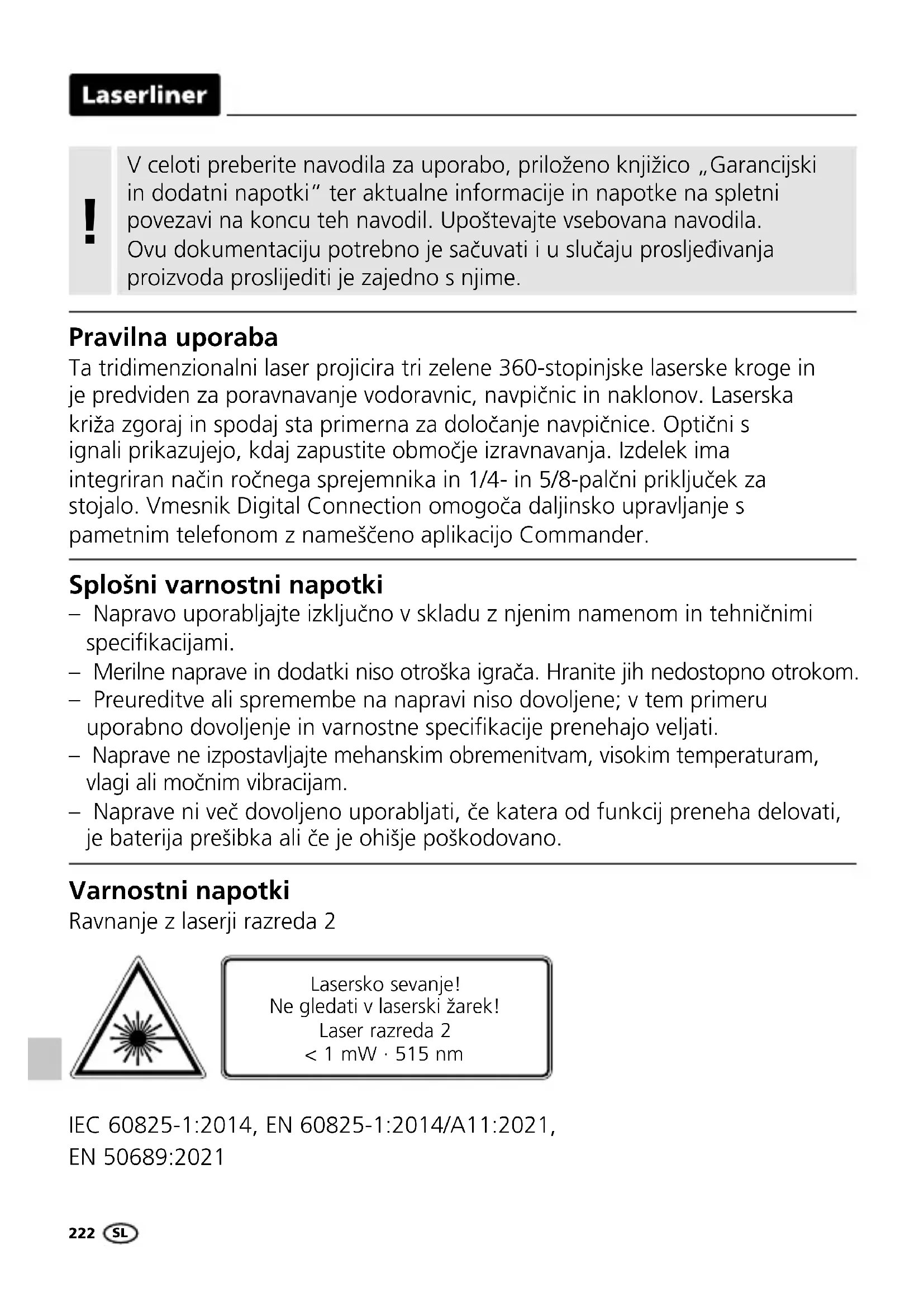 Pravilna uporaba Ta tridimenzionalni laser projicira tri zelene 360-stopinjske laserske kroge in je predviden za poravnavanje vodoravnic, navpičnic in naklonov. Laserska križa zgoraj in spodaj sta primerna za določanje navpičnice. Optični s ignali prikazujejo, kdaj zapustite območje izravnavanja. Izdelek ima integriran način ročnega sprejemnika in 1/4- in 5/8-palčni priključek za stojalo. Vmesnik Digital Connection omogoča daljinsko upravljanje s pametnim telefonom z nameščeno aplikacijo Commander. Splošni varnostni napotki – Napravo uporabljajte izključno v skladu z njenim namenom in tehničnimi specikacijami. – Merilne naprave in dodatki niso otroška igrača. Hranite jih nedostopno otrokom. – Preureditve ali spremembe na napravi niso dovoljene; v tem primeru uporabno dovoljenje in varnostne specikacije prenehajo veljati. – Naprave ne izpostavljajte mehanskim obremenitvam, visokim temperaturam, vlagi ali močnim vibracijam. – Naprave ni več dovoljeno uporabljati, če katera od funkcij preneha delovati, je baterija prešibka ali če je ohišje poškodovano. Varnostni napotki Ravnanje z laserji razreda 2 Lasersko sevanje! Ne gledati v laserski žarek! Laser razreda 2 < 1 mW · 515 nm IEC 60825-1:2014, EN 60825-1:2014/A11:2021, EN 50689:2021CompactPlane-Laser 3G