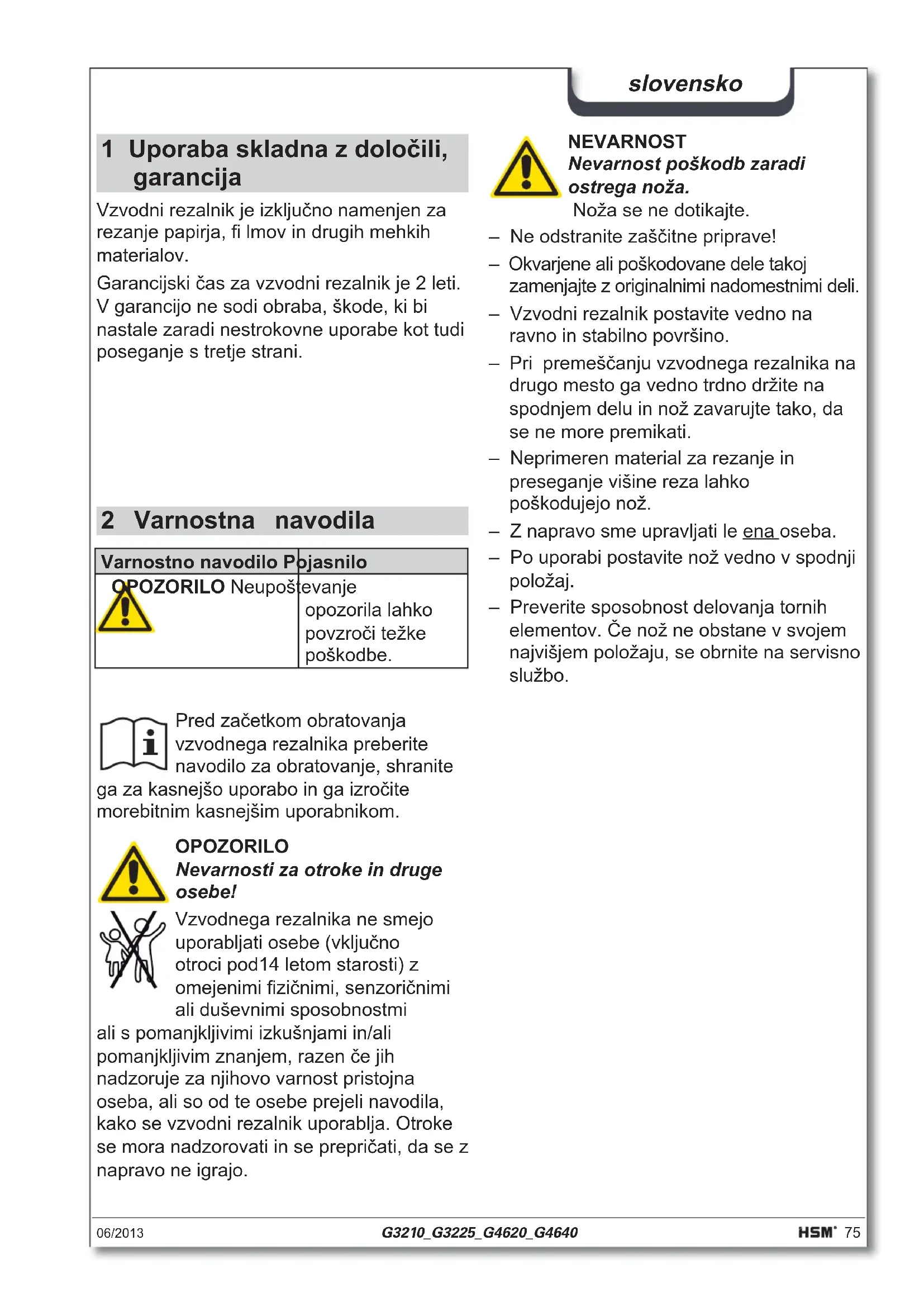 Рабочий стол (мм) 325 x 155 325 x 230 460 x 230 460 x 320 Размеры (мм) 605 x 280 x 75 606 x 308 x 122 737 x 362 x 122 750 x 406 x 133 Вес (кг) 2,12 3,72 4,66 7,30 Указание: Для уменьшения занимаемо- го места при хранении и для фиксации ножа при транспорти- ровке машины можно откинуть щиток. Но это возможно только в том случае, если нож находит- ся в нижнем положении.74 G3210_G3225_G4620_G4640 06/2013 русский06/2013 G3210_G3225_G4620_G4640 75 slovensko 1 Uporaba skladna z določili, garancija Vzvodni rezalnik je izključno namenjen za rezanje papirja, fi lmov in drugih mehkih materialov. Garancijski čas za vzvodni rezalnik je 2 leti. V garancijo ne sodi obraba, škode, ki bi nastale zaradi nestrokovne uporabe kot tudi poseganje s tretje strani. 2 Varnostna navodila Varnostno navodilo Pojasnilo OPOZORILO Neupoštevanje opozorila lahko povzroči težke poškodbe. Pred začetkom obratovanja vzvodnega rezalnika preberite navodilo za obratovanje, shranite ga za kasnejšo uporabo in ga izročite morebitnim kasnejšim uporabnikom. OPOZORILO Nevarnosti za otroke in druge osebe! Vzvodnega rezalnika ne smejo uporabljati osebe (vključno otroci pod14 letom starosti) z omejenimi fi zičnimi, senzoričnimi ali duševnimi sposobnostmi ali s pomanjkljivimi izkušnjami in/ali pomanjkljivim znanjem, razen če jih nadzoruje za njihovo varnost pristojna oseba, ali so od te osebe prejeli navodila, kako se vzvodni rezalnik uporablja. Otroke se mora nadzorovati in se prepričati, da se z napravo ne igrajo. NEVARNOST Nevarnost poškodb zaradi ostrega noža. Noža se ne dotikajte. – Ne odstranite zaščitne priprave! – Okvarjene ali poškodovane dele takoj zamenjajte z originalnimi nadomestnimi deli. – Vzvodni rezalnik postavite vedno na ravno in stabilno površino. – Pri premeščanju vzvodnega rezalnika na drugo mesto ga vedno trdno držite na spodnjem delu in nož zavarujte tako, da se ne more premikati. – Neprimeren material za rezanje in preseganje višine reza lahko poškodujejo nož. – Z napravo sme upravljati le ena oseba. – Po uporabi postavite nož vedno v spodnji položaj. – Preverite sposobnost delovanja tornih elementov. Če nož ne obstane v svojem najvišjem položaju, se obrnite na servisno službo.76 G3210_G3225_G4620_G4640 06/2013 slovensko