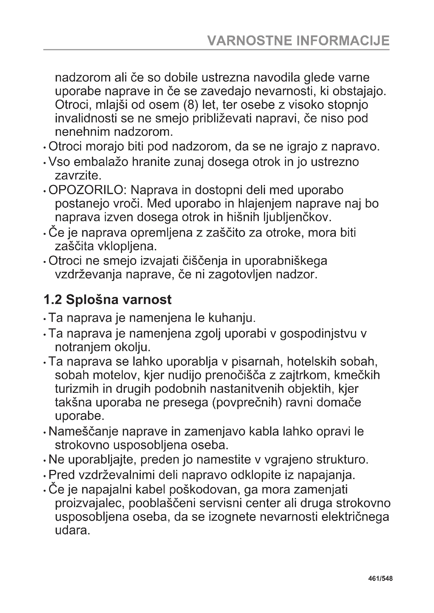 - To napravo lahko otroci od osmega leta naprej ter osebe z zmanjšanimi telesnimi, čutnimi ali razumskimi sposobnostmi ali s pomanjkanjem izkušenj ter znanja uporabljajo le pod 460/548 VARNOSTNE INFORMACIJEnadzorom ali če so dobile ustrezna navodila glede varne uporabe naprave in če se zavedajo nevarnosti, ki obstajajo. Otroci, mlajši od osem (8) let, ter osebe z visoko stopnjo invalidnosti se ne smejo približevati napravi, če niso pod nenehnim nadzorom.