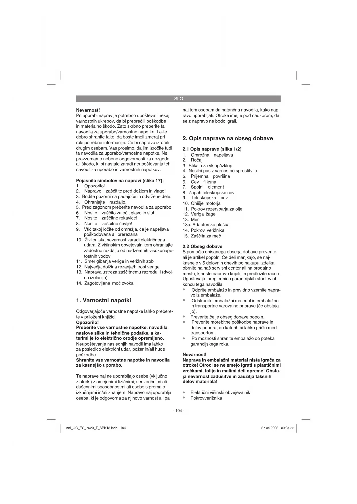 obvejevalnikom Priprava Pred vsako uporabo in pri morebitni poškodbi pre- verite naslednje točke, da lahko varno delate: Stanje električnega višinskega obvejevalnika Pred začetkom dela preglejte ohišje električnega višinskega obvejevalnika verigo in meč verižne žage ter omrežni kabel, ali je morda kaj poškodovano. Nikoli ne delajte z očitno poškodovano napravo. – Nevarnost nesreče! Nevarnost! Varnostnih naprav ni dovoljeno odstraniti ali spreminjati. – Nevarnost nesreče! Ne uporabljajte žage, če varnostne naprave ne delujejo brezhibno. Ne poskušajte sami popraviti varnostno pomembnih zaščitnih naprav, ampak se obrnite na naš servis ali podobno usposoblje- no delavnico. Uporabljajte samo dodatke in nadomestne dele, ki jih je odobril proizvajalec. V nasprotnem pri- meru obstaja nevarnost nesreče ali poškodbe naprave. Posoda za olje Stanje polnosti rezervoarja za olje. Tudi med de- lom preverite, ali je v njem vedno dovolj olja. Žage nikoli ne uporabljajte, če v njej ni olja ali če je stanje olja padlo pod oznako »min«, da preprečite poškodovanje verižne žage. Enkratno polnjenje praviloma zadošča za 15 minut, odvisno od od- morov in obremenitve. Veriga žage Napetost verige žage, stanje rezil. Bolj ko je veriga žage ostra, lažje jo lahko nadzirate in bolj Anl_GC_EC_7520_T_SPK13.indb 107Anl_GC_EC_7520_T_SPK13.indb 107 27.04.2022 09:34:5627.04.2022 09:34:56SLO