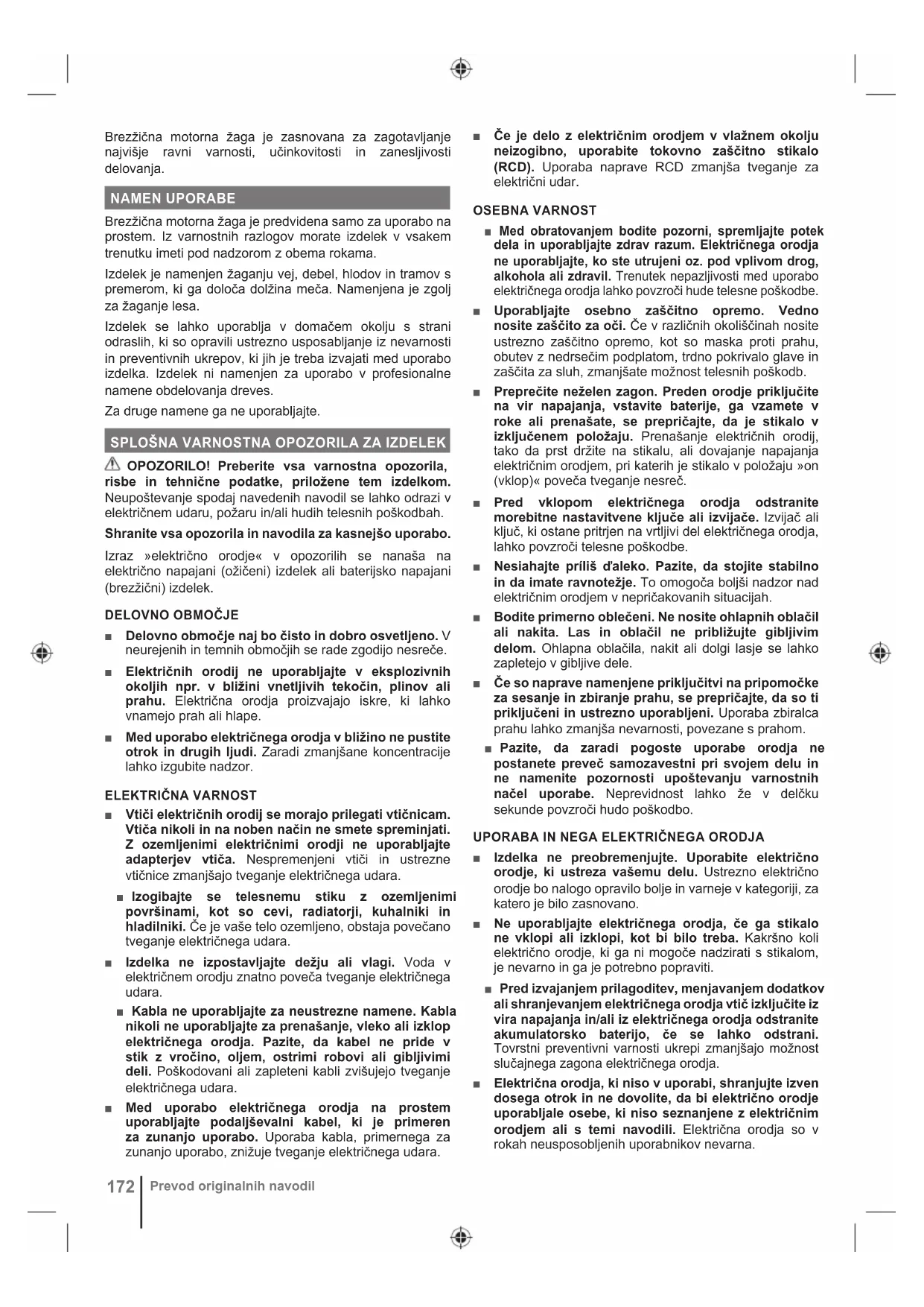 MOTORNO ŽAGO ■ Ko verižna žaga obratuje, se ji ne približujte z nobenim delom telesa. Pred zagonom verižne žage preverite, da se veriga žage ničesar ne dotika. Trenutek nepazljivosti med upravljanjem verižne žage lahko povzroči, da se z oblačili ali s telesom zapletete v verigo žage. ■ Verižno žago vedno držite z desno roko za zadnji ročaj, z levo roko pa za sprednjega. Če verižno žago držite obratno, povečate nevarnost za telesne poškodbe, zato tega nikoli ne storite. ■ Motorno žago držite izključno za izolirana držala, ker se veriga žage lahko dotakne skritih žic ali lastnega kabla. Motorne žage, ki pridejo v stik s kablom pod napetostjo, lahko povzročijo prenos napetosti na kovinske dele motorne žage, zaradi česar uporabnik lahko doživi elektrošok. ■ Nosite zaščito za oči Priporočena je dodatna zaščitna oprema za ušesa, glavo, roke, noge in stopala. Ustrezna zaščitna oprema zmanjša telesne poškodbe zaradi letečega drobirja ali slučajnega stika z motorno žago. ■ Motorne žage ne uporabljajte na drevesu, lestvi, strehi ali nestabilni podpori. Tovrstna uporaba motorne žage lahko povzroči hudo telesno poškodbo. ■ Bodite pozorni na svoje ravnotežje in verižno žago uporabljajte le, kadar stojite na trdni, varni in ravni površini. Spolzke ali nestabilne površine lahko povzročijo izgubo ravnotežja ali nadzora nad motorno žago. ■ Ko žagate napeto vejo, pazite na možnost povratnega udarca. Ko napetost lesenih vlaken popusti, lahko napeta veja udari delavca in/ali povzroči, da verižna žaga ni več pod nadzorom. ■ Pri rezanju grmičevja in mladega drevja bodite še posebej previdni. Tanek material se lahko zaplete v verigo žage in vas lahko udari ali vrže iz ravnotežja. ■ Verižno žago nosite le, ko je izključena, in sicer tako, da jo držite za sprednji ročaj ter proč od telesa. Med transportom ali skladiščenjem verižne žage vedno namestite pokrov za meč žage. Pravilno ravnanje z verižno žago bo zmanjšalo možnost nenamernega kontakta s premikajočo se verigo žage. ■ Upoštevajte navodila za mazanje, napenjanje verige in menjavo palice ter verige. Neustrezno napeta ali namazana veriga se lahko strga, ali pa poveča možnost odsunka. ■ Žagajte samo les. Verižne žage ne uporabljajte za neprimerne namene. Na primer: motorne žage ne uporabljajte za žaganje kovine, plastike, betona ali gradbenega materiala, ki ni iz lesa. Če boste verižno žago uporabljali za neustrezne namene, lahko pride do nevarnih situacij. ■ Ne poskušajte podirati dreves, dokler ne razumete tveganj in načinov za izogibanje tveganjem. Med podiranjem dreves se lahko uporabnik ali opazovalci hudo telesno poškodujejo. ■ Pri čiščenju zagozdenega materiala, shranjevanju ali servisiranju motorne žage upoštevajte vsa navodila. Poskrbite, da je stikalo izklopljeno in baterijski vložek odstranjen. Nepričakovana sprožitev motorne žage med čiščenjem zagozdenega materiala ali servisiranjem lahko povzroči hudo telesno poškodbo.174 Prevod originalnih navodil VZROKI ODSUNKOV IN NJIHOVO PREPREČEVANJE: Če se konica meča dotakne predmeta ali če se zapre les in se verižna žaga zagozdi v rezu, lahko pride do odsunka. Dotik s konico lahko v nekaterih primerih povzroči sunkovito povratno reakcijo, tako da meč sune navzgor in nazaj proti upravljavcu. Če verigo žage na zgornjem delu žaginega lista stisnete, žagin list lahko hitro sune nazaj proti uporabniku. Vsaka od teh reakcij lahko povzroči izgubo nadzora nad žago, posledica tega pa so lahko težke telesne poškodbe. Ne zanašajte se izključno na varnostne naprave, vgrajene v žago. Kot uporabnik žage morate izvesti več ukrepov, da pri žaganju ne bi prihajalo do nesreč ali poškodb. Povratni udar je posledica zlorabe in/ali nepravilnih postopkov uporabe ali pogojev, ki se jih lahko prepreči z ustreznimi previdnostnimi ukrepi, ki so navedeni spodaj: ■ Ohranite čvrst oprijem, tako da s palcem in ostalimi prsti objamete ročaj verižne žage, pri tem pa žago držite z obema rokama in svoje telo ter roke imejte v takem položaju, da boste pripravljeni na morebitne sile odsunkov. Sile odsunkov lahko upravljavec nadzoruje, če upošteva ustrezne varnostne ukrepe. Verižne žage ne izpustite iz rok. ■ Ne iztegujte se preveč in ne žagajte nad višino ramen. S tem pomagate preprečiti nenameren dotik konice in omogočite boljši nadzor nad verižno žago v nepričakovanih situacijah. ■ Uporabljajte le nadomestna vodila in verige, ki jih priporoča proizvajalec. Nepravilna nadomestitev vodil in verig lahko povzroči pretrganje in/ali povratni udarec verige. ■ Upoštevajte navodila proizvajalca glede brušenja in vzdrževanja verige žage. Zmanjšanje višine merilnika globine lahko povzroči več odsunkov.