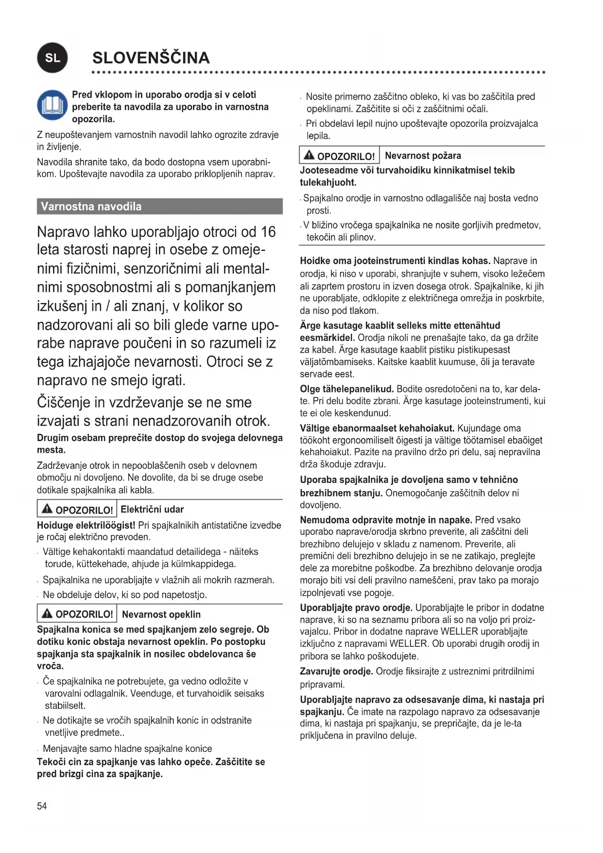 rabe naprave poučeni in so razumeli iz tega izhajajoče nevarnosti. Otroci se z napravo ne smejo igrati. Čiščenje in vzdrževanje se ne sme izvajati s strani nenadzorovanih otrok. Drugim osebam preprečite dostop do svojega delovnega mesta. Zadrževanje otrok in nepooblaščenih oseb v delovnem območju ni dovoljeno. Ne dovolite, da bi se druge osebe dotikale spajkalnika ali kabla. OPOZORILO! Električni udar Hoiduge elektrilöögist! Pri spajkalnikih antistatične izvedbe je ročaj električno prevoden.