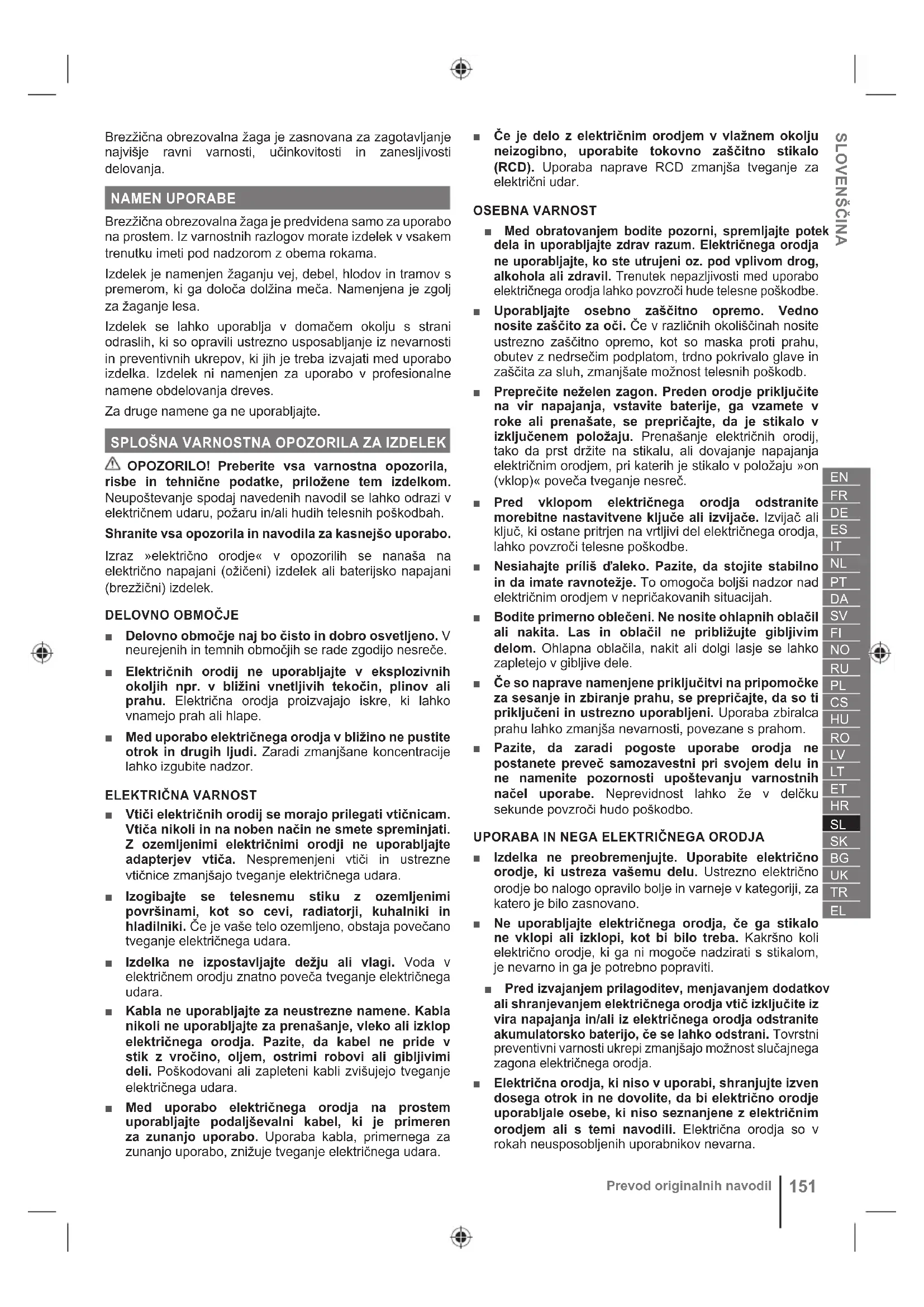 OBREZOVALNO ŽAGO ■ Med delovanjem obrezovalne žage ne približujte delov telesa verigi žage. Pred zagonom obrezovalne žage se prepričajte, da veriga žage ni v stiku z nobenim predmetom. Trenutek nezbranosti med uporabo obrezovalnih žag lahko povzroči, da se vaša oblačila ali telo zataknejo v verigo žage. ■ Z eno roko vedno držite zadnji ročaj obrezovalne žage, z drugo pa sprednji ročaj. ■ Obrezovalno žago držite izključno za izolirana držala, ker se veriga žage lahko dotakne skritih žic. Motorne žage, ki pridejo v stik s kablom pod napetostjo, lahko povzročijo prenos napetosti na kovinske dele obrezovalne žage, zaradi česar uporabnik lahko doživi elektrošok. ■ Nosite zaščito za oči Priporočena je dodatna zaščitna oprema za ušesa, glavo, roke, noge in stopala. Ustrezna zaščitna oprema zmanjša telesne poškodbe zaradi letečega drobirja ali slučajnega stika z motorno žago. ■ Obrezovalne žage ne uporabljajte na drevesu, lestvi, strehi ali nestabilni podpori. Tovrstna uporaba obrezovalne žage lahko povzroči hudo telesno poškodbo. ■ Vedno stabilno stojte in obrezovalno žago uporabljajte le, ko stojite na nepremični, zanesljivi in ravni površini. Spolzke ali nestabilne površine lahko povzročijo izgubo ravnotežja ali nadzora nad obrezovalno žago. ■ Ko žagate napeto vejo, pazite na možnost povratnega udarca. Po sprostitvi napetosti lesenih vlaken lahko napeta veja dari uporabnika in/ali povzroči izgubo nadzora nad obrezovalno žago. ■ Pri rezanju grmičevja in mladega drevja bodite še posebej previdni. Tanek material se lahko zaplete v verigo žage in vas lahko udari ali vrže iz ravnotežja. ■ Obrezovalno žago prenašajte tako, da jo držite za zadnji ročaj, pri čemer je obrezovalna žaga izklopljena in usmerjena stran od vašega telesa. Med prenašanjem ali shranjevanjem obrezovalne žage vedno namestite pokrov vodilne palice. Ustrezno ravnanje z obrezovalno žago zmanjša verjetnost nenamernega stika s premikajočo se verigo žage. ■ Upoštevajte navodila za mazanje, napenjanje verige in menjavo palice ter verige. Neustrezno napeta ali namazana veriga se lahko strga, ali pa poveča možnost odsunka. ■ Žagajte samo les. Obrezovalne žage ne uporabljajte za namene, za katere ni predvidena. Na primer: obrezovalne žage ne uporabljajte za žaganje kovine, plastike, betona ali gradbenega materiala, ki ni iz lesa. Uporaba obrezovalne žage za namene, ki so drugačni od predvidenih, lahko povzroči nevarno situacijo. ■ Ta obrezovalna žaga ni namenjena podiranju dreves. Če obrezovalno žago uporabljate za nepredvidene namene, se lahko uporabnik ali opazovalci hudo telesno poškodujejo. ■ Pri čiščenju zagozdenega materiala, shranjevanju ali servisiranju obrezovalne žage upoštevajte vsa navodila. Poskrbite, da je stikalo izklopljeno in baterijski vložek odstranjen. Nepričakovana sprožitev obrezovalne žage med čiščenjem zagozdenega materiala ali servisiranjem lahko povzroči hudo telesno poškodbo.SLOVENŠČINA