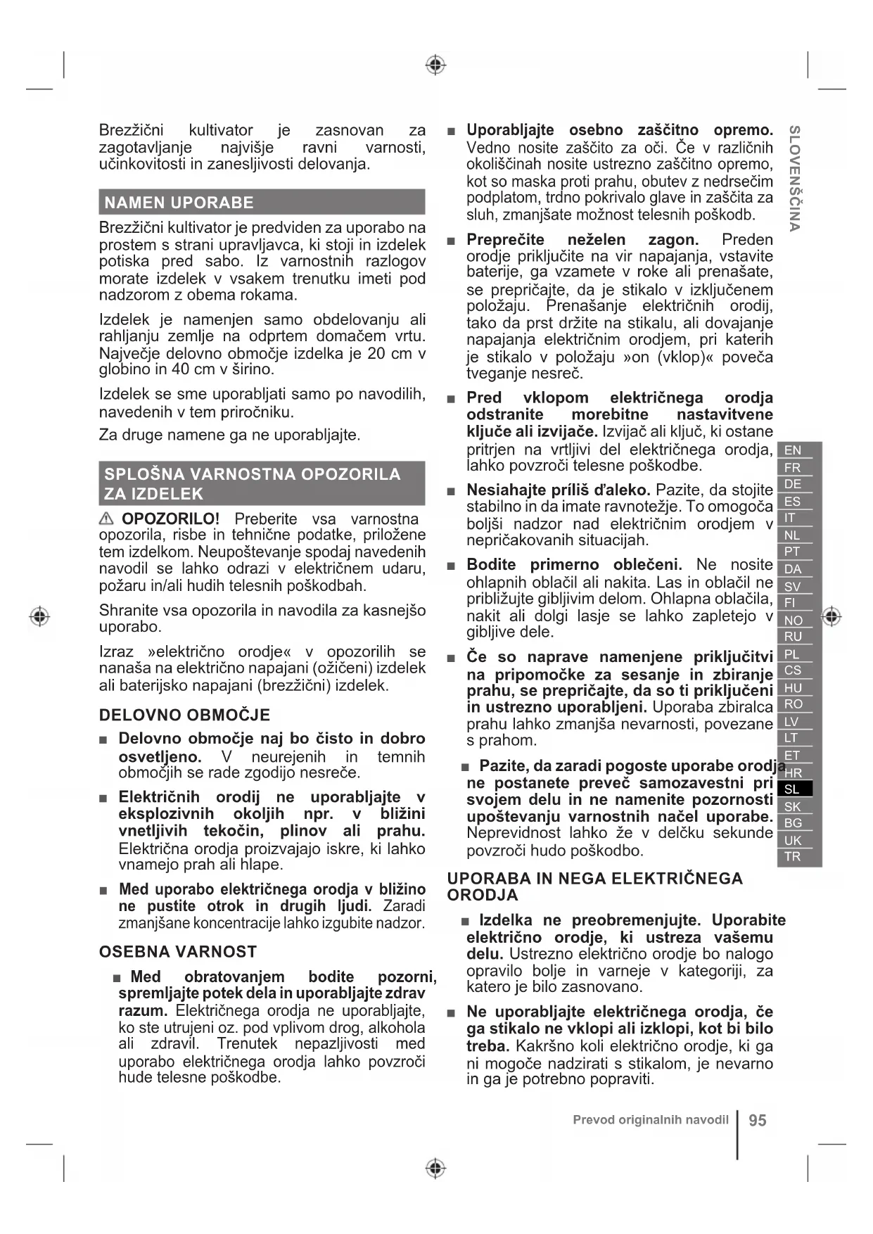 Brezžični kultivator je zasnovan za zagotavljanje najvišje ravni varnosti, učinkovitosti in zanesljivosti delovanja. NAMEN UPORABE Brezžični kultivator je predviden za uporabo na prostem s strani upravljavca, ki stoji in izdelek potiska pred sabo. Iz varnostnih razlogov morate izdelek v vsakem trenutku imeti pod nadzorom z obema rokama. Izdelek je namenjen samo obdelovanju ali rahljanju zemlje na odprtem domačem vrtu. Največje delovno območje izdelka je 20 cm v globino in 40 cm v širino. Izdelek se sme uporabljati samo po navodilih, navedenih v tem priročniku. Za druge namene ga ne uporabljajte.