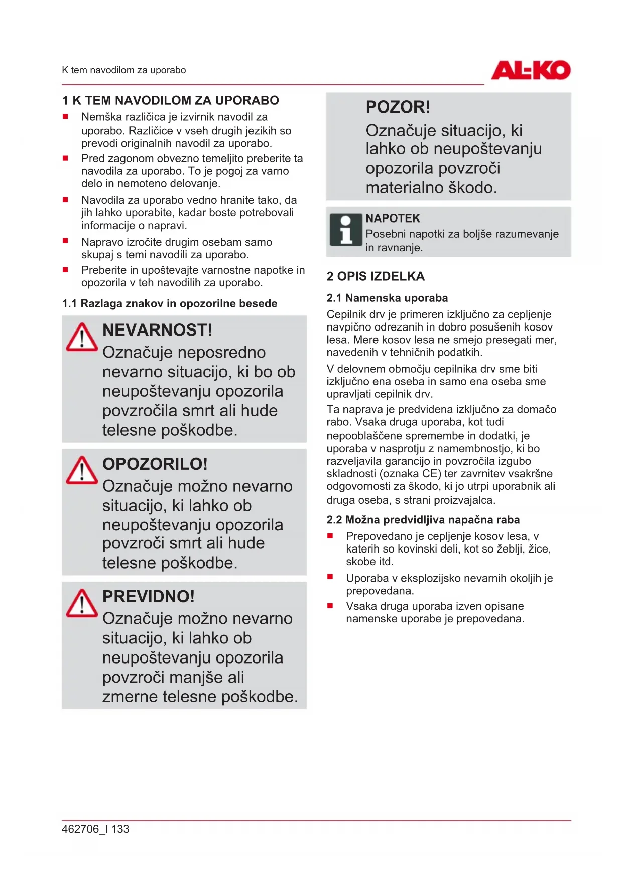 Naprave nikoli ne uporabljajte z obrabljenimi ali okvarjenimi deli. Okvarjene dele vedno nadomestite z originalnimi nadomestnimi deli proizvajalca. Če napravo uporabljate z obrabljenimi ali okvarjenimi deli, zoper proizvajalca ni mogoče uveljavljati nobenih garancijskih zahtevkov. NAPOTEK Popravila smejo izvajati samo strokovne delavnice ali naše servisne delavnice AL-KO.