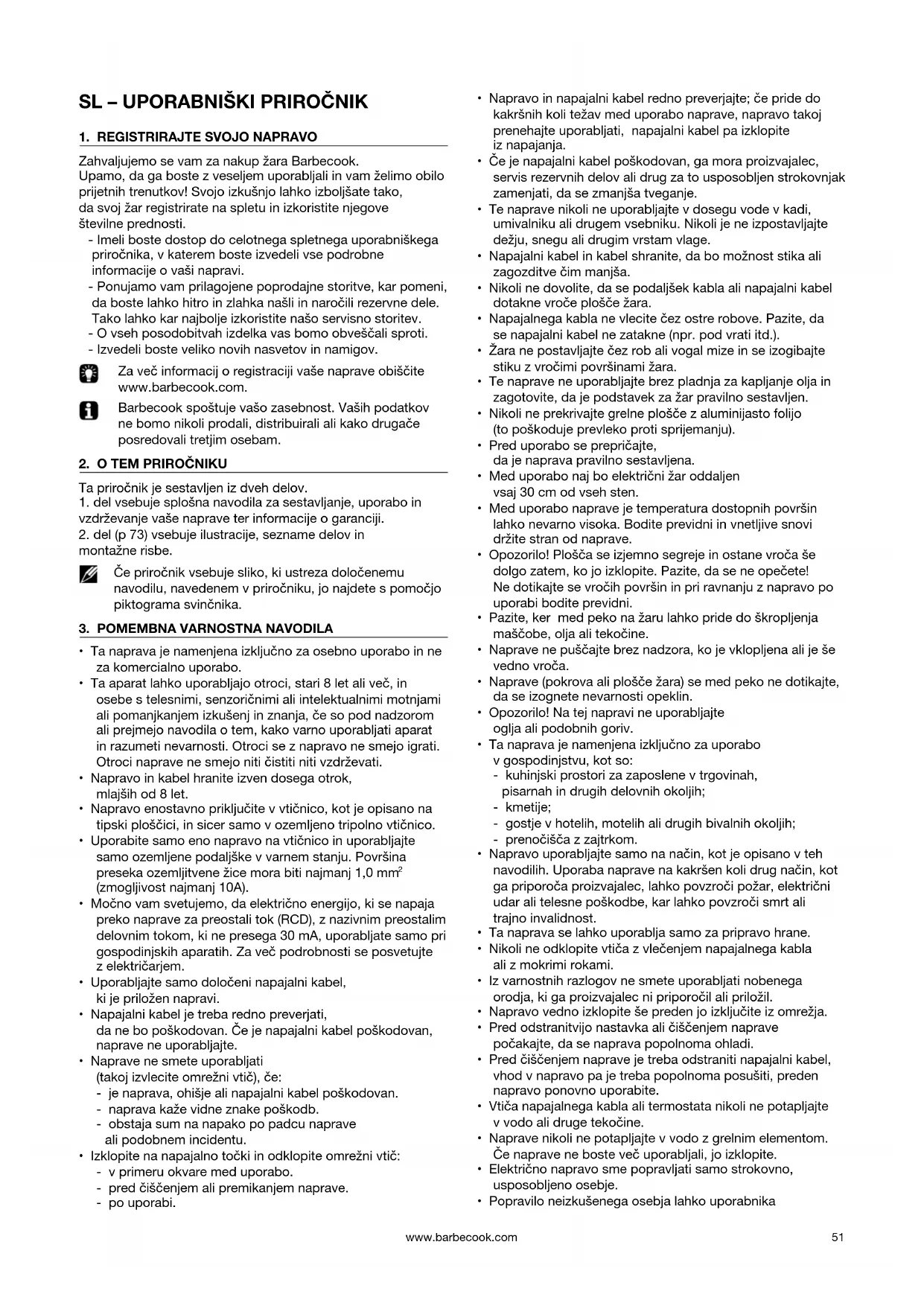 Zahvaljujemo se vam za nakup žara Barbecook. Upamo, da ga boste z veseljem uporabljali in vam želimo obilo prijetnih trenutkov! Svojo izkušnjo lahko izboljšate tako, da svoj žar registrirate na spletu in izkoristite njegove številne prednosti. - Imeli boste dostop do celotnega spletnega uporabniškega priročnika, v katerem boste izvedeli vse podrobne informacije o vaši napravi. - Ponujamo vam prilagojene poprodajne storitve, kar pomeni, da boste lahko hitro in zlahka našli in naročili rezervne dele. Tako lahko kar najbolje izkoristite našo servisno storitev. - O vseh posodobitvah izdelka vas bomo obveščali sproti. - Izvedeli boste veliko novih nasvetov in namigov. Za več informacij o registraciji vaše naprave obiščite www.barbecook.com. Barbecook spoštuje vašo zasebnost. Vaših podatkov ne bomo nikoli prodali, distribuirali ali kako drugače posredovali tretjim osebam.