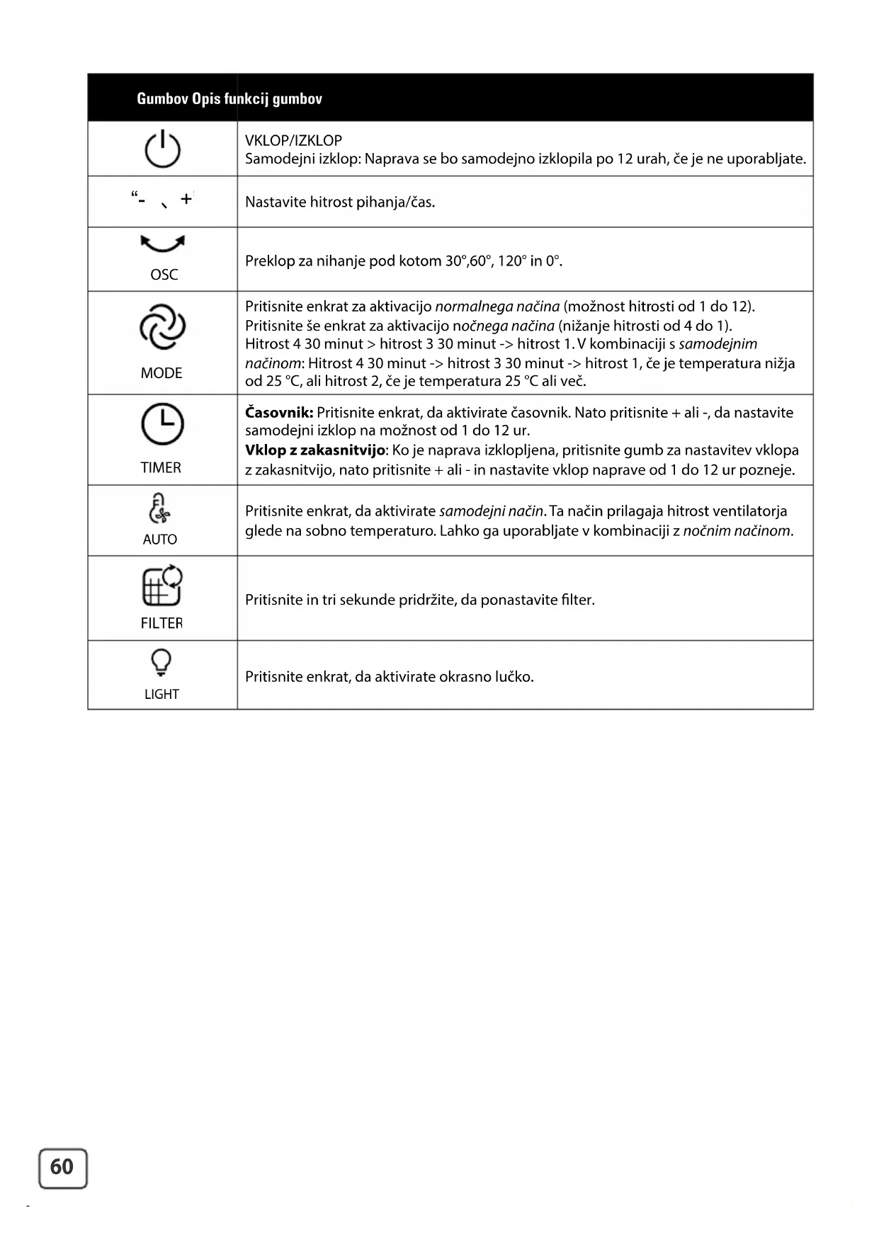 Nastavite hitrost pihanja/čas. OSC Preklop za nihanje pod kotom 30°,60°, 120° in 0°. MODE Pritisnite enkrat za aktivacijo normalnega načina (možnost hitrosti od 1 do 12). Pritisnite še enkrat za aktivacijo nočnega načina (nižanje hitrosti od 4 do 1). Hitrost 4 30 minut > hitrost 3 30 minut -> hitrost 1. V kombinaciji s samodejnim načinom: Hitrost 4 30 minut -> hitrost 3 30 minut -> hitrost 1, če je temperatura nižja od 25 °C, ali hitrost 2, če je temperatura 25 °C ali več. TIMER Časovnik: Pritisnite enkrat, da aktivirate časovnik. Nato pritisnite + ali -, da nastavite samodejni izklop na možnost od 1 do 12 ur. Vklop z zakasnitvijo: Ko je naprava izklopljena, pritisnite gumb za nastavitev vklopa z zakasnitvijo, nato pritisnite + ali - in nastavite vklop naprave od 1 do 12 ur pozneje. AUTO Pritisnite enkrat, da aktivirate samodejni način. Ta način prilagaja hitrost ventilatorja glede na sobno temperaturo. Lahko ga uporabljate v kombinaciji z nočnim načinom. FILTER Pritisnite in tri sekunde pridržite, da ponastavite lter. LIGHT Pritisnite enkrat, da aktivirate okrasno lučko.SL